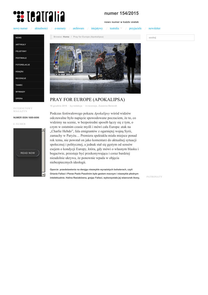 numer 154/2015 nowy numer w każdy piątek nowy numer aktualności NEWS e-numery archiwum inicjatywy teatralia przyjaciele Browse: Home / Pray for Europe (Apokalipsa) newsletter szukaj ARTYKUŁY FELIETONY FESTIWALE FOTORELACJE KSIĄŻKI RECENZJE TANIEC WYWIADY OPERA PRAY FOR EUROPE (APOKALIPSA) 16 grudnia 2015 · b y r edakcja · i n r ecenzje, Zuzanna Berendt INTERNETOWY MAGAZYN NUMER ISSN 1689-6696 E-NUMER READ NOW Podczas festiwalowego pokazu Apokalipsy wśród widzów odczuwalne było napięcie spowodowane poczuciem, że to, co widzimy na scenie, w bezpośredni sposób łączy się z tym, o czym w ostatnim czasie myśli i mówi cała Europa: atak na „Charlie Hebdo”, fala emigrantów z ogarniętej wojną Syrii, zamachy w Paryżu… Premiera spektaklu miała miejsce ponad rok temu, nie powstał on jako komentarz do aktualnej sytuacji społecznej i politycznej, a jednak stał się gęstym od sensów esejem o kondycji Europy, która, gdy mówi o własnym blasku i bogactwie, przestaje być przekonywująca i coraz bardziej nieudolnie ukrywa, że ponownie wpada w objęcia niebezpiecznych ideologii. Oparcie przedstawienia na dwojgu niezwykle wyrazistych bohaterach, czyli Orianie Fallaci i Pierze Paolo Pasolinim było gestem mocnym i niezwykle płodnym intelektualnie. Halina Rasiakówna, grając Fallaci, wykorzystała jej wizerunek ikony, PATRONATY „ostatniej Europejki”. W spektaklu portret sławnej włoskiej dziennikarki dopełniany jest raczej aurą luksusu, klasy, uwielbienia kultury europejskiej i poczucia, że jest godna nazywać się jej częścią. Nie ma tutaj Fallaci-autorki Wściekłości i dumy, wieszczącej Europie śmierć z rąk muzułmańskich ekstremistów, oskarżanej przez środowiska lewicowe o rasizm bezwzględnej krytyczki polityki wielokulturowej. Ideologiczny ciężar jej postaci tkwi właśnie w tej wielkiej miłości do Botticellego, drogich kapeluszy i rozmów z wielkimi ludźmi. Niebezpiecznie łatwo dałoby się z niej zrobić symbol tych, którzy zewsząd wypatrują zagrożenia kultury europejskiej, tworzonej przez białych ludzi i opartej na wartościach chrześcijańskich lub, minimalnie, humanistycznych. Bohaterka grana przez Rasiakównę jest subtelna, urocza, elokwentna. Nikomu nie przyszłoby do głowy traktować jej na równi z prawicowymi szczekaczkami wzywającymi do mordowania muzułmanów. Odwrotnie Borczuch i autor tekstu Tomasz Śpiewak potraktowali postać Pasoliniego (Krzysztof Zarzecki), z którego ust słowo „faszyzm” pada po wielokroć, nie wydaje się jednak nadużywane. Nazywanie rzeczy i zjawisk po imieniu jest dla włoskiego reżysera kluczem do uświadomienia społeczeństwu, że ideologia i retoryka Mussoliniego i Hitlera ma ogromną szansę powtórnie zawładnąć zbiorową wyobraźnią. Ta świetna rola Zarzeckiego w konstrukcji znacząco różni się od pozostałych. Pasolini jest przeciwieństwem Fallaci, która jawi się prawie jak uwieczniona na świetnie skomponowanej i wykonanej fotografii portretowej. Ekspresja mowy i ciała Zarzeckiego jest znacznie większa. Pierwsza scena spektaklu to rekonstrukcja ostatniego wywiadu Pasoliniego. Dzień po jego udzieleniu brutalnie skatowane, martwe ciało reżysera zostało znalezione na plaży w Ostii. W tej scenie Zarzecki wykłada dziennikarzowi swoje racje, mowę wspiera wyrazistym gestem, chodzi po scenie, trzaska okiennicami, siada, potem wstaje, ponownie zaczyna chodzić po scenie… Miota się, jakby mimo ciągłego tłumaczenia czuł się niezrozumiany, a jednocześnie przeczuwał, że na jego szyi zaciska się pętla, która wkrótce pozbawi go i możliwości wypowiadania się, i życia. Inscenizacja nie pozostaje jednak retorycznym sporem między dwojgiem bohaterów. W kilku obrazach, oddziałujących szczególnie mocno swoją wizualną konstrukcją i osadzeniem we współczesnym kontekście medialnym, Borczuch zawarł atak na społeczeństwo konsumujące bez oporu obrazy klęsk głodu, wojen, politycznych kryzysów i hipnotyczne piękno końca świata. W spektaklu Nowego Teatru znajdujemy obraz apokalipsy podobny do tego, jaki w Melancholii przedstawił Lars von Trier. Dobrze wiemy, że zbliża się koniec świata, ale dotkliwie uświadamiamy sobie własną bezsilność, oczekujemy więc go w ciszy. Epizod z filmu von Triera, w której dwie bohaterki i chłopiec siedzą na małym kocu rozłożonym na trawie, nad głową mają jedynie „szałas” z trzech patyków, a po ciemnym niebie płynie w kierunku Ziemi wielka rozżarzona planeta Melancholia, powraca jako powidok w scenie odwołującej się do słynnego zdjęcia Kevina Cartera, który sfotografował sępa czekającego na śmierć wycieńczonej z głodu sudańskiej dziewczynki. Carter (Jacek Poniedziałek), Sęp (Piotr Polak) i Dziewczynka (Marta Ojrzyńska) siedzą na kocu na pustej scenie i rozmawiają o tym, co powinien zrobić fotograf. Czy powinien podnieść dziecko i zanieść je do obozu? Adoptować je? Powstrzymać się od naciśnięcia spustu migawki? Sęp i Dziewczynka przypuszczają atak na Cartera, który próbuje się bronić, ale jego racje wydają się co najmniej błahe. Ta fotografia opublikowana w „New York Timesie” poruszyła serca tysięcy ludzi na całym świecie. Borczuch rozmontowuje zdjęcie, aranżuje wyobrażoną sytuację między fotografem, sępem i dziewczynką i mówi, że nic z tego poruszenia nie wyniknęło. Drugim wymownym epizodem był wywiad pracownika jednego z obozów dla uchodźców (Piotr Polak) z uciekinierem z kraju ogarniętego wojną, który jednak na scenie nie pojawia się osobiście. Jego głos wydobywa się z wąskiej łódeczki skleconej z desek połączonych taśmą, wypakowanej siatkami, w których zapewne znajduje się cały dobytek Asama Bosama. Pracownik szczelnie ubrany w kombinezon i rękawice (ostrożność jest najważniejsza) pokazuje uchodźcy zdjęcia Koloseum, Narodzin Wenus Botticellego, Damy z łasiczką… Asam nie rozpoznaje dzieł sztuki. Nie w