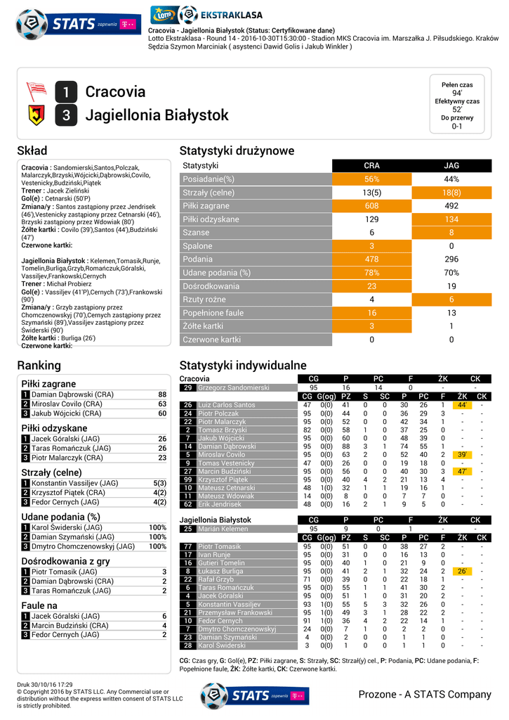Cracovia - Jagiellonia Białystok (Status: Certyfikowane dane) Lotto Ekstraklasa - Round 14 - 2016-10-30T15:30:00 - Stadion MKS Cracovia im. Marszałka J. Piłsudskiego. Kraków Sędzia Szymon Marciniak ( asystenci Dawid Golis i Jakub Winkler ) Pełen czas Cracovia 3 Jagiellonia Białystok 1 Skład 94' Efektywny czas 52' Do przerwy 0-1 Statystyki drużynowe Cracovia : Sandomierski,Santos,Polczak, Statystyki CRA JAG Malarczyk,Brzyski,Wójcicki,Dąbrowski,Covilo, Vestenicky,Budziński,Piątek Trener : Jacek Zieliński Gol(e) : Cetnarski (50'P) Zmiana/y : Santos zastąpiony przez Jendrisek (46'),Vestenicky zastąpiony przez Cetnarski (46'), Brzyski zastąpiony przez Wdowiak (80') Żółte kartki : Covilo (39'),Santos (44'),Budziński (47') Posiadanie(%) 56% 44% Strzały (celne) 13(5) 18(8) Piłki zagrane 608 492 Piłki odzyskane 129 134 Szanse 6 8 Czerwone kartki: Spalone 3 0 Jagiellonia Białystok : Kelemen,Tomasik,Runje, Podania 478 296 Tomelin,Burliga,Grzyb,Romańczuk,Góralski, Vassiljev,Frankowski,Cernych Trener : Michał Probierz Gol(e) : Vassiljev (41'P),Cernych (73'),Frankowski (90') Zmiana/y : Grzyb zastąpiony przez Chomczenowskyj (70'),Cernych zastąpiony przez Szymański (89'),Vassiljev zastąpiony przez Świderski (90') Żółte kartki : Burliga (26') Udane podania (%) 78% 70% Dośrodkowania 23 19 Rzuty rożne 4 6 Popełnione faule 16 13 Żółte kartki 3 1 Czerwone kartki 0 0 Czerwone kartki: Ranking Statystyki indywidualne Cracovia Piłki zagrane 1 Damian Dąbrowski (CRA) 2 Miroslav Covilo (CRA) 3 Jakub Wójcicki (CRA) 29 Grzegorz Sandomierski 88 63 60 26 24 22 2 7 14 5 9 27 99 10 11 62 Piłki odzyskane 1 Jacek Góralski (JAG) 2 Taras Romańczuk (JAG) 3 Piotr Malarczyk (CRA) 26 26 23 Strzały (celne) 1 Konstantin Vassiljev (JAG) 2 Krzysztof Piątek (CRA) 3 Fedor Cernych (JAG) 5(3) 4(2) 4(2) Udane podania (%) 1 Karol Świderski (JAG) 2 Damian Szymański (JAG) 3 Dmytro Chomczenowskyj (JAG) 100% 100% 100% PC F ŻK 16 14 0 - SC P PC F ŻK CK 47 95 95 82 95 95 95 47 95 95 48 14 48 0 0 0 1 0 3 2 0 0 4 1 0 2 0 0 0 0 0 1 0 0 0 2 1 0 1 30 36 42 37 48 74 52 19 40 21 19 7 9 26 29 34 25 39 55 40 18 30 13 16 7 5 1 3 1 0 0 1 2 0 3 4 1 0 0 44' 39' 47' - - 0(0) 0(0) 0(0) 0(0) 0(0) 0(0) 0(0) 0(0) 0(0) 0(0) 1(0) 0(0) 0(0) 41 44 52 58 60 88 63 26 56 40 32 8 16 P PC F ŻK 95 9 0 1 - 3 2 2 6 4 2 Piotr Tomasik Ivan Runje Gutieri Tomelin Łukasz Burliga Rafał Grzyb Taras Romańczuk Jacek Góralski Konstantin Vassiljev Przemysław Frankowski Fedor Cernych Dmytro Chomczenowskyj Damian Szymański Karol Świderski - S CG 77 17 16 8 22 6 4 5 21 10 7 23 28 CK CG G(og) PZ 25 Marián Kelemen Faule na 1 Jacek Góralski (JAG) 2 Marcin Budziński (CRA) 3 Fedor Cernych (JAG) P 95 Jagiellonia Białystok Dośrodkowania z gry 1 Piotr Tomasik (JAG) 2 Damian Dąbrowski (CRA) 3 Taras Romańczuk (JAG) Luiz Carlos Santos Piotr Polczak Piotr Malarczyk Tomasz Brzyski Jakub Wójcicki Damian Dąbrowski Miroslav Covilo Tomas Vestenicky Marcin Budziński Krzysztof Piątek Mateusz Cetnarski Mateusz Wdowiak Erik Jendrisek CG CK - CG G(og) PZ S SC P PC F ŻK CK 95 95 95 95 71 95 95 93 95 91 24 4 3 0 0 1 2 0 1 1 5 3 4 1 0 0 0 0 0 1 0 1 0 3 1 2 0 0 0 38 16 21 32 22 41 31 32 28 22 2 1 1 27 13 9 24 18 30 20 26 22 14 2 1 1 2 0 0 2 1 2 2 0 2 1 0 0 0 26' - - 0(0) 0(0) 0(0) 0(0) 0(0) 0(0) 0(0) 1(0) 1(0) 1(0) 0(0) 0(0) 0(0) 51 31 40 41 39 55 51 55 49 36 7 2 1 CG: Czas gry, G: Gol(e), PZ: Piłki zagrane, S: Strzały, SC: Strzał(y) cel., P: Podania, PC: Udane podania, F: Popełnione faule, ŻK: Żółte kartki, CK: Czerwone kartki. Druk 30/10/16 17:29 © Copyright 2016 by STATS LLC. Any Commercial use or distribution without the express written consent of STATS LLC is strictly prohibited. Prozone - A STATS Company Cracovia - Jagiellonia Białystok (Status: Certyfikowane dane) Lotto Ekstraklasa - Round 14 - 2016-10-30T15:30:00 - Stadion MKS Cracovia im. Marszałka J. Piłsudskiego. Kraków Sędzia Szymon Marciniak ( asystenci Dawid Golis i Jakub Winkler ) Linia czasu meczu CRA - Średnia pozycja z piłką JAG Wydarzenia: G:Gol(e), B:Żółte kartki, SO:Czerwone kartki, S:Zmiana/ y. CRA JAG H1 99 10 27 2 5 21 8 22 7 514 26 9 77 4 6 16 24 17 22 B 26 Burliga 25 29 Strefa strzałów 39 Covilo B G 41 Vassiljev CRA 44 Santos B 0 0 3 0 5 1 0 7 1 2 JAG H2 46 Vestenicky by Cetnarski S 47 Budziński B 5 50 Cetnarski G 7 Strzały z pola karnego 8 Strzały z pola karnego Strzały z dystansu 5 Strzały z dystansu 11 7 Balans ofensywny CRA S 70 Grzyb by Chomczenowskyj Lewa Środek Prawa Lewa Środek Prawa 26% 24% 50% 34% 15% 51% 16 G 73 Cernych JAG 15 31 23 10 35 80 Brzyski by Wdowiak S Dośrodkowania z gry (celne %) CRA JAG S 89 Cernych by Szymański G 90 Frankowski S 90 Vassiljev by Świderski Lewa Prawa Lewa Prawa 0% 24% 22% 50% 6 Druk 30/10/16 17:29 © Copyright 2016 by STATS LLC. Any Commercial use or distribution without the express written consent of STATS LLC is strictly prohibited. 17 9 10 Prozone - A STATS Company Cracovia - Jagiellonia Białystok (Status: Certyfikowane dane) Lotto Ekstraklasa - Round 14 - 2016-10-30T15:30:00 - Stadion MKS Cracovia im. Marszałka J. Piłsudskiego. Kraków Sędzia Szymon Marciniak ( asystenci Dawid Golis i Jakub Winkler ) Posiadanie według kwadransów 0'-15' 15'-30' 30'-45' 45'-60' 60'-75' 75'-90' Cracovia 59% 54% 50% 58% 59% 57% Jagiellonia Białystok 41% 46% 50% 42% 41% 43% Długość dystrybucji Kierunek gry CRA 54% CRA JAG Podań do przodu Podań do przodu 44% 39% 44% 193 Podania 123 Podania Podania w poprzek Podania w poprzek 7% 0m-17m 17m-34m +34m 42% 104 Podania Podania do tyłu Podania do tyłu 60 Podania 55 Podania JAG 50% 36% 188 Podania 14% 36% 20% 14% 0m-17m 17m-34m +34m Piłki wygrane wg stref CRA Druk 30/10/16 17:29 © Copyright 2016 by STATS LLC. Any Commercial use or distribution without the express written consent of STATS LLC is strictly prohibited. JAG 27 24 31 34 26 30 21 27 7 10 6 15 Prozone - A STATS Company