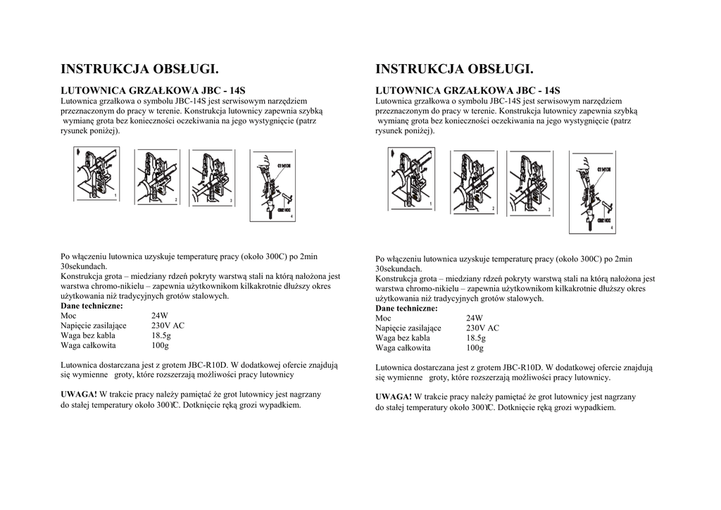 INSTRUKCJA OBSŁUGI. INSTRUKCJA OBSŁUGI. LUTOWNICA GRZAŁKOWA JBC - 14S LUTOWNICA GRZAŁKOWA JBC - 14S Lutownica grzałkowa o symbolu JBC-14S jest serwisowym narzędziem przeznaczonym do pracy w terenie. Konstrukcja lutownicy zapewnia szybką wymianę grota bez konieczności oczekiwania na jego wystygnięcie (patrz rysunek poniżej). Lutownica grzałkowa o symbolu JBC-14S jest serwisowym narzędziem przeznaczonym do pracy w terenie. Konstrukcja lutownicy zapewnia szybką wymianę grota bez konieczności oczekiwania na jego wystygnięcie (patrz rysunek poniżej). Po włączeniu lutownica uzyskuje temperaturę pracy (około 300C) po 2min 30sekundach. Konstrukcja grota – miedziany rdzeń pokryty warstwą stali na którą nałożona jest warstwa chromo-nikielu – zapewnia użytkownikom kilkakrotnie dłuższy okres użytkowania niż tradycyjnych grotów stalowych. Dane techniczne: Moc 24W Napięcie zasilające 230V AC Waga bez kabla 18.5g Waga całkowita 100g Po włączeniu lutownica uzyskuje temperaturę pracy (około 300C) po 2min 30sekundach. Konstrukcja grota – miedziany rdzeń pokryty warstwą stali na którą nałożona jest warstwa chromo-nikielu – zapewnia użytkownikom kilkakrotnie dłuższy okres użytkowania niż tradycyjnych grotów stalowych. Dane techniczne: Moc 24W Napięcie zasilające 230V AC Waga bez kabla 18.5g Waga całkowita 100g Lutownica dostarczana jest z grotem JBC-R10D. W dodatkowej ofercie znajdują się wymienne groty, które rozszerzają możliwości pracy lutownicy Lutownica dostarczana jest z grotem JBC-R10D. W dodatkowej ofercie znajdują się wymienne groty, które rozszerzają możliwości pracy lutownicy. UWAGA! W trakcie pracy należy pamiętać że grot lutownicy jest nagrzany do stałej temperatury około 300°C. Dotknięcie ręką grozi wypadkiem. UWAGA! W trakcie pracy należy pamiętać że grot lutownicy jest nagrzany do stałej temperatury około 300°C. Dotknięcie ręką grozi wypadkiem. Wymienne groty do lutownicy JBC-14S. Wymienne groty do lutownicy JBC-14S. INSTRUKCJA OBSŁUGI. INSTRUKCJA OBSŁUGI. LUTOWNICA GRZAŁKOWA JBC - 30S LUTOWNICA GRZAŁKOWA JBC - 30S Lutownica grzałkowa o symbolu JBC-30S jest serwisowym narzędziem przeznaczonym do pracy w terenie. Konstrukcja lutownicy zapewnia szybką wymianę grota bez konieczności oczekiwania na jego wystygnięcie (patrz rysunek poniżej). Lutownica grzałkowa o symbolu JBC-30S jest serwisowym narzędziem przeznaczonym do pracy w terenie. Konstrukcja lutownicy zapewnia szybką wymianę grota bez konieczności oczekiwania na jego wystygnięcie (patrz rysunek poniżej). Po włączeniu lutownica uzyskuje temperaturę pracy (około 300C) po 2min 15sekundach. Konstrukcja grota – miedziany rdzeń pokryty warstwą stali na którą nałożona jest warstwa chromo-nikielu – zapewnia użytkownikom kilkakrotnie dłuższy okres użytkowania niż tradycyjnych grotów stalowych. Dane techniczne: Moc 25W Napięcie zasilające 230V AC Waga bez kabla 40.0g Waga całkowita 120g Lutownica dostarczana jest z grotem JBC-R10D. W dodatkowej ofercie znajdują się wymienne groty, które rozszerzają możliwości pracy lutownicy. UWAGA! W trakcie pracy należy pamiętać że grot lutownicy jest nagrzany do stałej temperatury około 300°C. Dotknięcie ręką grozi wypadkiem. Po włączeniu lutownica uzyskuje temperaturę pracy (około 300C) po 2min 15sekundach. Konstrukcja grota – miedziany rdzeń pokryty warstwą stali na którą nałożona jest warstwa chromo-nikielu – zapewnia użytkownikom kilkakrotnie dłuższy okres użytkowania niż tradycyjnych grotów stalowych. Dane techniczne: Moc 25W Napięcie zasilające 230V AC Waga bez kabla 40.0g Waga całkowita 120g Lutownica dostarczana jest z grotem JBC-R10D. W dodatkowej ofercie znajdują się wymienne groty, które rozszerzają możliwości pracy lutownicy. UWAGA! W trakcie pracy należy pamiętać że grot lutownicy jest nagrzany do stałej temperatury około 300°C. Dotknięcie ręką grozi wypadkiem. Wymienne groty do lutownicy JBC-30S. Wymienne groty do lutownicy JBC-30S. INSTRUKCJA OBSŁUGI. INSTRUKCJA OBSŁUGI. LUTOWNICA GRZAŁKOWA JBC - 65S LUTOWNICA GRZAŁKOWA JBC - 65S Lutownica grzałkowa o symbolu JBC-65S jest serwisowym narzędziem przeznaczonym do pracy w terenie. Konstrukcja lutownicy zapewnia szybką wymianę grota bez konieczności oczekiwania na jego wystygnięcie (patrz rysunek poniżej). Lutownica grzałkowa o symbolu JBC-65S jest serwisowym narzędziem przeznaczonym do pracy w terenie. Konstrukcja lutownicy zapewnia szybką wymianę grota bez konieczności oczekiwania na jego wystygnięcie (patrz rysunek poniżej). Po włączeniu lutownica uzyskuje temperaturę pracy (około 300C) po 2min 15sekundach. Konstrukcja grota – miedziany rdzeń pokryty warstwą stali na którą nałożona jest warstwa chromo-nikielu – zapewnia użytkownikom kilkakrotnie dłuższy okres użytkowania niż tradycyjnych grotów stalowych. Dane techniczne: Moc 32W Napięcie zasilające 230V AC Waga bez kabla 40.0g Waga całkowita 120g Po włączeniu lutownica uzyskuje temperaturę pracy (około 300C) po 2min 15sekundach. Konstrukcja grota – miedziany rdzeń pokryty warstwą stali na którą nałożona jest warstwa chromo-nikielu – zapewnia użytkownikom kilkakrotnie dłuższy okres użytkowania niż tradycyjnych grotów stalowych. Dane techniczne: Moc 32W Napięcie zasilające 230V AC Waga bez kabla 40.0g Waga całkowita 120g Lutownica dostarczana jest z grotem JBC-R10D. W dodatkowej ofercie znajdują się wymienne groty, które rozszerzają możliwości pracy lutownicy. Lutownica dostarczana jest z grotem JBC-R10D. W dodatkowej ofercie znajdują się wymienne groty, które rozszerzają możliwości pracy lutownicy. UWAGA! W trakcie pracy należy pamiętać że grot lutownicy jest nagrzany do stałej temperatury około 300°C. Dotknięcie ręką grozi wypadkiem. UWAGA! W trakcie pracy należy pamiętać że grot lutownicy jest nagrzany do stałej temper