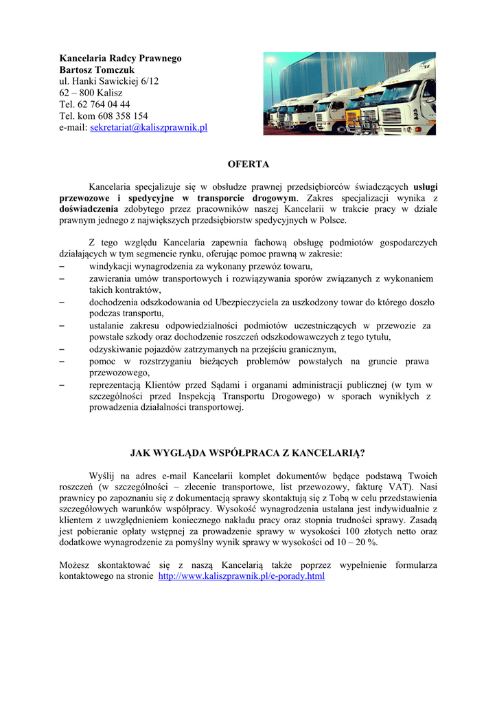 Kancelaria Radcy Prawnego Bartosz Tomczuk ul. Hanki Sawickiej 6/12 62 – 800 Kalisz Tel. 62 764 04 44 Tel. kom 608 358 154 e-mail: [email protected] OFERTA Kancelaria specjalizuje się w obsłudze prawnej przedsiębiorców świadczących usługi przewozowe i spedycyjne w transporcie drogowym. Zakres specjalizacji wynika z doświadczenia zdobytego przez pracowników naszej Kancelarii w trakcie pracy w dziale prawnym jednego z największych przedsiębiorstw spedycyjnych w Polsce. Z tego względu Kancelaria zapewnia fachową obsługę podmiotów gospodarczych działających w tym segmencie rynku, oferując pomoc prawną w zakresie: – windykacji wynagrodzenia za wykonany przewóz towaru, – zawierania umów transportowych i rozwiązywania sporów związanych z wykonaniem takich kontraktów, – dochodzenia odszkodowania od Ubezpieczyciela za uszkodzony towar do którego doszło podczas transportu, – ustalanie zakresu odpowiedzialności podmiotów uczestniczących w przewozie za powstałe szkody oraz dochodzenie roszczeń odszkodowawczych z tego tytułu, – odzyskiwanie pojazdów zatrzymanych na przejściu granicznym, – pomoc w rozstrzyganiu bieżących problemów powstałych na gruncie prawa przewozowego, – reprezentacją Klientów przed Sądami i organami administracji publicznej (w tym w szczególności przed Inspekcją Transportu Drogowego) w sporach wynikłych z prowadzenia działalności transportowej. JAK WYGLĄDA WSPÓŁPRACA Z KANCELARIĄ? Wyślij na adres e-mail Kancelarii komplet dokumentów będące podstawą Twoich roszczeń (w szczególności – zlecenie transportowe, list przewozowy, fakturę VAT). Nasi prawnicy po zapoznaniu się z dokumentacją sprawy skontaktują się z Tobą w celu przedstawienia szczegółowych warunków współpracy. Wysokość wynagrodzenia ustalana jest indywidualnie z klientem z uwzględnieniem koniecznego nakładu pracy oraz stopnia trudności sprawy. Zasadą jest pobieranie opłaty wstępnej za prowadzenie sprawy w wysokości 100 złotych netto oraz dodatkowe wynagrodzenie za pomyślny wynik sprawy w wysokości od 10 – 20 %. Możesz skontaktować się z naszą Kancelarią także poprzez wypełnienie formularza kontaktowego na stronie http://www.kaliszprawnik.pl/e-porady.html