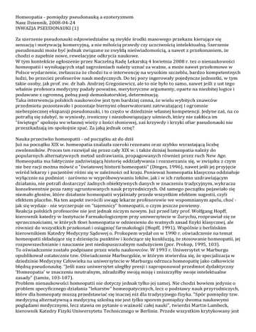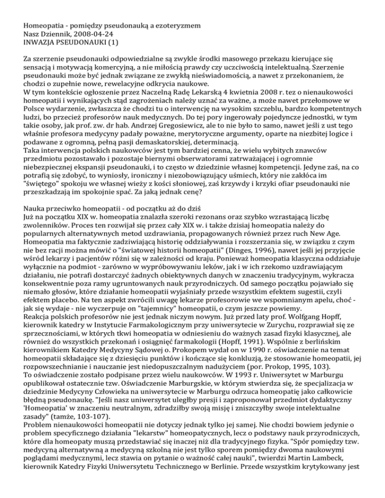 Homeopatia - pomiędzy pseudonauką a ezoteryzmem Nasz Dziennik, 2008-04-24 INWAZJA PSEUDONAUKI (1) Za szerzenie pseudonauki odpowiedzialne są zwykle środki masowego przekazu kierujące się sensacją i motywacją komercyjną, a nie miłością prawdy czy uczciwością intelektualną. Szerzenie pseudonauki może być jednak związane ze zwykłą nieświadomością, a nawet z przekonaniem, że chodzi o zupełnie nowe, rewelacyjne odkrycia naukowe. W tym kontekście ogłoszenie przez Naczelną Radę Lekarską 4 kwietnia 2008 r. tez o nienaukowości homeopatii i wynikających stąd zagrożeniach należy uznać za ważne, a może nawet przełomowe w Polsce wydarzenie, zwłaszcza że chodzi tu o interwencję na wysokim szczeblu, bardzo kompetentnych ludzi, bo przecież profesorów nauk medycznych. Do tej pory ingerowały pojedyncze jednostki, w tym takie osoby, jak prof. zw. dr hab. Andrzej Gregosiewicz, ale to nie było to samo, nawet jeśli z ust tego właśnie profesora medycyny padały poważne, merytoryczne argumenty, oparte na niezbitej logice i podawane z ogromną, pełną pasji demaskatorskiej, determinacją. Taka interwencja polskich naukowców jest tym bardziej cenna, że wielu wybitych znawców przedmiotu pozostawało i pozostaje biernymi obserwatorami zatrważającej i ogromnie niebezpiecznej ekspansji pseudonauki, i to często w dziedzinie własnej kompetencji. Jedyne zaś, na co potrafią się zdobyć, to wyniosły, ironiczny i niezobowiązujący uśmiech, który nie zakłóca im "świętego" spokoju we własnej wieży z kości słoniowej, zaś krzywdy i krzyki ofiar pseudonauki nie przeszkadzają im spokojnie spać. Za jaką jednak cenę? Nauka przeciwko homeopatii - od początku aż do dziś Już na początku XIX w. homeopatia znalazła szeroki rezonans oraz szybko wzrastającą liczbę zwolenników. Proces ten rozwijał się przez cały XIX w. i także dzisiaj homeopatia należy do popularnych alternatywnych metod uzdrawiania, propagowanych również przez ruch New Age. Homeopatia ma faktycznie zadziwiającą historię oddziaływania i rozszerzania się, w związku z czym nie bez racji można mówić o "światowej historii homeopatii" (Dinges, 1996), nawet jeśli jej przyjęcie wśród lekarzy i pacjentów różni się w zależności od kraju. Ponieważ homeopatia klasyczna oddziałuje wyłącznie na podmiot - zarówno w wypróbowywaniu leków, jak i w ich rzekomo uzdrawiającym działaniu, nie potrafi dostarczyć żadnych obiektywnych danych w znaczeniu tradycyjnym, wykracza konsekwentnie poza ramy ugruntowanych nauk przyrodniczych. Od samego początku pojawiało się niemało głosów, które działanie homeopatii wyjaśniały przede wszystkim efektem sugestii, czyli efektem placebo. Na ten aspekt zwrócili uwagę lekarze profesorowie we wspomnianym apelu, choć jak się wydaje - nie wyczerpuje on "tajemnicy" homeopatii, o czym jeszcze powiemy. Reakcja polskich profesorów nie jest jednak niczym nowym. Już przed laty prof. Wolfgang Hopff, kierownik katedry w Instytucie Farmakologicznym przy uniwersytecie w Zurychu, rozprawiał się ze sprzecznościami, w których tkwi homeopatia w odniesieniu do ważnych zasad fizyki klasycznej, ale również do wszystkich przekonań i osiągnięć farmakologii (Hopff, 1991). Wspólnie z berlińskim kierownikiem Katedry Medycyny Sądowej o. Prokopem wydał on w 1990 r. oświadczenie na temat homeopatii składające się z dziesięciu punktów i kończące się konkluzją, że stosowanie homeopatii, jej rozpowszechnianie i nauczanie jest niedopuszczalnym nadużyciem (por. Prokop, 1995, 103). To oświadczenie zostało podpisane przez wielu naukowców. W 1993 r. Uniwersytet w Marburgu opublikował ostatecznie tzw. Oświadczenie Marburgskie, w którym stwierdza się, że specjalizacja w dziedzinie Medycyny Człowieka na uniwersytecie w Marburgu odrzuca homeopatię jako całkowicie błędną pseudonaukę. "Jeśli nasz uniwersytet uległby presji i zaproponował przedmiot dydaktyczny 'Homeopatia' w znaczeniu neutralnym, zdradziłby swoją misję i zniszczyłby swoje intelektualne zasady" (tamże, 103-107). Problem nienaukowości homeopatii nie dotyczy jednak tylko jej samej. Nie chodzi bowiem jedynie o problem specyficznego działania "lekarstw" homeopatycznych, lecz o podstawy nauk przyrodniczych, które dla homeopaty muszą przedstawiać się inaczej niż dla tradycyjnego fizyka. "Spór pomiędzy tzw. medycyną alternatywną a medycyną szkolną nie jest tylko sporem pomiędzy dwoma naukowymi poglądami medycznymi, lecz stawia on pytanie o ważność całej nauki", twierdzi Martin Lambeck, kierownik Katedry Fizyki Uniwersytetu Technicznego w Berlinie. Przede wszystkim krytykowany jest fakt, że w homeopatii lekceważy się wszystkie trzy zasady termodynamiki oraz inne prawa fizyki i chemii, o czym wspominają polscy naukowcy. "Homeopatia uważa, że podstawowe prawa natury, które do tej pory uznawano za prawdziwe, nie obowiązują" (Wolf, Windeler, 2000). Takie wnioski mają oczywiście konsekwencje nie tylko dla samej medycyny, ale także dla innych nauk dotyczących człowieka, jak np. psychologia. Ostatecznie posiadają następstwa dla całej kultury i sprzyjają masowemu szerzeniu się pseudonauki. Wszystko to osłabia zasady logiki, metodologii, otwierając drogę zgubnemu irracjonalizmowi, który staje się przez to coraz bardziej tolerowany we wszystkich obszarach kultury. Z powyższych racji sprzyjają też ekspansji ezoteryzmu i - bardziej praktycznego - okultyzmu, które opierają się na pseudonauce i skrzętnie wykorzystują ją w swojej propagandzie. Krytyka pseudonauki jest słuszna, gdyż pseudonauka silnie wspiera okultyzm i wzajemnie, występując tą drogą przeciwko religii chrześcijańskiej. Może to doprowadzić w następstwie nie tylko do dezinformacji w sferze umysłu i sumienia (o czym wspominają także polscy lekarze w kontekście "leczenia"), ale przede wszystkim do konkretnych zagrożeń czy zniewoleń duchowych