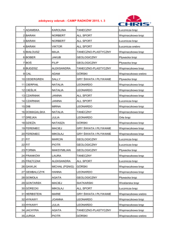 zdobywcy odznak - CAMP RADKÓW 2015. t. 3 1 ADAMSKA KAROLINA TANECZNY Łucznicza brąz 2 BARAN NORBERT ALL SPORT Wspinaczkowa brąz 3 BARAN NORBERT ALL SPORT Łucznicza brąz 4 BARAN VIKTOR ALL SPORT Łucznicza srebro 5 BIAŁOUSZ MAJA TANECZNO-PLASTYCZNY Wspinaczkowa brąz 6 BOBER JAKUB GEOLOGICZNY Pływacka brąz 7 BOŚ FILIP GEOLOGICZNY Pływacka brąz 8 BUDZISZ ALEKSANDRA TANECZNO-PLASTYCZNY Wspinaczkowa brąz 9 CAL ADAM GÓRSKI Wspinaczkowa srebro 10 CEDERGREN SALLY GRY ŚWIATA I PŁYWANIE Pływacka brąz 11 CIERPIAŁ NATALIA LEONARDO Wspinaczkowa brąz 12 CIEŚLIK NATALIA LEONARDO Wspinaczkowa brąz 13 CZARNIAK JANINA ALL SPORT Wspinaczkowa brąz 14 CZARNIAK JANINA ALL SPORT Łucznicza brąz 15 DIB MIRNA LEONARDO Wspinaczkowa brąz 16 DOMAGALSKA NATALIA TANECZNY Wspinaczkowa brąz 17 DREJKA JULIA LEONARDO Orła brąz 18 DZIEŻA NATASZA GÓRSKI Wspinaczkowa brąz 19 FERENIEC MACIEJ GRY ŚWIATA I PŁYWANIE Wspinaczkowa brąz 20 FERENIEC MIKOŁAJ GRY ŚWIATA I PŁYWANIE Wspinaczkowa brąz 21 FIT MARCIN GEOLOGICZNY Łucznicza brąz 22 FIT PIOTR GEOLOGICZNY Łucznicza brąz 23 FORMA MAKSYMILIAN GEOLOGICZNY Pływacka brąz 24 FRANKÓW LAURA TANECZNY Wspinaczkowa brąz 25 FRĄTCZAK ALEKSANDRA ALL SPORT Łucznicza brąz 26 GAWLIK MICHAŁ (PGNIG) GÓRSKI Wspinaczkowa brąz 27 GEMBALCZYK HANNA LEONARDO Wspinaczkowa brąz 28 GOMOŁA AGATA GEOLOGICZNY Pływacka brąz 29 GONTAREK MACIEJ SIATKARSKI Wioślarska brąz 30 GÓRECKI MIKOŁAJ ALL SPORT Łucznicza brąz 31 HERBSTEIN MARIE GRY ŚWIATA I PŁYWANIE Wspinaczkowa srebro 32 HYKAWY JOANNA LEONARDO Wspinaczkowa brąz 33 HYKAWY JULIA LEONARDO Wspinaczkowa brąz 34 JACHYRA AGATA TANECZNO-PLASTYCZNY Wspinaczkowa brąz 35 JURGA PIOTR GÓRSKI Wspinaczkowa srebro 36 KALINOWSKI MIESZKO ALL SPORT Łucznicza srebro 37 KAPUSTKA AGATA GRY ŚWIATA I PŁYWANIE Pływacka brąz 38 KIEŁTYKA SZYMON GRY ŚWIATA I PŁYWANIE Orła brąz 39 KLIMAŃSKA NATALIA MEDIA-GAZETA,RADIO,TV Wioślarska brąz 40 KOMORNICZAK MALGORZATA TANECZNY Wspinaczkowa brąz 41 KOŁODZIEJEK KACPER ALL SPORT Łucznicza brąz 42 KRÓLAK ANNA FOTOGRAFICZNY Łucznicza brąz 43 KRUSZEWSKA KINGA TANECZNY Wspinaczkowa brąz 44 KRYCZEK FRANCISZEK ALL SPORT Łucznicza brąz 45 KRZYSZTYNIAK WIKTOR ALL SPORT Łucznicza brąz 46 KURYŁOWICZ HANNA TANECZNO-PLASTYCZNY Orła brąz 47 LEDZIŃSKI ANTONI GRY ŚWIATA I PŁYWANIE Pływacka brąz 48 LISEK KARINA FOTOGRAFICZNY Łucznicza brąz 49 LISZCZYK MATEUSZ GÓRSKI Wspinaczkowa srebro 50 MACIEJEWSKA KINGA GÓRSKI Wspinaczkowa srebro 51 MĄDRY NADIA LEONARDO Wspinaczkowa brąz 52 MAJERSKA OLIWIA FOTOGRAFICZNY Łucznicza brąz 53 MARKIEWICZ JAGODA MEDIA-GAZETA,RADIO,TV Wioślarska brąz 54 MARZEC KLARA ALL SPORT Łucznicza srebro 55 MAZUREK MAGDA MEDIA-GAZETA,RADIO,TV Wioślarska brąz 56 MAZURKIEWICZ FILIP GÓRSKI Wspinaczkowa srebro 57 MENDYGRAŁ ZOFIA TANECZNY Wspinaczkowa brąz 58 MOLSKA NATALIA TANECZNO-PLASTYCZNY Wspinaczkowa brąz 59 MUNONYE KLARA GÓRSKI Wspinaczkowa brąz 60 NAPIORKOWSKA KAROLINA GEOLOGICZNY Pływacka brąz 61 NAWŁOKA DARIA ALL SPORT Wspinaczkowa brąz 62 NIEWIADA MAJA TANECZNO-PLASTYCZNY Wspinaczkowa brąz 63 NOWAK JULIA GÓRSKI Wspinaczkowa brąz 64 OLSZEWSKA AGATA ALL SPORT Wspinaczkowa brąz 65 ORŻANOWSKI MICHAŁ ALL SPORT Łucznicza brąz 66 ORŁOWSKA MAJA GRY ŚWIATA I PŁYWANIE Wspinaczkowa złoto 67 PAJĄCZKOWSKA KAROLINA FOTOGRAFICZNY Łucznicza brąz 68 PATER MATYLDA LEONARDO Wspinaczkowa brąz 69 PAWLAK JOANNA ALL SPORT Wspinaczkowa brąz 70 PAWLAK JOANNA ALL SPORT Łucznicza brąz 71 PIECEK KRZYSZTOF ALL SPORT Łucznicza brąz 72 PLUTA BARTŁOMIEJ SIATKARSKI Wioślarska brąz 73 PODDANY ALICJA TANECZNO-PLASTYCZNY Wspinaczkowa brąz 74 POPŁAWSKA ŁUCJA LEONARDO Wspinaczkowa brąz 75 POWAŁKA LEON SIATKARSKI Wioślarska brąz 76 PROKOPIUK KRZYSZTOF ALL SPORT Łucznicza brąz 77 PRUSKO ELIZABETH TANECZNO-PLASTYCZNY Wspinaczkowa brąz 78 RACZKOWSKA MONIKA LEONARDO Wspinaczkowa brąz 79 RADLICKA DOROTA TANECZNO-PLASTYCZNY Orła brąz 80 ROMANSKI MIKOLAJ GRY ŚWIATA I PŁYWANIE Pływacka brąz 81 ROZWADOWSKI TOMEK GEOLOGICZNY Pływacka brąz 82 SADOWSKA ZUZANNA MEDIA-GAZETA,RADIO,TV Wioślarska brąz 83 SCHAB WIKTOR ALL SPORT Wspinaczkowa brąz 84 SCHAB WIKTOR ALL SPORT Łucznicza brąz 85 SKUBACZ ZOFIA TANECZNO-PLASTYCZNY Wspinaczkowa brąz 86 SOSIŃSKA ALEKSANDRA MEDIA-GAZETA,RADIO,TV Wioślarska brąz 87 STRZESZYŃSKA JULIA LEONARDO Orła brąz 88 STRZYCZKOWSKA MAGDALENA MEDIA-GAZETA,RADIO,TV Wioślarska brąz 89 ŚWIENC WITOLD ALL SPORT Łucznicza brąz 90 SZURA JUSTYNA LEONARDO Wspinaczkowa brąz 91 SZUSTER LENA TANECZNO-PLASTYCZNY Wspinaczkowa brąz 92 SZYMANEK KACPER ALL SPORT Łucznicza brąz 93 TATAREK MARTYNA TANECZNY Wspinaczkowa brąz 94 TKACZ JAGODA TANECZNY Wspinaczkowa brąz 95 TYRAJSKA MARTYNA GÓRSKI Wspinaczkowa brąz 96 ULANOWSKA LAURA GÓRSKI Wspinaczkowa brąz 97 UTLIŃSKA AGATA MEDIA-GAZETA,RADIO,TV Wioślarska brąz 98 WALEWSKA ZUZANNA ALL SPORT Wspinaczkowa brąz 99 WALEWSKA ZUZANNA ALL SPORT Łucznicza brąz 100 WARCZAK ZOFIA GEOLOGICZNY Pływacka brąz 101 WAROWNY MARIA ALL SPORT Łucznicza brąz 102 WIŚNIEWSKA RÓŻA FOTOGRAFICZNY Łucznicza brąz 103 WOJSZKO ALEKSANDER GRY ŚWIATA I PŁYWANIE Orła brąz 104 WOJTKOWSKA MICHALINA TANECZNO-PLASTYCZNY Wspinaczkowa brąz 105 ZALEWSKI ADAM ALL SPORT Wspinaczkowa brąz 106 ZALEWSKI ADAM ALL SPORT Łucznicza brąz 107 ZWOLIŃSKA LAURA LEONARDO Wspinaczkowa brąz 108 ZWOLIŃSKA NATASZA TANECZNO-PLASTYCZNY Orła brąz 109 ŁABĘDŹ JULIA MEDIA-GAZETA,RADIO,TV Wioślarska brąz 110 ŁUKASZEWSKI TOMASZ GRY ŚWIATA I PŁYWANIE Wspinaczkowa srebro 111 ŁUKASZUK WOJCIECH GEOLOGICZNY Pływacka brąz 112 ŁUKAWSKI SZYMON ALL SPORT Wspinaczkowa brąz 113 ŁUKAWSKI SZYMON ALL SPORT Łucznicza brąz 114 ŁUNIEWSKA JULIA GEOLOGICZNY Łucznicza brąz