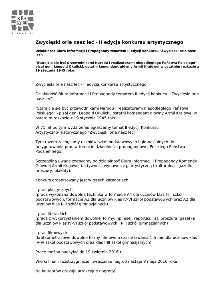 Zwycięski orle nasz leć - II edycja konkursu artystycznego Działalność Biura Informacji i Propagandy tematem II edycji konkursu "Zwycięski orle nasz leć". "Starajcie się być przewodnikami Narodu i realizatorami niepodległego Państwa Polskiego" pisał gen. Leopold Okulicki, ostatni komendant główny Armii Krajowej w ostatnim rozkazie z 19 stycznia 1945 roku. Zwycięski orle nasz leć - II edycja konkursu artystycznego Działalność Biura Informacji i Propagandy tematem II edycji konkursu "Zwycięski orle nasz leć". "Starajcie się być przewodnikami Narodu i realizatorami niepodległego Państwa Polskiego" - pisał gen. Leopold Okulicki, ostatni komendant główny Armii Krajowej w ostatnim rozkazie z 19 stycznia 1945 roku. W 71 lat po tym wydarzeniu ogłaszamy temat II edycji Konkursu Artystyczno-Historycznego "Zwycięski orle nasz leć". Tym razem zachęcamy uczniów szkół podstawowych i gimnazjalnych do przygotowania prac w temacie działalności propagandowej Polskiego Państwa Podziemnego. Szczególną uwagę zwracamy na działalność Biura Informacji i Propagandy Komendy Głównej Armii Krajowej (aktywność wydawniczą, artystyczną i kulturalną - gazetki, broszury, plakaty). Konkurs organizowany jest w trzech kategoriach: - prac plastycznych (praca wykonana dowolną techniką w formacie A4 dla uczniów klas I-III szkół podstawowych, formacie A3 dla uczniów klas IV-VI szkół podstawowych oraz A2 dla uczniów klas I-III szkół gimnazjalnych) - prac literackich (praca z wykorzystaniem dowolnej formy, np. esej, reportaż, list, broszura, gazetka dla uczniów klas IV-VI szkół podstawowych i I-III szkół gimnazjalnych) - prac filmowych (krótkometrażowe dowolne formy filmowe o czasie trwania 1-5 min dla uczniów klas IV-VI szkół podstawowych oraz klas I-III szkół gimnazjalnych) Prace można nadsyłać do 19 kwietnia 2016 r. Wielki finał - rozstrzygnięcie i wręczenie nagród nastąpi 8 maja 2016 roku. Na laureatów czekają atrakcyjne nagrody. Misją konkursu jest inspirowanie i motywowanie dzieci i młodzieży do zapoznania się z historią Polski oraz pobudzenie kreatywności i nauka przedstawiania swoich opinii za pomocą wyrazu artystycznego. Regulamin konkursu, i Formularz zgłoszeniowy dostępne na na stronie www.muzeum-ak.pl w zakładce co gdzie kiedy. Bon Kultury 2016 w Muzeum AK "Zostań asem wywiadu" oraz "Nie tylko bronią walczono" to nowe tematy warsztatów realizowanych w Muzeum AK w ramach programu Bon Kultury Urzędu Marszałkowskiego Województwa Małopolskiego w 2016 r. Zapraszamy uczniów szkół podstawowych, gimnazjów i szkół ponadgimnazjalnych, a także dzieci i młodzież ze szkół specjalnych, integracyjnych, placówek opiekuńczo-wychowawczych, drużyny harcerskie, a także uczestników indywidualnych. Województwo Małopolskie zapewnia dofinansowanie zajęć, a logo "Bonu Kultury" daje gwarancję, że proponowane warsztaty są nie tylko ciekawe, ale również atrakcyjne cenowo. Zostań asem wywiadu Warsztaty połączone z grą terenową Uczestnicy zajęć przekonają się jak wielkie znaczenie dla przebiegu II wojny światowej miała działalność polskiego wywiadu. Poznają biografie wybitnych agentów (Krystyny Skarbek i Kazimierza Leskiego), podążą śladami emisariuszy i kurierów (Jana Karskiego, Elżbiety Zawackiej i Stanisława Marusarza), a także poznają dokonania najbardziej znanych polskich kryptologów, którzy złamali kod niemieckiej maszyny szyfrującej Enigma (Mariana Rejewskiego, Jerzego Różyckiego i Henryka Zygalskiego). Podczas warsztatów realizowane są różnorodne aktywności: zwiedzanie fragmentów ekspozycji stałej, deszyfrowanie tajnych wiadomości czy wypełnianie specjalnych dowodów osobistych. W sali warsztatowej - Małej AKademii - prezentujemy najciekawsze akcje przeprowadzone przez wywiad, fragmenty maszynopisów oraz metody działania wybranych konspiratorów. Po tej dawce wiedzy uczestnicy mogą sprawdzić swoje umiejętności. Gra terenowa prowadzi na ekspozycję stałą, gdzie znajdują się informacje potrzebne do rozwiązania łamigłówek. Najważniejsze pojęcia: #wywiad, #łączność, #kryptologia, #emisariusz, #kurier. Przedział wiekowy uczestników zajęć: 9-13 lat (uczniowie szkół podstawowych) Czas trwania: 1,5 - 2 godziny zegarowe. Koszt udziału: grupy z gminy Kraków 5 zł od osoby, grupy spoza gminy Kraków 0 zł Nie tylko bronią walczono II wojna światowa to nie tylko pistolety maszynowe Sten, rakieta V-2, czołgi Vickers i zrzuty dokonywane z pokładów Halifaxów. Orężem w walce z wrogami były też kolejne wydania Biuletynu Informacyjnego, wiadomości podawane w radiu "Błyskawica" czy wiersze Krzysztofa Kamila Baczyńskiego. Polska kultura czasów okupacji działała aktywnie, czego dowodzi twórczość m.in. Aleksandra Kamińskiego, Anny Smoleńskiej czy Jana Rzepeckiego. Program warsztatów obejmuje zwiedzanie ekspozycji stałej ze szczególnym uwzględnieniem dorobku kulturowego Polaków oraz zajęcia w Małej AKademii. W sali warsztatowej prezentowana jest prasa podziemna, w tym m.in. sfałszowane przez harcerzy Szarych Szeregów wydanie "Gońca Krakowskiego". Nie brakuje również nawiązań do radia, filmu, teatru i działań małego sabotażu. Zadaniem uczestników jest przygotowanie skutecznej kampanii informacyjnej, obejmującej tworzenie haseł i znaków oraz wybór odpowiednich nośników - ulotek, plakatów, wydawnictw. Na zakończenie zajęć uczestnicy wykonują odciski orłów czapkowych przy wykorzystaniu repliki sztancy, a także malują wybrane hasła i symbole konspiracyjne na przygotowanych płytach. Najważniejsze pojęcia: #BIP (Biuro Informacji i Propagandy), #Akcja "N", #patriotyzm, #propaganda, Przedział wiekowy uczestników zajęć: 13-15 oraz 16-18 lat (uczniowie gimnazjów i szkół ponadgimnazjalnych), a także osoby dorosłe i seniorzy (możliwość przeprowadzenia zajęć integrujących pokolenia) Czas trwania: ok 2 godziny 