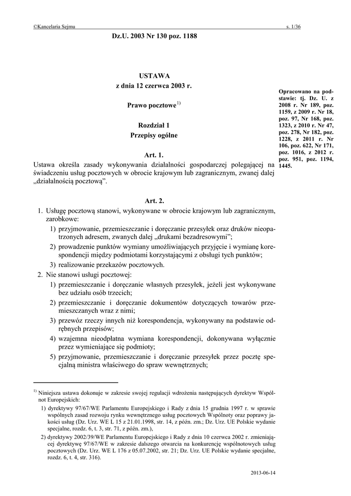 ©Kancelaria Sejmu s. 1/36 Dz.U. 2003 Nr 130 poz. 1188 USTAWA z dnia 12 czerwca 2003 r. Prawo pocztowe 1) Rozdział 1 Przepisy ogólne Art. 1. Ustawa określa zasady wykonywania działalności gospodarczej polegającej na świadczeniu usług pocztowych w obrocie krajowym lub zagranicznym, zwanej dalej „działalnością pocztową”. Art. 2. 1. Usługę pocztową stanowi, wykonywane w obrocie krajowym lub zagranicznym, zarobkowe: 1) przyjmowanie, przemieszczanie i doręczanie przesyłek oraz druków nieopatrzonych adresem, zwanych dalej „drukami bezadresowymi”; 2) prowadzenie punktów wymiany umożliwiających przyjęcie i wymianę korespondencji między podmiotami korzystającymi z obsługi tych punktów; 3) realizowanie przekazów pocztowych. 2. Nie stanowi usługi pocztowej: 1) przemieszczanie i doręczanie własnych przesyłek, jeżeli jest wykonywane bez udziału osób trzecich; 2) przemieszczanie i doręczanie dokumentów dotyczących towarów przemieszczanych wraz z nimi; 3) przewóz rzeczy innych niż korespondencja, wykonywany na podstawie odrębnych przepisów; 4) wzajemna nieodpłatna wymiana korespondencji, dokonywana wyłącznie przez wymieniające się podmioty; 5) przyjmowanie, przemieszczanie i doręczanie przesyłek przez pocztę specjalną ministra właściwego do spraw wewnętrznych; 1) Niniejsza ustawa dokonuje w zakresie swojej regulacji wdrożenia następujących dyrektyw Wspólnot Europejskich: 1) dyrektywy 97/67/WE Parlamentu Europejskiego i Rady z dnia 15 grudnia 1997 r. w sprawie wspólnych zasad rozwoju rynku wewnętrznego usług pocztowych Wspólnoty oraz poprawy jakości usług (Dz. Urz. WE L 15 z 21.01.1998, str. 14, z późn. zm.; Dz. Urz. UE Polskie wydanie specjalne, rozdz. 6, t. 3, str. 71, z późn. zm.), 2) dyrektywy 2002/39/WE Parlamentu Europejskiego i Rady z dnia 10 czerwca 2002 r. zmieniającej dyrektywę 97/67/WE w zakresie dalszego otwarcia na konkurencję wspólnotowych usług pocztowych (Dz. Urz. WE L 176 z 05.07.2002, str. 21; Dz. Urz. UE Polskie wydanie specjalne, rozdz. 6, t. 4, str. 316). 2013-06-14 Opracowano na podstawie: tj. Dz. U. z 2008 r. Nr 189, poz. 1159, z 2009 r. Nr 18, poz. 97, Nr 168, poz. 1323, z 2010 r. Nr 47, poz. 278, Nr 182, poz. 1228, z 2011 r. Nr 106, poz. 622, Nr 171, poz. 1016, z 2012 r. poz. 951, poz. 1194, 1445. ©Kancelaria Sejmu s. 2/36 6) przyjmowanie, przemieszczanie i doręczanie przesyłek przez pocztę Ministra Obrony Narodowej – wojskową pocztę polową. Art. 3. Użyte w ustawie określenia oznaczają: 1) adres – oznaczenie adresata przesyłki lub kwoty przekazu pocztowego oraz miejsca doręczenia wskazanego przez nadawcę; 2) adresat – podmiot określony przez nadawcę jako odbiorca przesyłki lub kwoty pieniężnej określonej w przekazie pocztowym; 3) agent – przedsiębiorcę pośredniczącego w zawieraniu umów o świadczenie usług pocztowych na rzecz operatora, zawierającego takie umowy w imieniu operatora; 4) agent pocztowy – agenta, o którym mowa w pkt 3, działającego w imieniu lub na rzecz operatora publicznego; 5) doręczenie – wydanie przesyłki lub wypłacenie kwoty pieniężnej określonej w przekazie pocztowym adresatowi, a w przypadkach określonych prawem także innej osobie, lub przekazanie druku bezadresowego zgodnie z umową o świadczenie usługi pocztowej; 6) druk – informację pisemną lub graficzną, zwielokrotnioną za pomocą technik drukarskich lub podobnych, utrwaloną na papierze albo innym materiale używanym w drukarstwie, w tym książkę, katalog, dziennik lub czasopismo; 7) międzynarodowe przepisy pocztowe – ratyfikowane przez Rzeczpospolitą Polską umowy międzynarodowe, umowy międzynarodowe zawarte w sposób dopuszczony przez prawo międzynarodowe dotyczące świadczenia usług pocztowych oraz wiążące regulaminy wykonawcze Światowego Związku Pocztowego; 8) nadanie – polecenie doręczenia przesyłki lub kwoty pieniężnej określonej w przekazie pocztowym oraz przekazania druku bezadresowego zgodnie z umową o świadczenie usługi pocztowej; 9) nadanie na poste restante – polecenie doręczenia przesyłki lub wypłacenia adresatowi kwoty pieniężnej określonej w przekazie pocztowym wyłącznie w placówce operatora, wskazanej przez nadawcę jako miejsce doręczenia; 10) nadawca – podmiot, który zawarł umowę o świadczenie usług pocztowych; 11) operator – przedsiębiorcę uprawnionego do wykonywania działalności pocztowej; 12) operator publiczny – operatora obowiązanego do świadczenia powszechnych usług pocztowych; 13) paczka pocztowa – przesyłkę rejestrowaną zawierającą rzeczy, przyjętą przez operatora publicznego w celu przemieszczenia i doręczenia; 14) placówka operatora – jednostkę organizacyjną operatora, agenta lub agenta pocztowego, w której nadawca może zawrzeć umowę o świadczenie usług pocztowych lub która doręcza adresatom przesyłki lub kwoty pieniężne określone w przekazach pocztowych, albo inne wyodrębnione i oznaczone przez operatora miejsce, w którym można zawrzeć umowę o świadczenie usług pocztowych lub odebrać przesyłkę lub kwotę pieniężną określoną w przekazie pocztowym; 15) przekaz pocztowy – polecenie doręczenia adresatowi określonej kwoty pieniężnej przez operatora publicznego; 2013-06-14 ©Kancelaria Sejmu s. 3/36 16) przesyłka – rzeczy opatrzone adresem, przedłożone do przyjęcia lub przyjęte przez operatora w celu przemieszczenia i doręczenia adresatowi; 17) przesyłka dla ociemniałych – przesyłkę o masie do 7 000 g, zawierającą korespondencję lub druki, w których informacja jest utrwalona pismem wypukłym lub na innym nośniku dostępnym do odczytu przez niewidomych lub ociemniałych, nadaną w sposób umożliwiający sprawdzenie zawartości; 18) przesyłka listowa – przesyłkę niebędącą paczką pocztową; 19) przesyłka polecona – przesyłkę rejestrowaną będącą przesyłką listową, przemieszczaną i doręczaną w sposób z