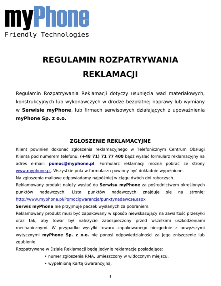 REGULAMIN ROZPATRYWANIA REKLAMACJI Regulamin Rozpatrywania Reklamacji dotyczy usunięcia wad materiałowych, konstrukcyjnych lub wykonawczych w drodze bezpłatnej naprawy lub wymiany w Serwisie myPhone, lub firmach serwisowych działających z upoważnienia myPhone Sp. z o.o. ZGŁOSZENIE REKLAMACYJNE Klient powinien dokonać zgłoszenia reklamacyjnego w Telefonicznym Centrum Obsługi Klienta pod numerem telefonu: (+48 71) 71 77 400 bądź wysłać formularz reklamacyjny na adres e-mail: [email protected]. Formularz reklamacji można pobrać ze strony www.myphone.pl. Wszystkie pola w formularzu powinny być dokładnie wypełnione. Na zgłoszenia mailowe odpowiadamy najpóźniej w ciągu dwóch dni roboczych. Reklamowany produkt należy wysłać do Serwisu myPhone za pośrednictwem określonych punktów nadawczych. Lista punktów nadawczych znajduje się na stronie: http://www.myphone.pl/Pomocigwarancja/punktynadawcze.aspx Serwis myPhone nie przyjmuje paczek wysłanych za pobraniem. Reklamowany produkt musi być zapakowany w sposób niewskazujący na zawartość przesyłki oraz tak, aby towar był należycie zabezpieczony przed wszelkimi uszkodzeniami mechanicznymi. W przypadku wysyłki towaru zapakowanego niezgodnie z powyższymi wytycznymi myPhone Sp. z o.o. nie ponosi odpowiedzialności za jego zniszczenie lub zgubienie. Rozpatrywane w Dziale Reklamacji będą jedynie reklamacje posiadające: • numer zgłoszenia RMA, umieszczony w widocznym miejscu, • wypełnioną Kartę Gwarancyjną, 1 • dowód zakupu. Przesyłki, które nie posiadają numeru zgłoszenia (numeru RMA), wypełnionej Karty Gwarancyjnej i dowodu zakupu, będą odsyłane do Klienta, na jego koszt. OKRES GWARANCJI Okres Gwarancji rozpoczyna się z chwilą zakupu oryginalnego produktu myPhone przez pierwszego użytkownika końcowego. 1. myPhone Sp. z o.o., jako Gwarant, zapewnia, przez okres 24 (dwudziestu czterech) miesięcy, gwarancję na produkt, chyba że w Karcie Gwarancyjnej Gwarant ustanowił inne warunki gwarancji. 2. Gwarancja na akcesoria trwa przez okres 6 (sześć) miesięcy od daty zakupu. Firma myPhone Sp. z o.o. nie ponosi kosztów transportu za akcesoria przesłane do serwisu w ramach gwarancji. 3. myPhone Sp. z o.o. wydłuża z 24 (dwudziestu czterech) do 36 (trzydziestu sześciu) miesięcy okres gwarancyjny na telefony z serii Simple Life (myPhone DECO, myPhone 1030, myPhone 1040, myPhone 1045, myPhone 1050, myPhone 1055, myPhone 1060, myPhone 1062, myPhone 1065, myPhone 1070, myPhone 1080, myPhone 1082, myPhone 1090, myPhone 2050, myPhone 2070, myPhone 5300), chyba że w Karcie Gwarancyjnej Gwarant ustanowił inne warunki gwarancji. 4. Okres Gwarancji na towary wymienione lub naprawione na skutek zgłoszenia przez klienta roszczenia z tytułu gwarancji, niezgodności towaru konsumpcyjnego z umową, rękojmi, lub innych podstaw prawnych nie ulega przedłużeniu po dokonaniu naprawy lub wymiany i kończy się w terminie przewidzianym dla towaru naprawionego lub wymienionego. Towary naprawione lub wymienione nie są objęte odrębną gwarancją. W przypadku napraw produktów firmy myPhone, dla których minął Okres Gwarancji opisany powyżej, dokonywanych na koszt Klienta, który wcześniej wyraził chęć wykonania przez serwis takiej naprawy, myPhone Sp. z o.o. udziela 30-dniowej (trzydziestodniowej) gwarancji na naprawioną część. WARUNKI GWARANCJI 1. Jeżeli usterka urządzenia podlega warunkom Gwarancji, zostanie usunięta w czasie 14 (czternastu) dni roboczych licząc od dnia przyjęcia produktu do Serwisu myPhone (wraz z wypełnioną Kartą Gwarancyjną, dowodem zakupu i numerem RMA). 2 2. Pracownik Obsługi Technicznej i Działu Reklamacji firmy myPhone Sp. z o.o. jest osobą uprawnioną do wstępnej oceny przyczyny usterki urządzenia. 3. Gwarant zastrzega sobie prawo do przedłużenia czasu naprawy, jeżeli wymagane naprawy nie mogą być wykonane ze względu na: 3.1. brak części zamiennych na terytorium Rzeczpospolitej Polskiej; 3.2. ograniczenia importowe / eksportowe na urządzenia i części zamienne; 3.3. nieprzewidziane okoliczności uniemożliwiające wykonanie naprawy; 3.4. zaistnienie siły wyższej; 3.5. czas potrzebny na zweryfikowanie przyczyn usterki. 4. Gwarant nie odpowiada za szkody i straty powstałe w wyniku wadliwego działania lub uszkodzenia urządzenia oraz za szkody, utracone dane i straty wynikające z niemożności korzystania z urządzenia będącego w naprawie. 5. Zakresem Gwarancji nie są objęte czynności należące do normalnej obsługi eksploatacji zgodnie z instrukcją obsługi. 6. Terytorialny zasięg niniejszej gwarancji obejmuje terytorium Rzeczypospolitej Polskiej. 7. Gwarancja nie obejmuje naturalnego zużycia zewnętrznych elementów urządzeń, np.: zarysowań obudowy, napisów na klawiaturze, jak również naturalnego zużycia baterii. 8. Gwarancja nie obejmuje niewielkich defektów wyświetlaczy LCD w urządzeniach wyposażonych w takie wyświetlacze, chyba że na jeden (1) milion pikseli danego wyświetlacza będą więcej niż cztery (4) uszkodzone piksele, a jeśli wyświetlacz zostanie podzielony na dziewięć (9) równych prostokątnych obszarów, w środkowym obszarze będzie więcej niż jeden (1) uszkodzony piksel. 9. Naprawie gwarancyjnej nie podlegają urządzenia, jeżeli: 9.1. Karta gwarancyjna i dowód zakupy nie są tożsame. 9.2. Wprowadzone są jakiekolwiek modyfikacje na karcie gwarancyjnej lub dowodzie zakupu. 9.3. Nie jest możliwe odczytanie danych z w/w dokumentów. 9.4. Numer IMEI (telefony, lokalizatory) lub seryjny (tablety) będzie niemożliwy do ustalenia. 9.5. Punkt serwisowy stwierdził usterkę spowodowaną z winy klienta typu: − uszkodzenie mechaniczne, np. poprzez uderzenie lub upadek; − zawilgocenie, działanie środków chemicznych; − nieautoryzowana ingerencja, np. naprawa w nieautoryzowanym punkcie napraw; − nieprawidłowa eksploatacja urządzenia: zanieczyszczenia, niewłaściwa 3 instalacja oraz obsłu