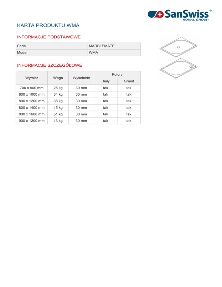 KARTA PRODUKTU WMA INFORMACJE PODSTAWOWE Seria MARBLEMATE Model WMA INFORMACJE SZCZEGÓŁOWE Powered by TCPDF (www.tcpdf.org) Wymiar Waga Wysokość 700 x 900 mm 25 kg 800 x 1000 mm Kolory Biały Granit 30 mm tak tak 34 kg 30 mm tak tak 800 x 1200 mm 38 kg 30 mm tak tak 800 x 1400 mm 45 kg 30 mm tak tak 800 x 1600 mm 51 kg 30 mm tak tak 900 x 1200 mm 43 kg 30 mm tak tak