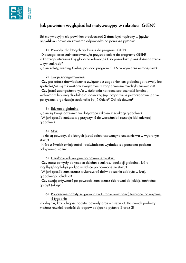 Jak powinien wyglądać list motywacyjny w rekrutacji GLEN? List motywacyjny nie powinien przekraczać 2 stron, być napisany w języku angielskim i powinien zawierać odpowiedzi na poniższe pytania: 1) Powody, dla których aplikujesz do programu GLEN - Dlaczego jesteś zainteresowany/a przystąpieniem do programu GLEN? - Dlaczego interesuje Cię globalna edukacja? Czy posiadasz jakieś doświadczenia w tym zakresie? - Jakie zalety, według Ciebie, posiada program GLEN w wymiarze europejskim? 2) Twoje zaangażowanie - Czy posiadasz doświadczenie związane z zagadnieniem globalnego rozwoju lub spotkałeś/aś się z kwestiami związanymi z zagadnieniem międzykulturowości? - Czy jesteś zaangażowany/a w działania na rzecz społeczności lokalnej, wolontariat lub inną działalność społeczną (np. organizacje pozarządowe, partie polityczne, organizacje studenckie itp.)? Gdzie? Od jak dawna? 3) Edukacja globalna - Jakie są Twoje oczekiwania dotyczące szkoleń z edukacji globalnej? - W jaki sposób możesz się przyczynić do wdrażania i rozwoju idei edukacji globalnej? 4) Staż - Jakie są powody, dla których jesteś zainteresowany/a uczestnictwa w wybranym stażu? - Które z Twoich umiejętności i doświadczeń wydadzą się pomocne podczas odbywania stażu? 5) Działania edukacyjne po powrocie ze stażu - Czy masz pomysły dotyczące działań z zakresu edukacji globalnej, które mógłbyś/mogłabyś podjąć w Polsce po powrocie ze stażu? - W jaki sposób zamierzasz wykorzystać doświadczenie zdobyte w kraju globalnego Południa? - Czy swoją aktywność po powrocie zamierzasz skierować do jakiejś konkretnej grupy? Jakiej? 6) Poprzednie pobyty za granicą (w Europie oraz poza) trwające, co najmniej 4 tygodnie - Podaj rok, kraj, długość pobytu, powody oraz ich rezultat. Do swoich podróży możesz również odnieść się odpowiadając na pytania 2 oraz 3!