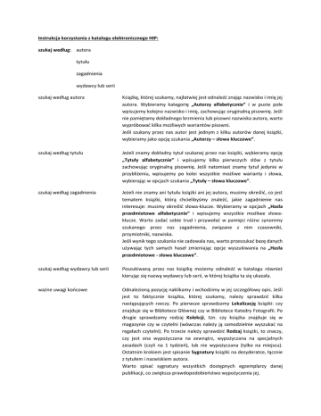 Instrukcja korzystania z katalogu elektronicznego HIP: szukaj według: autora tytułu zagadnienia wydawcy lub serii szukaj według autora Książkę, której szukamy, najłatwiej jest odnaleźć znając nazwisko i imię jej autora. Wybieramy kategorię „Autorzy alfabetycznie” i w puste pole wpisujemy kolejno nazwisko i imię, zachowując oryginalną pisownię. Jeśli nie pamiętamy dokładnego brzmienia lub pisowni nazwiska autora, warto wypróbować kilka możliwych wariantów pisowni. Jeśli szukany przez nas autor jest jednym z kilku autorów danej książki, wybieramy jako opcję szukania „Autorzy – słowa kluczowe”. szukaj według tytułu Jeżeli znamy dokładny tytuł szukanej przez nas książki, wybieramy opcję „Tytuły alfabetycznie” i wpisujemy kilka pierwszych słów z tytułu zachowując oryginalną pisownię. Jeśli natomiast znamy tytuł jedynie w przybliżeniu, wpisujemy po kolei wszystkie możliwe warianty i słowa, wybierając w opcjach szukania „Tytuły – słowa kluczowe”. szukaj według zagadnienia Jeżeli nie znamy ani tytułu książki ani jej autora, musimy określić, co jest tematem książki, którą chcielibyśmy znaleźć, jakie zagadnienie nas interesuje: musimy określić słowa-klucze. Wybieramy w opcjach „Hasła przedmiotowe alfabetycznie” i wpisujemy wszystkie możliwe słowaklucze. Warto zadać sobie trud i przywołać w pamięci różne synonimy szukanego przez nas zagadnienia, związane z nim czasowniki, przymiotniki, nazwiska. Jeśli wynik tego szukania nie zadowala nas, warto przeszukać bazę danych używając tych samych haseł zmieniając opcje wyszukiwania na „Hasła przedmiotowe - słowa kluczowe”. szukaj według wydawcy lub serii Poszukiwaną przez nas książkę możemy odnaleźć w katalogu również kierując się nazwą wydawcy lub serii, w której książka ta się ukazała. ważne uwagi końcowe Odnalezioną pozycję naklikamy i wchodzimy w jej szczegółowy opis. Jeśli jest to faktycznie książka, której szukamy, należy sprawdzić kilka następujących rzeczy. Po pierwsze sprawdzamy Lokalizację książki: czy znajduje się w Bibliotece Głównej czy w Bibliotece Katedry Fotografii. Po drugie sprawdzamy rodzaj Kolekcji, tzn. czy książka znajduje się w magazynie czy w czytelni (wówczas należy ją samodzielnie wyszukać na regałach czytelni). Po trzecie należy sprawdzić Rodzaj książki, to znaczy, czy jest ona wypożyczana na zewnątrz, wypożyczana na specjalnych zasadach (czyli na 1 tydzień), lub nie wypożyczana (tylko na miejscu). Ostatnim krokiem jest spisanie Sygnatury książki na dezyderatce, łącznie z tytułem i nazwiskiem autora. Warto spisać sygnatury wszystkich dostępnych egzemplarzy danej publikacji, co zwiększa prawdopodobieństwo wypożyczenia jej. Opracowanie: mgr Dominika M. Olczak