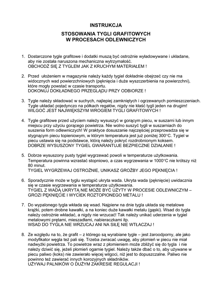 INSTRUKCJA STOSOWANIA TYGLI GRAFITOWYCH W PROCESACH ODLEWNICZYCH 1. Dostarczone tygle grafitowe i dodatki muszą być ostrożnie wyładowywane i układane, aby nie została naruszona mechaniczna wytrzymałość. OBCHODŹ SIĘ Z TYGLEM JAK Z KRUCHYM MATERIAŁEM ! 2. Przed ułożeniem w magazynie należy każdy tygiel dokładnie obejrzeć czy nie ma widocznych wad powierzchniowych (pęknięcia i duże wyszczerbienia na powierzchni), które mogły powstać w czasie transportu. DOKONUJ DOKŁADNEGO PRZEGLĄDU PRZY ODBIORZE ! 3. Tygle należy składować w suchych, najlepiej zamkniętych i ogrzewanych pomieszczeniach. Tygle układać pojedynczo na półkach regałów, nigdy nie kłaść tygli jeden na drugim! WILGOĆ JEST NAJWIĘKSZYM WROGIEM TYGLI GRAFITOWYCH ! 4. Tygle grafitowe przed użyciem należy wysuszyć w gorącym piecu, w suszarni lub innym miejscu przy użyciu gorącego powietrza. Nie wolno suszyć tygli w suszarniach do suszenia form odlewniczych! W praktyce dosuszanie najczęściej przeprowadza się w stygnącym piecu topieniowym, w którym temperatura jest już poniżej 300°C. Tygiel w piecu ustawia się na podstawce, którą należy pokryć rozdrobnionym koksem. DOBRZE WYSUSZONY TYGIEL GWARANTUJE BEZPIECZNE DZIAŁANIE ! 5. Dobrze wysuszony pusty tygiel wygrzewać powoli w temperaturze użytkowania. Temperatura powinna wzrastać stopniowo, a czas wygrzewania w 1000°C nie krótszy niż 80 minut. TYGIEL WYGRZEWAJ OSTROŻNIE, UNIKASZ GROŹBY JEGO PĘKNIĘCIA ! 6. Sporadycznie może w tyglu wystąpić ukryta wada. Ukryta wada (pęknięcie) uwidacznia się w czasie wygrzewania w temperaturze użytkowania. TYGIEL Z WADĄ UKRYTĄ NIE MOŻE BYĆ UŻYTY W PROCESIE ODLEWNICZYM – GROZI PĘKNIĘCIE I WYCIEK ROZTOPIONEGO METALU ! 7. Do wypalonego tygla wkłada się wsad. Najpierw na dnie tygla układa się metalowe krążki, potem drobne kawałki, a na koniec duże kawałki metalu (gąski). Wsad do tygla należy ostrożnie wkładać, a nigdy nie wrzucać! Tak należy unikać uderzenia w tygiel metalowymi prętami, mieszadłami, nabieraczkami itp. WSAD DO TYGLA NIE WRZUCAJ ANI NA SIŁĘ NIE WTŁACZAJ ! 8. Ze względu na to, że grafit – z którego są wyrabiane tygle – jest żaroodporny, ale jako modyfikator węgla też pali się. Trzeba zwracać uwagę, aby płomień w piecu nie miał nadwyżki powietrza. To powietrze wraz z płomieniem może zbliżyć się do tygla i nie należy dziwić się, jeżeli płomień ogarnie tygiel. Należy także dbać o to, aby używane w piecu paliwo (koks) nie zawierało więcej wilgoci, niż jest to dopuszczalne. Paliwo nie powinno też zawierać innych korozyjnych składników. UŻYWAJ PALNIKÓW O DUŻYM ZAKRESIE REGULACJI ! -2- 9. Tygiel z roztopionym metalem można wyjąć z pieca dopiero po ostygnięciu, zwracając uwagę, aby szczypce miały rozmiary odpowiednie do kształtu i wysokości tygla. W czasie przenoszenia, transportu i wylewania metalu tygiel nie może być narażony na gwałtowne wstrząsy. Przy przerwaniu pracy należy z tygla wylać resztę metalu. Nie należy tygla stawiać w przeciągu, na metalowej podkładce lub w wilgotnym miejscu. 10. W już użytym tyglu można dalej roztapiać metal bez wstępnego wypalania, ale po dłuższej przerwie w użytkowaniu należy ponownie tygiel wysuszyć. Podane wytyczne dotyczą także wyposażenia grafitowego i krzemokarbidowego do tygli grafitowych, takich jak podstawki, otuliny, pokrywy, tyczki, nabieraczki itp. DOTRZYMANIE TYCH WSZYSTKICH ZALECEŃ WARUNKUJE BEZPIECZNE, SZYBKIE I OSZCZĘDNE TOPIENIE METALU !