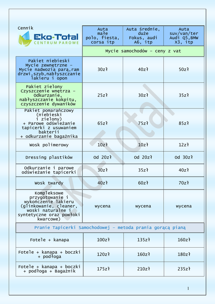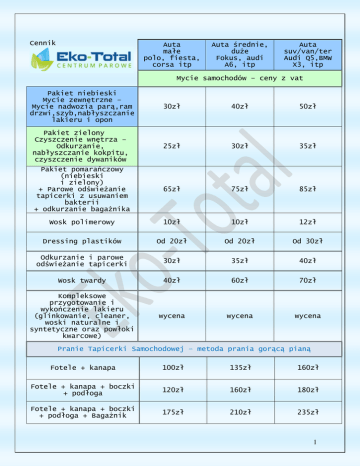 Cennik Auta małe polo, fiesta, corsa itp Auta średnie, duże Fokus, audi A6, itp Auta suv/van/ter Audi Q5,BMW X3, itp Mycie samochodów – ceny z vat Pakiet niebieski Mycie zewnętrzne – Mycie nadwozia parą,ram drzwi,szyb,nabłyszczanie lakieru i opon 30zł 40zł 50zł 25zł 30zł 35zł 65zł 75zł 85zł Wosk polimerowy 10zł 10zł 12zł Dressing plastików Od 20zł Od 20zł Od 30zł Odkurzanie i parowe odświeżanie tapicerki 30zł 35zł 40zł Wosk twardy 40zł 60zł 70zł Kompleksowe przygotowanie i wykończenie lakieru (glinkowanie, cleaner, woski naturalne i syntetyczne oraz powłoki kwarcowe) wycena wycena wycena Pakiet zielony Czyszczenie wnętrza – Odkurzanie, nabłyszczanie kokpitu, czyszczenie dywaników Pakiet pomarańczowy (niebieski i zielony) + Parowe odświeżanie tapicerki z usuwaniem bakterii + odkurzanie bagażnika Pranie Tapicerki Samochodowej – metoda prania gorącą pianą Fotele + kanapa 100zł 135zł 160zł Fotele + kanapa + boczki + podłoga 120zł 160zł 180zł Fotele + kanapa + boczki + podłoga + Bagażnik 175zł 210zł 235zł 1 Czyszczenie skóry Fotele + kanapa + boczki 150zł 170zł 190zł Inne usługi samochodowe Odkurzanie 14zł 16zł 18zł Mycie silnika – parą. Na odpowiedzialność klienta 30zł 40zł 45zł Ozonowanie 50zł 50zł 50zł Konserwacja gumowych uszczelek Dezynfekcja wentylacji parą 5zł 5zł 5zł 15zł 15zł 15zł Usuwanie smoły, asfaltu Od 20zł Od 20zł Od 30zł Czyszczenie woskiem felg aluminiowych 10zł/szt. 10zł/szt. 10zł/szt. Dom – Biuro, pranie i czyszczenie Fotel od 25ZŁ Krzesło, pufa od 10zł Kanapa 2 osobowa od 55zł Kanapa 3 osobowa od 75zł Narożnik od 85zł Dywan, wykładzina, metoda pianowa lub ekstrakcyjna od 7zł/m2 Mycie okien, witryn wycena Usuwanie naklejek wycena Mycie nagrobków od 40zł Czyszczenie płytek podłogowych od 5zł/m2 Czyszczenie płytek ściennych od 4zł/m2 Doczyszczanie fug od 4zł/m2 Pakiet płytki + fugi od 9zł/m2 Czyszczenie mieszkania domu po remoncie wycena 2 Czyszczenie kostki brukowej wycena Czyszczenie elewacji wycena Usuwanie graffiti wycena Ceny brutto: (z VAT) Przy dużych powierzchniach wycena indywidualna. Zastosowanie czyszczenia parowego: samochody, flota, naczepy, tapicerka samochodowa, żaglówki, elewacja, kostka brukowa, okna, kafle, bramy garażowe, ogrodzenia, dywany, itp. pomieszczenia przemysłowe, hale przemysłowe, urządzenia przemysłowe, kontenery, sprzęt budowlany, taśmy produkcyjne, gastronomia, hotele, kuchnie, itp. Służba zdrowia, gabinety lekarskie, dezynfekcja, sprzęt medyczny, ambulanse, itp. komunikacja miejska, autobusy, autokary, tramwaje, pociągi, czyszczenie siedzeń i obić itp. e-mail. [email protected] WWW.centrumparowe.pl Tel. 602-122-954 Tel. 601-360-710 - koszt usługi poniżej 50zł, dojazd do klienta 10zł 3