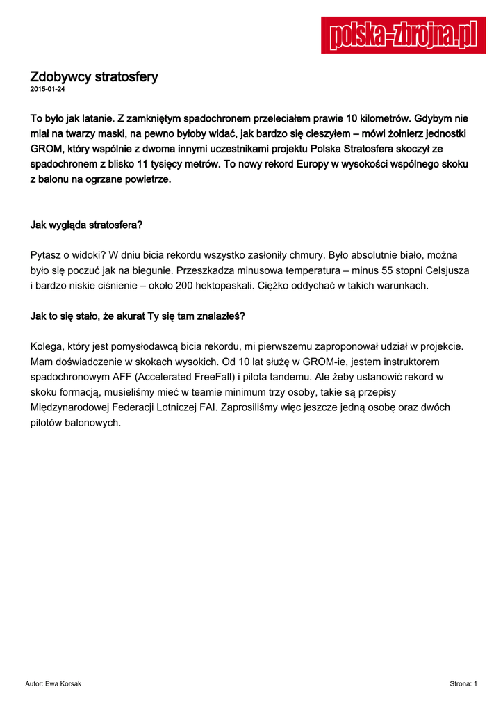 Zdobywcy stratosfery 2015-01-24 To było jak latanie. Z zamkniętym spadochronem przeleciałem prawie 10 kilometrów. Gdybym nie miał na twarzy maski, na pewno byłoby widać, jak bardzo się cieszyłem – mówi żołnierz jednostki GROM, który wspólnie z dwoma innymi uczestnikami projektu Polska Stratosfera skoczył ze spadochronem z blisko 11 tysięcy metrów. To nowy rekord Europy w wysokości wspólnego skoku z balonu na ogrzane powietrze. Jak wygląda stratosfera? Pytasz o widoki? W dniu bicia rekordu wszystko zasłoniły chmury. Było absolutnie biało, można było się poczuć jak na biegunie. Przeszkadza minusowa temperatura – minus 55 stopni Celsjusza i bardzo niskie ciśnienie – około 200 hektopaskali. Ciężko oddychać w takich warunkach. Jak to się stało, że akurat Ty się tam znalazłeś? Kolega, który jest pomysłodawcą bicia rekordu, mi pierwszemu zaproponował udział w projekcie. Mam doświadczenie w skokach wysokich. Od 10 lat służę w GROM-ie, jestem instruktorem spadochronowym AFF (Accelerated FreeFall) i pilota tandemu. Ale żeby ustanowić rekord w skoku formacją, musieliśmy mieć w teamie minimum trzy osoby, takie są przepisy Międzynarodowej Federacji Lotniczej FAI. Zaprosiliśmy więc jeszcze jedną osobę oraz dwóch pilotów balonowych. Autor: Ewa Korsak Strona: 1 Autor: Ewa Korsak Strona: 2 Do skoku przygotowywaliście się dwa lata. Długo. Sporo czasu zajęło nam szukanie sponsora, potrzebowaliśmy pieniędzy na zakup specjalistycznego sprzętu, na próby i treningi. Odbyliśmy mnóstwo skoków treningowych ze standardowej wysokości 4 tysięcy metrów. Korzystaliśmy z tunelu aerodynamicznego w Lesznie. Wszyscy jesteśmy doświadczonymi skoczkami i w tunelu wcześniej trenowaliśmy nie raz. Chodziło jednak o to, żeby sprawdzić nasze kombinezony oraz przećwiczyć procedury awaryjne. Mogliśmy też trenować spadanie formacją w kombinezonach, które zamierzaliśmy wykorzystać podczas skoku ze stratosfery w czasie dłuższym niż podczas skoku ze standardowej wysokości 4000 metrów. Wykonaliśmy też dwa skoki wysokie – z 5800 metrów i z 7800 metrów. Z balonu? Nie. Z samolotu. Z balonu skoczyliśmy tylko raz – 11 listopada, na Święto Niepodległości. Za to sporo trenowaliśmy w koszu balonu. Chcieliśmy przećwiczyć samo wyjście z kosza balonowego. Chodzi o odpowiednie ustawienie się do skoku oraz o oddzielenie od kosza w odpowiednim momencie. Bo skakaliśmy ze specjalnego antypoślizgowego podestu, który znajdował się na jednej ze ścian kosza – oczywiście od zewnętrznej strony. Musieliśmy się tak ustawić, by skoczyć razem, jednocześnie. Inaczej prawdopodobnie nie utrzymalibyśmy chwytów i formacji. Musieliśmy opracować taktykę, dzięki której to zgranie będzie perfekcyjne. Ja byłem odpowiedzialny za tzw. timeing, podawałem komendę do skoku: „Polska Stratosfera, ready, set, go…”. I na „go” wykonywaliśmy skok. Film: Polska Stratosfera. Produkcja: Polsat News. Czy można na ziemi sprawdzić swoją reakcję na niskie ciśnienie i niską temperaturę, które panują w stratosferze? Tak. Przeszliśmy próby w komorze niskich ciśnień i niskich temperatur. W komorze niskich ciśnień znajdującej się w WIML przeszliśmy dwie próby do wysokości 12 000 metrów, gdzie sprawdziliśmy reakcję naszych organizmów na ekspozycję niskiego ciśnienia oraz potwierdziliśmy, ile tak naprawdę będziemy potrzebować tlenu. Próby w komorze niskich ciśnień robiliśmy pod okiem mjr. Roberta Drozdowskiego. W komorze niskich temperatur chcieliśmy sprawdzić, czy nasze ubrania zapewnią komfort i czy nie zamarznie nam aparatura tlenowa. Spędziliśmy więc ponad godzinę w temperaturze poniżej minus 20 stopni Celsjusza. Dobrze, że to zrobiliśmy, bo postanowiliśmy dokupić jeszcze specjalne buty puchowe. Nie skoczyliście w tradycyjnych kombinezonach... Autor: Ewa Korsak Strona: 3 Garderobę trzeba było dopasować do warunków atmosferycznych... Żeby przeżyć w minus 55 stopniach, mieliśmy na sobie aż cztery warstwy ubrań. Pierwsza to bielizna termoaktywna, którą można kupić w każdym sklepie. Kolejne warstwy nie były tak „proste”. Druga to bielizna elektryczna, cztery obwody: skarpetki, dolna część bielizny, bluza i rękawiczki. Ta bielizna oryginalnie została zaprojektowana dla motocyklistów i nurków, a my ją nieco udoskonaliliśmy, tak by spełniała nasze wymagania. Trzecia warstwa to kombinezon puchowy. Czwarta – kombinezon wierzchni – bardzo duży, tak aby mógł pomieścić trzy warstwy ciuchów, które mieliśmy na sobie. Niełatwo było nauczyć się sterować ciałem w tak wielkim kombinezonie. Przy dobieraniu ubrania przydało się wcześniejsze doświadczenie himalaistyczne jednego z uczestników projektu oraz moje z GROM-u. Wziąłem pod uwagę doświadczenia starszych kolegów z jednostki i swoje. Ubrania to jedno, ale bez odpowiedniego sprzętu nie da się tam przecież oddychać? Potrzebowaliśmy sprzętu tlenowego. Korzystaliśmy z trzech różnych instalacji. Z pierwszej jeszcze na ziemi, przed skokiem. Skoczkowie w czasie saturacji. Dlaczego? Musieliśmy się pozbyć z organizmu azotu, żeby zapobiec chorobie dekompresyjnej. Oddychać czystym tlenem przez 75 min do wysokości 3050 metrów. Większość saturacji odbyła się na ziemi, ostatnia część już w czasie wznoszenia w balonie, żeby nie tracić czasu, bo o tej porze roku dzień jest krótki. Druga aparatura tlenowa była w koszu balonowym. Musieliśmy tak naprawdę zbudować ją sami, bo żadna z istniejących nie dawała możliwości oddychania przez tak długi czas: dwie godziny podczas wznoszenia dla całej załogi i godzina dla pilotów balonowych. Przecież my wyskoczyliśmy, a oni musieli jeszcze wylądować, co przy takiej wielkości balonu nie było prostym zadaniem. Trzeci układ aparatury tlenowej to osobiste wyposażenie – butla i maska, które pozwalały nam przetrwać po wyskocze