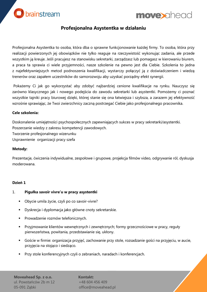Profesjonalna Asystentka w działaniu Profesjonalna Asystentka to osoba, która dba o sprawne funkcjonowanie każdej firmy. To osoba, która przy realizacji powierzonych jej obowiązków nie tylko reaguje na rzeczywistość wykonując zadania, ale przede wszystkim ją kreuje. Jeśli pracujesz na stanowisku sekretarki, zarządzasz lub pomagasz w kierowaniu biurem, a praca ta sprawia ci wiele przyjemności, nasze szkolenie na pewno jest dla Ciebie. Szkolenia to jedna z najefektywniejszych metod podnoszenia kwalifikacji, wystarczy połączyć ją z doświadczeniem i wiedzą trenerów oraz zapałem uczestników do samorozwoju aby uzyskać porządny efekt synergii. Pokażemy Ci jak go wykorzystać aby zdobyć najbardziej cenione kwalifikacje na rynku. Nauczysz się zarówno klasycznego jak i nowego podejścia do zawodu sekretarki lub asystentki. Pomożemy ci poznać wszystkie tajniki pracy biurowej dzięki, której stanie się ona łatwiejsza i szybsza, a zarazem jej efektywność wzrośnie sprawiając, że Twoi zwierzchnicy zaczną postrzegać Ciebie jako profesjonalnego pracownika. Cele szkolenia: Doskonalenie umiejętności psychospołecznych zapewniających sukces w pracy sekretarki/asystentki. Poszerzanie wiedzy z zakresu kompetencji zawodowych. Tworzenie profesjonalnego wizerunku Usprawnienie organizacji pracy szefa Metody: Prezentacje, ćwiczenia indywidualne, zespołowe i grupowe, projekcja filmów video, odgrywanie ról, dyskusja moderowana. Dzień 1 1. Pigułka savoir vivre’u w pracy asystentki Obycie umila życie, czyli po co savoir-vivre? Dyskrecja i dyplomacja jako główne cnoty sekretarskie. Prowadzenie rozmów telefonicznych. Przyjmowanie klientów wewnętrznych i zewnętrznych; formy grzecznościowe w pracy, reguły pierwszeństwa, powitania, przedstawianie się, ukłony. Goście w firmie: organizacja przyjęć, zachowanie przy stole, rozsadzanie gości na przyjęciu, w aucie, przyjęcia na stojąco i siedząco. Przy stole konferencyjnych czyli o zebraniach, naradach i konferencjach. Moveahead Sp. z o.o. Mo ul. Powstańców 2b m 12 05-091 Ząbki Kontakt: +48 604 456 409 [email protected] 2. Asertywny styl komunikacji czyli stanowczość, która nie rani Kiedy asertywność a kiedy dyplomacja? Wybrane techniki asertywne jako główne narzędzie w sytuacjach trudnych. Trudna sztuka odmawiania. Asertywne wyrażanie uczuć. Udzielanie informacji zwrotnych. Formułowanie próśb. 3. Ochrona czasu pracy szefa Prowadzenie kalendarza szefa. Ustalenie zasad współpracy, wzajemnych wymagań i oczekiwań. Uprzedzanie potrzeb szefa, elastyczność i empatia - atuty nowoczesnej sekretarki/asystentki. Ustalanie priorytetów - granice własnej odpowiedzialności w podejmowaniu decyzji. 4. Przygotowanie prezentacji dla szefa Zasady tworzenia profesjonalnej prezentacji. Świadomość celów wystąpienia i środków przekazu. Przygotowanie materiałów, posługiwanie się środkami dydaktycznymi. Dzień2 5. Tworzenie własnego wizerunku i autoprezentacja firmy: Troska o wizerunek własny, wizerunek szefa oraz wizerunek firmy. Elementy własnego wizerunku Złodzieje wizerunku. Kultura wyglądu zewnętrznego: zasady ubierania się do pracy, standardy ubrań, fryzura, obuwie, dodatki. Typy urody a kolory w garderobie, sztuka makijażu. Operowanie ciałem i przestrzenią – zadbanie o wdzięk i estetykę. Moveahead Sp. z o.o. Mo ul. Powstańców 2b m 12 05-091 Ząbki Kontakt: +48 604 456 409 [email protected] 6. Komunikacja interpersonalna – doskonalenie sprawności w porozumiewaniu się: Mechanizmy obronne jako naturalny objaw zablokowanej komunikacji. Cztery płaszczyzny analizy wypowiedzi: płaszczyzna rzeczowa, ujawnianie siebie, ujawnianie relacji wzajemnej, apel czyli słuchanie czworgiem uszu. Modelowanie postawy: ”Ja jestem w porządku – Ty jesteś w porządku”. 7. Jak oswoić stres? Na czym polega mechanizm stresu? Źródła stresu w pracy. Radzenie sobie z napięciami poprzez stosowanie technik relaksacyjnych. Rozwijanie konstruktywnych wzorców myślowych. 8. Sztuka zdrowego pozytywnego myślenia: Jak zadbać o własny poziom motywacji? 12 błędów w myśleniu inteligentnego człowieka. Zasady zdrowego pozytywnego myślenia. Postawy wobec życia i ich przełożenie na sukces zawodowy: optymizm i pesymizm. 9. Zdrowa samoocena kluczem do sukcesu zawodowego: Składniki poczucia własnej wartości. Główne strategie budowania samooceny. Co to znaczy kochać siebie? Więcej masz – więcej dasz, czyli wpływ samooceny na relacje z innymi. W przypadku pytań do dyspozycji pozostaje Izabela Żyłka +48 604 456 409 [email protected] Moveahead Sp. z o.o. Mo ul. Powstańców 2b m 12 05-091 Ząbki Kontakt: +48 604 456 409 [email protected]