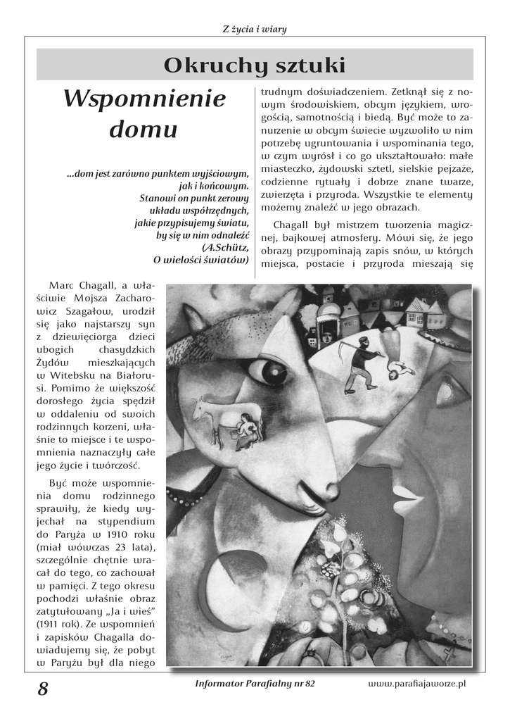 Z życia i wiary Okruchy sztuki Womnienie domu ...dom jest zarówno punktem wyjściowym, jak i końcowym. Stanowi on punkt zerowy układu wółędnych, jakie pypisujemy światu, by się w nim odnaleźć (A.Schütz, O wielości światów) trudnym doświadeniem. Zetknął się z nowym środowiskiem, obcym językiem, wrogością, samotnością i biedą. Być może to zanuenie w obcym świecie wyzwoliło w nim potebę ugruntowania i wominania tego, w ym wyrósł i co go uksztaowało: małe miasteko, żydowski sztetl, sielskie pejzaże, codzienne rytuały i dobe znane twae, zwieęta i pyroda. Wszystkie te elementy możemy znaleźć w jego obrazach. Chagall był mistem twoenia maginej, bajkowej atmosfery. Mówi się, że jego obrazy pypominają zapis snów, w których miejsca, postacie i pyroda mieszają się Marc Chagall, a właściwie Mojsza Zacharowi Szagałow, urodził się jako najstarszy syn z dziewięciorga dzieci ubogich chasydzkich Żydów mieszkających w Witebsku na Białorusi. Pomimo że większość dorosłego życia ędził w oddaleniu od swoich rodzinnych koeni, właśnie to miejsce i te womnienia naznayły całe jego życie i twórość. Być może womnienia domu rodzinnego rawiły, że kiedy wyjechał na stypendium do Paryża w 1910 roku (miał wówas 23 lata), szególnie chętnie wracał do tego, co zachował w pamięci. Z tego okresu pochodzi właśnie obraz zatytułowany „Ja i wieś” (1911 rok). Ze womnień i zapisków Chagalla dowiadujemy się, że pobyt w Paryżu był dla niego 8 Informator Paraalny nr 82 www.parafiajawoe.pl Z życia i wiary i penikają. Nie inaej jest w pypadku obrazu „Ja i wieś”. Wszystko wydaje się tu nierealne. Dominują dwie twae: zielona twa rolnika i łeb kozy, która ogląda na łowieka prawie ludzkim wzrokiem. Wydaje się, że łowiek i koza nie tylko patą na siebie, ale nawet prowadzą rozmowę. Trudno znaleźć wyjaśnienie, dlaego rolnik jest zielony? Dlaego koza ma tak mądre i łagodne ojenie, a na jej pysku pedstawiono kolejną, mniejszą kozę z dojarką? Na pierwszym planie zauważamy, że rolnik tyma w dłoni roślinę, która pypomina małe, świecące dewko. Jesze dziwniejsza wydaje się scena w tle, na której widzimy mężyznę z kosą i kobietę stojącą na głowie i grającą na skypcach. Kompozycję zamyka wiejski pejzaż z kościołem (cerkwią?) w otoeniu niewielkich, kolorowych domków, z których niektóre również stoją do góry nogami… Wszystko to złożone w jeden obraz opatony tytułem, który wiele nam mówi na temat samego aysty. Być może rolnik o zielonej tway to sam aysta oglądający na miejsce swojego dzieciństwa i próbujący ze skrawków womnień, obrazów zatymanych w pamięci i snów odtwoyć atmosferę dzieciństwa, beztroski i rodzinnego ciepła? Obraz zawiera tyle szegółów i tajemnic, że można oglądać go wiele razy i wciąż odkrywać coś nowego. Ja jednak chcę zwrócić uwagę www.parafiajawoe.pl na womnienie domu, które uksztaowało całe twóre życie Marca Chagalla. Pomimo że w Witebsku ędził tylko młodość, to ten właśnie as stał się dla niego najważniejszy, pojawiał się w snach, womnieniach i twórości, to z niego erpał inirację do swojej pracy. Mieszkał w Paryżu i Stanach Zjednoonych, podróżował po całej Europie, wyjechał także do Izræla, a jednak to właśnie rodzinny sztetl, mała wieś zapisała się jako to najważniejsze miejsce, punkt odniesienia dla całego życia. Wydaje się, że bardzo podobną tęsknotę możemy odkryć w śpiewanej pez naszych rodziców i dziadków pieśni: Ojcowski dom to istny raj, dar Ojca niebieskiego, chociażbyś peszedł cały świat, nie znajdziesz piękniejszego. (...) A gdy ci pyjdzie wynijść stąd i odejść w świat daleki, ojcowski dom, dziecino miej w pamięci swej na wieki. Małgoata Łuyna Informator Paraalny nr 82 9