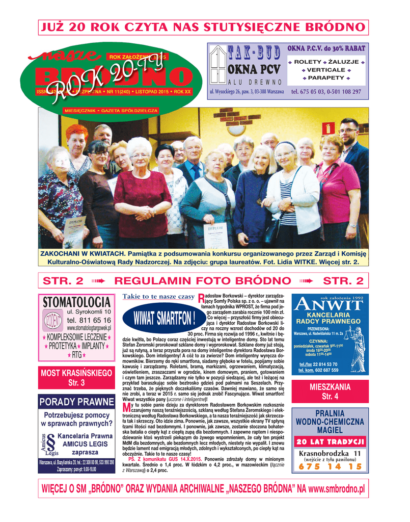 JUŻ 20 ROK CZYTA NAS STUTYSIĘCZNE BRÓDNO TA K- BU D OKNA PCV A L U D R E W N O ul. Wysockiego 26, paw. 3, 03-388 Warszawa OKNA P.C.V. do 30% RABAT v ROLETY v ŻALUZJE v VERTICALE v v PARAPETY v v tel. 675 05 03, 0-501 108 297 ZAKOCHANI W KWIATACH. Pamiątka z podsumowania konkursu organizowanego przez Zarząd i Komisję Kulturalno-Oświatową Rady Nadzorczej. Na zdjęciu: grupa laureatów. Fot. Lidia WITKE. Więcej str. 2. STR. 2 à REGULAMIN FOTO BRÓDNO à STR. 2 STOMATOLOGIA ul. Syrokomli 10 tel. 811 65 16 www.stomatologtargowek.pl H KOMPLEKSOWE LECZENIE H H PROTETYKA H IMPLANTY H H RTG H MOST KRASIŃSKIEGO Str. 3 Takie to te nasze czasy adosław Borkowski – dyrektor zarządzaRłamach jący Somfy Polska sp. z o. o. – ujawnił na tygodnika WPROST, że firma pod je- go zarządem zarabia rocznie 100 mln zł. Co więcej – przyszłość firmy jest obiecująca i dyrektor Radosław Borkowski liczy na roczny wzrost dochodów od 20 do 30 proc. Firma się rozwija od 1996 r., kwitnie i będzie kwitła, bo Polacy coraz częściej inwestują w inteligentne domy. Sto lat temu Stefan Żeromski prorokował szklane domy i wyprorokował. Szklane domy już stoją, już są rutyną, a teraz przyszła pora na domy inteligentne dyrektora Radosława Borkowskiego. Dom inteligentny! A cóż to za zwierze? Dom inteligentny wyręcza domowników. Bierzemy do ręki smartfona, siadamy głęboko w fotelu, popijamy sobie kawusię i zarządzamy. Roletami, bramą, markizami, ogrzewaniem, klimatyzacją, oświetleniem, zraszaczami w ogrodzie, kinem domowym, praniem, gotowaniem i czym tam jeszcze. Zarządzamy nie tylko w pozycji siedzącej, ale też i leżącej na przykład baraszkując sobie beztrosko gdzieś pod palmami na Seszelach. Przyznać trzeba, że pięknych doczekaliśmy czasów. Dawniej mawiano, że samo się nie zrobi, a teraz w 2015 r. samo się jednak zrobi! Fascynujące. Wiwat smartfon! Wiwat wszystkie pany (uczone i inteligentne)! y tu sobie panie dzieju za dyrektorem Radosławem Borkowskim rozkosznie czarujemy naszą teraźniejszością, szklaną według Stefana Żeromskiego i elektroniczną według Radosława Borkowskiego, a ta nasza teraźniejszość jak skrzeczała tak i skrzeczy. Oto idzie zima. Ponownie, jak zawsze, wszystkie ekrany TV spłyną łzami litości nad bezdomnymi. I ponownie, jak zawsze, zostanie stoczona bohaterska batalia o ciepły kąt z ciepłą zupą dla bezdomnych. I zapewne raptem i niespodziewanie ktoś wystrzeli piekącym do żywego wspomnieniem, że cały ten projekt MdM dla bezdomnych, ale bezdomnych lecz młodych, niestety nie wypalił. I znowu będzie lament nad emigracją młodych, zdolnych i wykształconych, po ciepły kąt na obczyźnie. Takie to te nasze czasy! PS. Z komunikatu GUS 14.X.2015. Ponownie zdrożały domy w minionym kwartale. Średnio o 1,4 proc. W łódzkim o 4,2 proc., w mazowieckim (łącznie z Warszawą) o 2,4 proc. WIWAT SMARTFON ! M KANCELARIA RADCY PRAWNEGO PRZENIESIONA: Warszawa, ul. Nadwiślańska 11 m. 2a CZYNNA: poniedziałek, czwartek 900-1100 środa 1830-2000 sobota 1100-1400 tel./fax 22 814 53 70 tel. kom. 602 687 559 MIESZKANIA Str. 4 PRALNIA WODNO-CHEMICZNA MAGIEL 20 LAT TRADYCJI Krasnobrodzka 11 (wejście z tyłu pawilonu) 675 14 15 WIĘCEJ O SM „BRÓDNO” ORAZ WYDANIA ARCHIWALNE „NASZEGO BRÓDNA” NA www.smbrodno.pl 2 Piękny konkurs KOCHAJĄCY KWIATY P owiedzmy tu wprost: mało, nawet bardzo mało, było zgłoszeń do konkursu BRÓDNO W KWIATACH, balkony w kwiatach i ogródki w kwiatach, a przecież Bródno liczy coś około 80 tys. mieszkańców. Jak to rozumieć? Za drogie kwiaty, sadzonki, nasiona? A może susza jako przyczyna? W tym roku do konkursu stanęło zaledwie 38 osób (rodzin). Z Os. „Kondratowicza” – 5 osób, z os. „Podgrodzie” – 14 osób, z os. „Toruńska” – 9 osób, z os. „Wysockiego” – 10 osób. Zespół Komisji Oświatowo-Kulturalnej Rady Nadzorczej po wizytacji i obejrzeniu zgłoszonych ogródków oraz balkonów wydał następujący werdykt: KWIATY NA BALKONACH 6 nagród pierwszych, 5 nagród drugich, 4 nagrody trzecie i 4 wyróżnienia. KWIATY W OGRÓDKACH 6 nagród pierwszych, 6 nagród drugich, 6 nagród trzecich i jedno wyróżnienie. Taki jest ogólny dorobek tych, którzy kochają kwiaty. KWIATY NA BALKONACH Nagrody pierwsze otrzymali! Eugeniusz GRABOWSKI z os. „Kondratowicza” , Monika RUCIŃSKA z os. „Wysockiego”, Leokadia KOBUS i Janina OCHĘDOWSKA z os. „Toruńska” Konrad PAŚNICZEK i Jadwiga RYBKA z os. „Podgrodzie”. KWIATY W OGRÓDKACH Nagrody pierwsze otrzymali! Jolanta i Adam PASZKIEWICZOWIE z os. „Podgrodzie”, Krystyna KAIM i Marta KOWALSKA z os. „Toruńska”, Marzena i Andrzej DANISZ, Czesław i Marianna KASKA oraz Iwona ZIMOWSKA z os. „Wysockiego”. szystkim nagrodzonym i wyróżnionym nagrody zostały wręczone podczas uroczystego wieczoru 1 października w klubie „Lira”. ZATEM – do następnego roku, do następnego spotkania, do następnego konkursu! Już niebwem – od 1 stycznia – słoneczko zacznie krążyć coraz wyżej zwiastując przedwiośnie, a z przedwiośniem i z wiosną zaczyna się czas kwiatów. Szanowni laureaci! Propagujcie kwiaty pośród sąsiadów! Szanowne Komitety Kolonii! Pamiętajcie również o kwiatach! W WYBORY! à WYBORY! à WYBORY! à WYBORY! ie tylko odkryciami naukowymi, nie tylko armatami, ale i obywatelską kartką wyborczą – wbrew gadulstwu wielu mądrali – można zmieniać świat. Dowód: wybory prezydenckie i parlamentarne. Zaledwie w ciągu kilkunastu godzin 25 października wyborcy wynieśli do władzy dotychczas przez osiem lat opozycyjny PiS i – uwaga!!! – zmiotły ze sceny parlamentarnej zjednoczoną lewicę, a będący w wielu koalicyjnych rządach PSL został zmarginalizowany do pozycji szczątkowej. Symbolem tych zmian będzie nieobecność w sejmie byłych premierów: Waldemara Pawlaka, Leszka Millera i Janusza Piechocińskiego. Prawdziwa demokracja a nie fikcyjna, była i będzie z