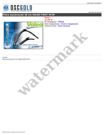 Informacje o produkcie Utworzono 02-03-2017 Pióro wycieraczki 38 cm VALEO FIRST VF38 Cena : 12,00 zł er m ar k Nr katalogowy : FRB38 Stan magazynowy : brak w magazynie Średnia ocena : brak recenzji w at 575535 Pióro wycieraczki 35 cm VALEO FIRST VF35 Wygenerowano w programie www.oscGold.com