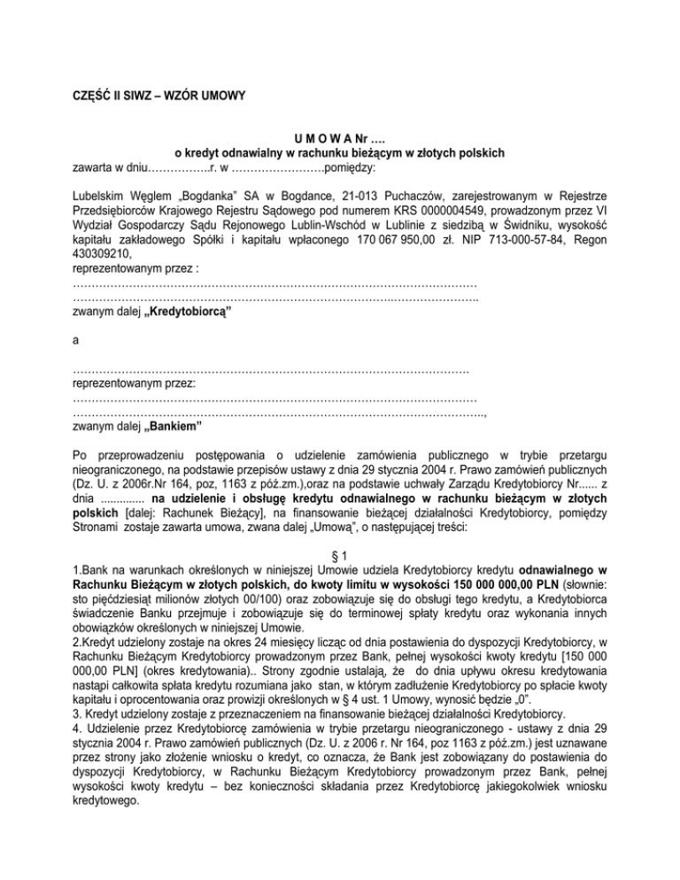 CZĘŚĆ II SIWZ – WZÓR UMOWY U M O W A Nr …. o kredyt odnawialny w rachunku bieżącym w złotych polskich zawarta w dniu……………..r. w …………………….pomiędzy: Lubelskim Węglem „Bogdanka” SA w Bogdance, 21-013 Puchaczów, zarejestrowanym w Rejestrze Przedsiębiorców Krajowego Rejestru Sądowego pod numerem KRS 0000004549, prowadzonym przez VI Wydział Gospodarczy Sądu Rejonowego Lublin-Wschód w Lublinie z siedzibą w Świdniku, wysokość kapitału zakładowego Spółki i kapitału wpłaconego 170 067 950,00 zł. NIP 713-000-57-84, Regon 430309210, reprezentowanym przez : ……………………………………………………………………………………………… …………………………………………………………………………..………………….. zwanym dalej „Kredytobiorcą” a ……………………………………………………………………………………………. reprezentowanym przez: ……………………………………………………………………………………………… ……………………………………………………………………………………………….., zwanym dalej „Bankiem” Po przeprowadzeniu postępowania o udzielenie zamówienia publicznego w trybie przetargu nieograniczonego, na podstawie przepisów ustawy z dnia 29 stycznia 2004 r. Prawo zamówień publicznych (Dz. U. z 2006r.Nr 164, poz, 1163 z póź.zm.),oraz na podstawie uchwały Zarządu Kredytobiorcy Nr...... z dnia .............. na udzielenie i obsługę kredytu odnawialnego w rachunku bieżącym w złotych polskich [dalej: Rachunek Bieżący], na finansowanie bieżącej działalności Kredytobiorcy, pomiędzy Stronami zostaje zawarta umowa, zwana dalej „Umową”, o następującej treści: §1 1.Bank na warunkach określonych w niniejszej Umowie udziela Kredytobiorcy kredytu odnawialnego w Rachunku Bieżącym w złotych polskich, do kwoty limitu w wysokości 150 000 000,00 PLN (słownie: sto pięćdziesiąt milionów złotych 00/100) oraz zobowiązuje się do obsługi tego kredytu, a Kredytobiorca świadczenie Banku przejmuje i zobowiązuje się do terminowej spłaty kredytu oraz wykonania innych obowiązków określonych w niniejszej Umowie. 2.Kredyt udzielony zostaje na okres 24 miesięcy licząc od dnia postawienia do dyspozycji Kredytobiorcy, w Rachunku Bieżącym Kredytobiorcy prowadzonym przez Bank, pełnej wysokości kwoty kredytu [150 000 000,00 PLN] (okres kredytowania).. Strony zgodnie ustalają, że do dnia upływu okresu kredytowania nastąpi całkowita spłata kredytu rozumiana jako stan, w którym zadłużenie Kredytobiorcy po spłacie kwoty kapitału i oprocentowania oraz prowizji określonych w § 4 ust. 1 Umowy, wynosić będzie „0”. 3. Kredyt udzielony zostaje z przeznaczeniem na finansowanie bieżącej działalności Kredytobiorcy. 4. Udzielenie przez Kredytobiorcę zamówienia w trybie przetargu nieograniczonego - ustawy z dnia 29 stycznia 2004 r. Prawo zamówień publicznych (Dz. U. z 2006 r. Nr 164, poz 1163 z póź.zm.) jest uznawane przez strony jako złożenie wniosku o kredyt, co oznacza, że Bank jest zobowiązany do postawienia do dyspozycji Kredytobiorcy, w Rachunku Bieżącym Kredytobiorcy prowadzonym przez Bank, pełnej wysokości kwoty kredytu – bez konieczności składania przez Kredytobiorcę jakiegokolwiek wniosku kredytowego. §2 1. Bank zobowiązany jest postawić do dyspozycji Kredytobiorcy pełną wysokość kwoty kredytu objętego Umową, t.j.150 000 000,00 PLN (słownie: sto pięćdziesiąt milionów złotych 00/100) w pierwszym roboczym dniu po: zawarciu Umowy, otwarciu w Banku Rachunku Bieżącego Kredytobiorcy, ustanowieniu przez Kredytobiorcę zabezpieczeń kredytu określonych w § 6 ust. 1 Umowy, przedłożeniu Bankowi przez Kredytobiorcę: zabezpieczeń kredytu, o których mowa w § 6 ust. 1 lit. a i b Umowy, a także poświadczonych za zgodność z oryginałem przez Kredytobiorcę odpisów: zawiadomienia dłużnika wierzytelności o cesji wierzytelności, o której mowa w § 6 ust. 1 lit. c) Umowy wraz z potwierdzeniem wpływu tego zawiadomienia do dłużnika wierzytelności oraz zgody dłużnika wierzytelności na dokonanie przez Kredytobiorcę cesji wierzytelności , o której mowa w § 6 ust 1 lit. c) Umowy . O postawieniu do dyspozycji Kredytobiorcy pełnej wysokości kwoty kredytu objętego Umową, Bank zobowiązany jest zawiadomić Kredytobiorcę za pośrednictwem poczty elektronicznej e-mail na adres ……………………,w dniu w którym pełna wysokość kwoty kredytu objętego Umową została postawiona do dyspozycji Kredytobiorcy. 2. Kwota kredytu jest oprocentowana w stosunku rocznym według zmiennej stopy procentowej, przy czym oprocentowanie będzie naliczane i pobierane przez Bank wyłącznie od faktycznie wykorzystanej kwoty kredytu. Stopa procentowa równa jest wysokości stawki referencyjnej, powiększonej o stałą marżę Banku. 3. Stawkę referencyjną stanowi WIBOR – 1M, oznaczający stopę procentową dla międzybankowych depozytów 1-miesięcznych, publikowaną na stronie serwisu Reuters w dniu: pierwszego, chociażby częściowego wykorzystania kredytu przez Kredytobiorcę [dla pierwszego okresu odsetkowego] oraz w pierwszym dniu poszczególnych, kolejnych okresów odsetkowych, to jest okresów, za które należne Bankowi oprocentowanie od kwoty faktycznie wykorzystanych środków z kredytu w danym miesiącu kalendarzowym, będzie naliczane i spłacane. Jeśli zaś pierwszy dzień miesiąca przypada w dniu wolnym od pracy, stosuje się stawkę referencyjną z najbliższego dnia roboczego (z wyłączeniem sobót), następującego po tym dniu, w przypadku, gdy pierwszy dzień miesiąca przypada w sobotę, stosuje się stawkę referencyjną z ostatniego dnia roboczego poprzedzającego pierwszy dzień okresu odsetkowego.” 4. Marża Banku jest stała w okresie obowiązywania Umowy i wynosi on