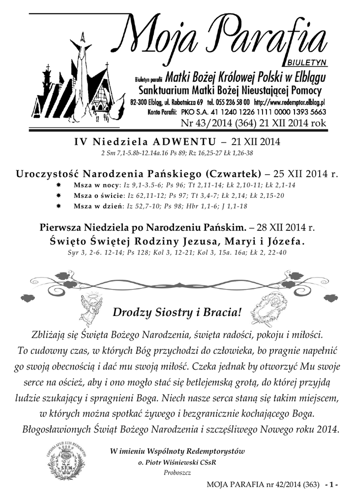 Nr 43/2014 (364) 21 XII 2014 rok I V N i e d z i e l a A D W E N T U – 21 XII 2014 2 Sm 7,1-5.8b-12.14a.16 Ps 89; Rz 16,25-27 Łk 1,26-38 Uroczystość Narodzenia Pańskiego (Czwartek) – 25 XII 2014 r. Msza w nocy: Iz 9,1-3.5-6; Ps 96; Tt 2,11 -14; Łk 2,10-11; Łk 2,1-14 Msza o świcie: Iz 62,11-12; Ps 97; Tt 3,4-7; Łk 2,14; Łk 2,15-20 Msza w dzień: Iz 52,7-10; Ps 98; Hbr 1,1-6; J 1,1-1 8 Pierwsza Niedziela po Narodzeniu Pańskim. – 28 XII 2014 r. Święto Świętej Rodziny Jezusa, Maryi i Józefa . Syr 3, 2-6. 12-14; Ps 128; Kol 3, 12-21; Kol 3, 15a. 16a; Łk 2, 22 -40 Drodzy Siostry i Bracia! Zbliżają się Święta Bożego Narodzenia, święta radości, pokoju i miłości. To cudowny czas, w których Bóg przychodzi do człowieka, bo pragnie napełnić go swoją obecnością i dać mu swoją miłość. Czeka jednak by otworzyć Mu swoje serce na oścież, aby i ono mogło stać się betlejemską grotą, do której przyjdą ludzie szukający i spragnieni Boga. Niech nasze serca staną się takim miejscem, w których można spotkać żywego i bezgranicznie kochającego Boga. Błogosławionych Świąt Bożego Narodzenia i szczęśliwego Nowego roku 2014. W imieniu Wspólnoty Redemptorystów o. Piotr Wiśniewski CSsR Proboszcz MOJA PARAFIA nr 42/2014 (363) - 1 - Intencje mszalne 22 – 28 XII 2014 6:00 08:00 18:30 6:00 08:00 18:30 6:00 8:00 22:00 24:00 7:00 8:30 10:00 11.30 13.00 16.30 18.30 7:00 8:30 10:00 11:30 13:00 16:30 18:30 Poniedziałek 22 XII 1 Sm 1,24-28 Ps: 1 Sm 2 Łk 1,46-56 1. + Alina Ostaszewska 1. + Tadeusz i zm. rodzice i teściowie 2. Edward Leszczyński , Marta, Balbina, Stanisława Karpińscy, i zm. z rodz. Wierzchowskich 1. Int. Zbiorowa w int. rodziny 2. Dziękczynno - błagalna w int. Róży Różańcowej Wtorek 23 XII Ml 3,1-4.23-24 Ps 25 Łk 1,57-66 1. + Michał i Janina Bonderewscy 1. Int. zbiorowe Środa 24 XII 2 Sm 7,1-5.8b-12.14a.16 Ps 89 Łk 1,67-79 1. 1. + Daniela Jastrzębska 1 r. śm. 2. + Stanisław Konsalik 1. + Jan Klimuk 2. + Jan Chrobocinski, Teresa, Józef 3. + Za zmarłych z rodz. 4. + Marianna, Józef, Jan, Godlewscy 1. + Antoni, Zbigniew Barscy i zm, Zenona Nieżurawskiego 2. + W int. Parafii 3. + Adam Ścieszko i Helena Potrowska Czwartek 25 XII Iz 52, 7-10; Ps 98; Hbr 1, 1-6; J 1, 1-18 1. + Stanisław 1. + Waldemar Teresiński 2. + Ryszard Stefanowicz, Leon, Zofia, Heny, i zm. z rodz Kozińskich 1 . + W int. Jadwigi i Stefana w 50 rocz. ślubu 1. + Romuald Kownacki ; 2. + Albina i Tadeusz Leszczyńscy 1. W int. Zofii i Juliana Delegacz w 50 r. ślubu 2. W int. Zofi i Janusza w 50 rocz. ślubu 3. W int. Jadwigi i Kazimierza Kupczyńskich w 50 r. ślubu 1. + Jan Romanowicz i zm. z rodz. Piątek 26 XII 2 Dz 6,8-10;7,54-60 Ps 31 Mt 10,17-22 1. + Iren, Eugeniusz Kulwiccy Tadeusz Dulkowski 1. + Zdzisław Boniacki zm . z rodz. Mech i Bonieckich 2. + Leokadia, Lewadnowscy i zm. rodz. Lewandowscy i Dylewscy 1. W int. Beaty i Arkadiusza Borkowscy 25r. ślubu ; 2. W int. Marii i Jerzego Zarębscy w 50 r. ślubu 1. + Kunegunda Osak; 2. W int. Haliny i Zdzisława Komorowscy 70 r. ślubu Chrzty 1. + Zajączkowski Jan i Sabina, Henryk, Maria i Franciszka, Jankiweicz Jan i Maria, Czajkowska Helena i Henryk 1.+ Alfreda, Stanisław, Zbigniew i Kazimierz Korzeniewski Sobota 27 XII 1 J 1,1-4 Ps 97 J 20,2-8 7:00 8:00 11:00 18:00 7:00 8:30 10:00 11:30 13:00 16:30 18:30 1. + Alfons Lemczyk, Klara, Elżbieta, Edmund, JKózef, Jan, Wiktoria i zm. z rodz. Lenczyk i Maciejewskich 2. + Henryk Rudzianiec, i zm. rodzice i Ryszard i Halina 1. W int. Ojca Św. 2. + Jerzy Korzeniewski 1. + Franciszek Genge 1 m-c po śm. 2. + Alfons, Irena, Zenon, Ryszard, Kazimierz Sikora, Jarosław Słodczyk i zm. z rodz. Niedziela 28 XII Syr 3,2-6.12-14 Ps 128 Kol 3,12-21 Łk 2,22-40 1. 1. + Stanisław 2. + Zofia, Stanisław Aleszczyk 1. Dziękczynno błag. w. int. Kazimierza i Teresy 2. Edward Szewczyk 1. + Albina Komorowska i Albin Komorowski 2. + Edward Kowalski 1. r. śm. zm. rodzice Szustowicz 1. Stanisława i Kazimierz Olczyk w 50 r. ślubu oraz Elżbieta I Zbigniew Pisalewicz w 30 r,. ślubu 2. W int. Parafi 1. + Stanisław Pietrzykowicz i zm. rodziców i teściów 1. + Danutę JAczun oraz zmarłe trojaczki Karolinę, Otylie i Łucję MOJA PARAFIA nr 43/2014 (364) Do użytku wewnętrznego - 2 - Intencje mszalne 29 XII – 4 I 2015 6:00 08:00 18:30 7:00 8:00 18:30 7:00 8:00 28:00 7:00 8:30 10:00 11.30 13.00 16.30 18.30 7:00 8:30 18:00 7:00 8:00 11:00 18:00 7:00 8:30 10:00 11:30 13:00 16:30 18:30 Poniedziałek 29 XII 1. 1. Krystyna i Ryszard Dziedziccy Stanisława, Korneliusz Kokoszko 1. Kamil, dziadkowie izm. Z rodz.Luba, Marciniak 2. Bogumiła Czajkowska w 1. r. śm. Wtorek 30 XII 1. + Ryta Koleśnik 2. Int. zbiorowe Środa 31 XII 2. 1 J 2,3-11 Ps 96 Łk 2,22-35 1 J 2,12-17 Ps 96 Łk 2,36-40 Józef, Pokiński i zm. z rodziny Pokońskich i Stefanioszów 1 J 2,18-21 Ps 96 J 1,1-18 1. + Adam, Karoilna, Stanisław,zm. z rodz. Wnęków i Łowczyńskich 1. W int. Parafii 2. + Sylwester Rodmer 3. + Maria Orzeszek Czwartek 1 I 2015 Lb 6,22-27 Ps 67 Ga 4,4-7 Łk 2,16-21 1. O zdrowie dla Genowefy 2. + Jan Przasnyski i zm. z rodz 1. + Stanisłąwa Zamaro i zm. z rodz. 2. + Leokadia Ostrowska gr.1 1. + Antoni Hryciak 2. +Kazimierz Zagroba 3. +Barbara Gryciuk 1. + Zdzisław Durzyński gr.1 1. +Jadwiga Gulbertowcz 1. + Krystyna Kołodziejczyk Piątek 2 I 2015 1 J 2,22-28 Ps 98 J 1,19-28 1. + Zdzisław Durzyński gr.2 1. + Leokadia Ostrowska gr.2 1. Przebłagalna za grzechy ludzkości Sobota 3 I 2015 1 J 2,29-3,6 Ps 98 J 1,29-34 1. + Zdzisław Durzyński gr.3 1. + Jan Szpakowski 2. + Leokadia Ostrowska gr.3 1. W int. Biskupa Elbląskiego 2. + Henryk Szulc 3. + Marianna Słodulska 1. + Robert Pieczyński Niedziela 4 I 2015 Syr 2 4 ,1-2.8 -1 2 Ps 1 47 Ef 1 ,3-6 .1 5-18 J 1 ,1 -1 8 1. + Zdzisław Durzyński gr.4 2. + Leokadia Ostrowska gr. 4 1. + Anastazja, Walerian, Longin, Jerzy i zm. z rodz. Chochowskich 2. + W int. Stanisławy i Karzimierza Olczyk w 50 r. ślubu 1. + Izabela Łodygowska or