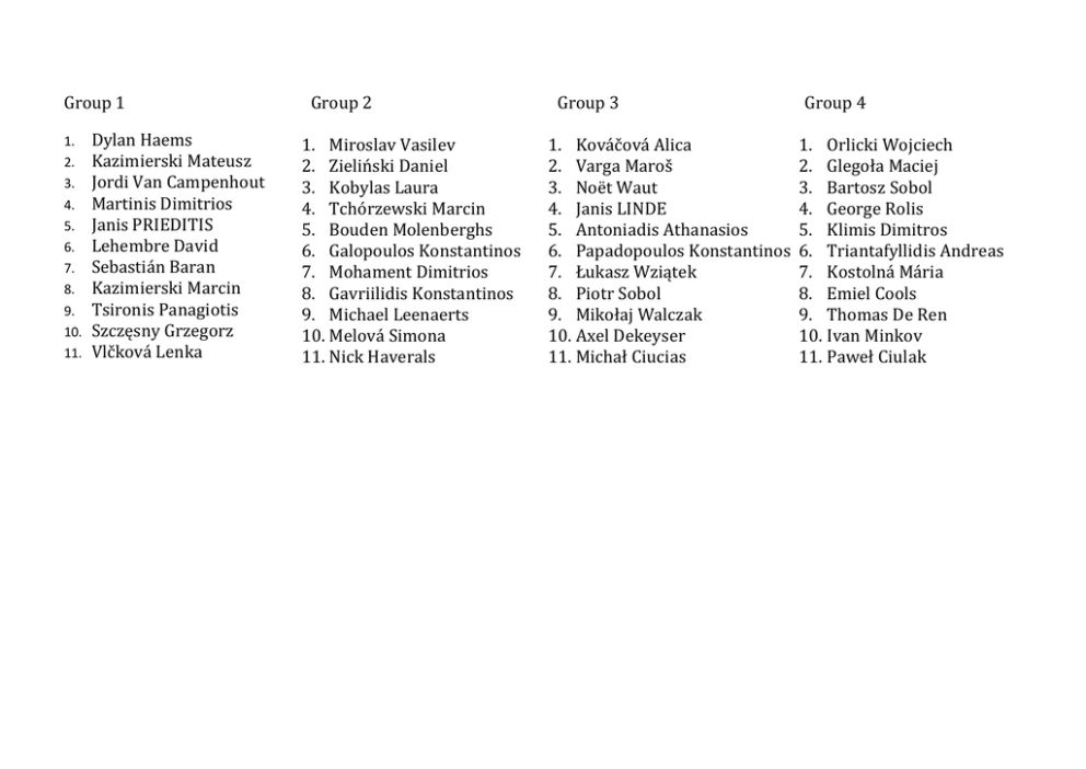 Group 1 1. 2. 3. 4. 5. 6. 7. 8. 9. 10. 11. Dylan Haems Kazimierski Mateusz Jordi Van Campenhout Martinis Dimitrios Janis PRIEDITIS Lehembre David Sebastián Baran Kazimierski Marcin Tsironis Panagiotis Szczęsny Grzegorz Vlčková Lenka Group 2 1. Miroslav Vasilev 2. Zieliński Daniel 3. Kobylas Laura 4. Tchórzewski Marcin 5. Bouden Molenberghs 6. Galopoulos Konstantinos 7. Mohament Dimitrios 8. Gavriilidis Konstantinos 9. Michael Leenaerts 10. Melová Simona 11. Nick Haverals Group 3 1. Kováčová Alica 2. Varga Maroš 3. Noët Waut 4. Janis LINDE 5. Antoniadis Athanasios 6. Papadopoulos Konstantinos 7. Łukasz Wziątek 8. Piotr Sobol 9. Mikołaj Walczak 10. Axel Dekeyser 11. Michał Ciucias Group 4 1. Orlicki Wojciech 2. Glegoła Maciej 3. Bartosz Sobol 4. George Rolis 5. Klimis Dimitros 6. Triantafyllidis Andreas 7. Kostolná Mária 8. Emiel Cools 9. Thomas De Ren 10. Ivan Minkov 11. Paweł Ciulak