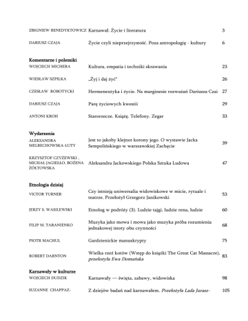 ZBIGNIEW BENEDYKTOWICZ Karnawał. Życie i literatura 3 DARIUSZ CZAJA Życie czyli nieprzejrzystość. Poza antropologię - kultury 6 WOJCIECH MICHERA Kultura, empatia i techniki skrawania 23 WIESŁAW SZPILKA „Żyj i daj żyć" 26 CZESŁAW ROBOTYCKI Hermeneutyka i życie. Na marginesie rozważań Dariusza Czai 27 DARIUSZ CZAJA Parę życiowych kwestii 29 ANTONI KROH Starorzecze. Książę. Telefony. Zegar 33 ALEKSANDRA MELBECHOWSKA-LUTY Jest to jakoby klejnot korony jego. O wystawie Jacka Sempolińskiego w warszawskiej Zachęcie 39 KRZYSZTOF CZYŻEWSKI , MlCHAŁ JAGIEŁŁO, BOŻENA ŻÓŁTOWSKA Aleksandra Jackowskiego Polska Sztuka Ludowa 47 VlCTOR TURNER Czy istnieją uniwersalia widowiskowe w micie, rytuale i teatrze. Przełożył Grzegorz Janikowski 53 JERZY S. WASILEWSKI Etnolog w podróży (3). Ludzie tajgi, ludzie rena, ludzie 60 FILIP M. TARANIENKO Muzyka jako mowa i mowa jako muzyka próba rozumienia jednakowej istoty obu czynności 68 PIOTR MACHUL Gardzienickie manuskrypty 75 ROBERT DARNTON Wielka rzeź kotów (Wstęp do książki The Great Cat Massacre), 83 przełożyła Ewa Domańska Komentarze i polemiki Wydarzenia Etnologia dzisiaj Karnawały w kulturze WOJCIECH DUDZIK Karnawały — święta, zabawy, widowiska 98 SUZANNE CHAPPAZ- Z dziejów badań nad karnawałem. Przełożyła Lada Jurasz- 105 WIRTHNER Dudzik DIETZ-RÜDIGER MOSER Jedenaście tez o karnawale. Przełożyła Marta Pietrzykowska UMBERTO ECO Komizm - „wolność" - karnawał. Przełożył Włodzimierz Karol 132 Pessel RUSTAM KASIMOW Poetyka karnawału i obrzędów przejścia. Rozmyślania nad pojęciem „karnawał". Przełożyła Barbara Chmielewska 137 KARL KERENYI Człowiek i maska. Przełożyła Anna Kryczyńska-Pham 141 ÅSA BOHOLM Weneckie widowiska karnawałowe w maskach. Przełożyła Justyna Jaworska 147 VICTOR TURNER Karnawał, rytuał i zabawa w Rio de Janeiro, przełożyła Iwona 159 Kurz RORERTO DAMATTA Karnawał równości i karnawał hierarchii. Przełożyła Marta Kolankiewicz 171 HOLLIS URBAN LIVERPOOL Źródła rytuałów i zwyczajów karnawałowych w Trynidadzie; Afryka czy Europa? Przełożył Błażej Dzikowski 183 MACIEJ ROŻALSKI Salvador, miasto Capoeira 193 ANNA E. KUBIAK Sztuka New Age 202 DOROTA HALL God Loves Fun. Rola śmiechu w kulturze New Age 211 MAŁGORZATA JUST „Sztuka Przebudzonych" - między magią i transcendencją. Ezoteryczna twórczość plastyczna w kręgach New Age 223 MAŁGORZATA BARANOWSKA Kolekcja nieidealna (2). Jestem tutaj 237 ANDRZEJ PIEŃKOS Dom artysty - relikwiarz twórczości: muzeum Johna Soane'a 241 JAN GONDOWICZ Gwiazda Piołun 247 130 New age MARIUSZ CZAJA „Koniec Świata, choroba i sąd ostateczny". Apokaliptyczne historie Tadeusza Słobodzianka 249 ROBERT KULPA Karnawał? Kamp i gender w Drag Queen Show 263 ALEKSANDRA BANASZKIEWICZ, MAGDALENA RADKOWSKA, TOMASZ RAKOWSKI Więdnięcie. Twórcy i trupy. Wstęp do antropologii gruźlicy 273 WŁODZIMIERZ KAROL PESSEL Melanezyjczycy Versus Farmerzy CONTENTS ZBIGNIEW BENEDYKTOWICZ Carnival. Life and Literature DARIUSZ CZAJA Life or Non-transparency. Beyond the Anthropology of Culture Commentaries and Polemics WOJCIECH MICHERA The Culture, Empathy and Technics of Slicing up WIESŁAW SZPILKA Live and Let Live CZESŁAW ROBOTYCKI Hermeneutics and Life. On the Margins of Dariusz Czaja's Considerations DARIUSZ CZAJA A few Questions concerning Life ANTONI KROH The Old River Valley. The Prince. Telephones. The Clock Events ALEKSANDRA MELBECHOWSKA-LUTY Akin to a Jewel in His Crown KRZYSZTOF CZYŻEWSKI , MlCHAŁ JAGIEŁŁO, Polish BOŻENA ŻÓŁTOWSKA Folk Art by Aleksander Jackowski Ethnology Today VlCTOR TURNER Are there Universals of Performance in Myth, Ritual, and Drama? JERZY S. WASILEWSKI Travelling Ethnology (3). The Reindeer-People, the Taiga-People, Just People FILIP M. TARANIENKO Music as Speech and Speech as Music: an Essay for Comprehension of the Same Nature of Both Activities PIOTR MACHUL The Gardzienice Manuscripts ROBERT DARNTON Introduction to the Great Cat Massacre Carnivals in culture WOJCIECH DUDZIK Carnivals - Festivities, Plays, Spectacles SUZANNE CHAPPAZWIRTHNER From the History of Research on the Carnival DIETZ-RÜDIGER MOSER Eleven Carnival Theses UMBERTO ECO The Frames of Comic „Freedom" RUSTAM KASIMOW The Poetic of the Carnival and the Transition Rites KARL KERENYI Man and Mask ÅSA BOHOLM Masked Performances in the Carnival of Venice VICTOR TURNER Carnival, Ritual and Play in Rio de Janeiro RORERTO DAMATTA The Carnival of Equality and the Carnival of Hierarchy HOLLIS URBAN LIVERPOOL Origins of Carnival Rites in Trinidad; Africa or Europe? MACIEJ ROŻALSKI Salvador, the Town of Capoeira New age ANNA E. KUBIAK New Age Art DOROTA HALL God Loves Fun. The Role of Laughter in New Age Culture MAŁGORZATA JUST "Art of the Awakened" - Between Magic and Transcendence. Esoteric Art within New Age Circles MAŁGORZATA BARANOWSKA The Postcard. I Was Here ANDRZEJ PIEŃKOS The Artist's Home - a Reliquary of Creativity: the John Soane Museum JAN GONDOWICZ The Wormwood Star MARIUSZ CZAJA The End of the World, Illness and Terrible Doomsday. Apocalyptic Stories by Tadeusz Słobodzianek ROBERT KULPA Carnival? Camp and Gender in Drag Queen Show ALEKSANDRA BANASZKIEWICZ, MAGDALENA RADKOWSKA, TOMASZ RAKOWSKI Withering. Creators and Cadavers. An Introduction to the Anthropology of Tuberculosis WŁODZIMIERZ KAROL PESSEL Melanesians versus Farmers