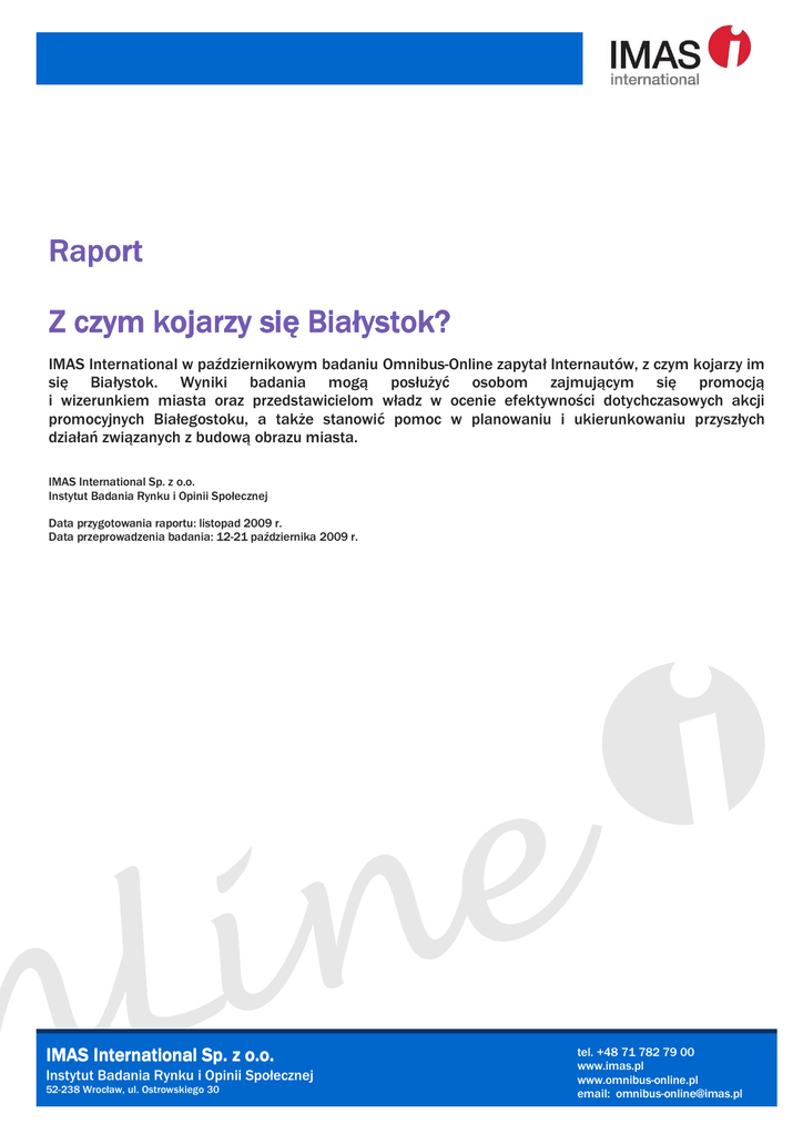 Raport Z czym kojarzy kojarzy się Białystok? Białystok? IMAS International w październikowym badaniu Omnibus-Online zapytał Internautów, z czym kojarzy im się Białystok. Wyniki badania mogą posłuŜyć osobom zajmującym się promocją i wizerunkiem miasta oraz przedstawicielom władz w ocenie efektywności dotychczasowych akcji promocyjnych Białegostoku, a takŜe stanowić pomoc w planowaniu i ukierunkowaniu przyszłych działań związanych z budową obrazu miasta. IMAS International Sp. z o.o. Instytut Badania Rynku i Opinii Społecznej Data przygotowania raportu: listopad 2009 r. Data przeprowadzenia badania: 12-21 października 2009 r. IMAS International Sp. z o.o. Instytut Badania Rynku i Opinii Społecznej 52-238 Wrocław, ul. Ostrowskiego 30 tel. +48 71 782 79 00 www.imas.pl www.omnibus-online.pl email: [email protected] Badania IMAS International prowadzone we październiku 2009 na reprezentatywnej próbie 513 uŜytkowników Internetu w wieku od 18 do 54 lat mogą pomóc osobom zajmującym się tworzeniem oraz korzystaniem z wizerunku Białegostoku. Wyniki pozwalają odpowiedzieć na pytania - jakie spontaniczne skojarzenia wywołuje nazwa „Białystok”, w jakim stopniu są one zróŜnicowane, jakich obszarów tematycznych dotyczą oraz które skojarzenia dominują. Białystok kojarzy się głównie z warunkami geograficznymi, przyrodą, sportem oraz Krzysztofem Kononowiczem. Co czwarty internauta nie ma Ŝadnych skojarzeń. OmnibusOmnibus-Online to regularne, comiesięczne badanie wielotematyczne, prowadzone na reprezentatywnej dla uŜytkowników Internetu próbie n=500 osób w wieku 18 - 54 lat. Białystok przywodzi na myśl wiele zróŜnicowanych skojarzeń (aŜ 17% wypowiedzi była zbyt zróŜnicowana, by dało się je skategoryzować w większe grupy). W ogólnopolskim wizerunku Białegostoku brak jednoznacznego symbolu / skojarzenia. Dominujące obszary związane są z warunkami klimatycznymi, połoŜeniem miasta na mapie Polski i Europy, sportem oraz osobą byłego kandydata na prezydenta miasta - Krzysztofa Kononowicza. Trzech na czterech (77%) internautów ma jakiekolwiek skojarzenia z Białymstokiem. Wśród osób, którym Białystok z czymś się kojarzy, zdecydowana większość kojarzy z miastem coś specyficznego (np. połoŜenie miasta, konkretne miejsca, osoby). Odsetek odpowiedzi, które mogłyby dotyczyć równieŜ innych miejsc w Polsce (np. „znajomi, którzy tam mieszkają”, „filia mojej firmy”) wynosi łącznie 5%. Białystok to miasto na krańcach Polski. Panują tam mrozy. Najsilniejsza grupa skojarzeń odnosi się do warunków klimatycznych oraz połoŜenia w północnowschodniej części Polski. Skojarzenia dotyczące zimna, mrozu, zimy i śniegu 10% internautów. Białystok to miasto na wschodzie (4%) i północy (1%) kraju, niedaleko granicy z Białorusią, Litwą a takŜe Ukrainą (łącznie 2%). Białystok to przyroda. Internauci kojarzą Białystok ze środowiskiem naturalnym, co moŜna tłumaczyć jego połoŜeniem oraz samą nazwą miasta. Zwierzę, które kojarzy się na hasło „Białystok” to Ŝubr, wymieniany sporadycznie przez 5% internautów. Inne skojarzenia to puszcza – ogólnie, Puszcza Białowieska i Knyszyńska (łacznie 4%). Inne skojarzenia to lasy, parki, zieleń (łącznie 3%) oraz hasła związane z nazwą miasta - białe zbocze, stok, stok góry, ośnieŜony stok (łącznie 3%). W Białymstoku gra się w piłkę noŜną. Kolejna grupa skojarzeń to sport a konkretnie piłka noŜna wymieniana przez 10% internautów. Skojarzenia z tej grupy to: klub sportowy Jagiellonia, piłna noŜna, „jaga”, konkretni piłkarze (Sobolewski,, Piekarski, Wasiluk) Najbardziej znany wśród internautów białostoczanin – Krzysztof Kononowicz. Osiem procent internautów na hasło Białystok wymienia spontanicznie byłego kandydata na prezydenta miasta w 2006 Krzysztofa Kononowicza. Niektórzy potrafią zacytować z pamięci tekst piosenki wyborczej „bo miasto to Białystok”. Kononowicz to najczęściej wymieniana przez internautów osoba związana z miastem. Białystok to równieŜ kultura. kultura. Stąd pochodzą osoby znane znane z TV. Taniec, tancerze – ogólnie, tancerze z programu „"You can Dance" to najsilniejsze skojarzenia związane z kulturą i TV (łacznie 4%). Spontanicznie wymieniani są równieŜ celebryci wywodzący się z tego miasta: IMAS International Sp. z o.o. Instytut Badania Rynku i Opinii Społecznej 52-238 Wrocław, ul. Ostrowskiego 30 O IMAS International IMAS International (www.imas.pl) od 1994 roku zajmuje się profesjonalnymi badaniami rynku i opinii społecznej w Polsce. Od 2005 roku realizuje badania przez Internet, m.in. wśród uczestników internetowego panelu badawczego IMAS OnLine (www.imasonline.pl). tel. +48 71 782 79 00 www.imas.pl www.omnibus-online.pl email: [email protected] Scorupco, Małaszyński, Hołownia, Maciąg (łącznie 2%). Białystok kojarzy się równieŜ – choć sporadycznie – z językiem esperanto i jego twórcą, białostoczaninem Ludwikiem Zamenhofem (łącznie 1%). Białystok to równieŜ równieŜ – choć bardzo słabo kojarzone – zabytki i atrakcje turystyczne miasta. miasta. W mieście moŜna zwiedzać pałac Branickich (3%) oraz inne miejsca i obiekty: Kościół św. Rocha, Dom Napoleona, Rynek (łącznie 2%). OmnibusOmnibus-Online to regularne, comiesięczne badanie wielotematyczne, prowadzone na reprezentatywnej dla uŜytkowników Internetu próbie n=500 osób w wieku 18 - 54 lat. Inne skojarzenia Inne, słabsze skojarzenia to (polskie, małe) miasto (3%), Podlasie, woj. podlaskie (2%), Polska "B", zaścianek, bieda, zacofanie (łącznie 4%), Prawosławie, cerkwie, religie (łącznie 3%), uczelnie, miasto studenckie, Ŝycie studenckie (łacznie 3%), wschodni akcent, "zaciąganie", gwara, „śledzikowanie” (2%), ładne, piękne miasto (1%), Piwo śubr (1%), wódka, Polmos, śubrówka (łącznie 1%), lecznictwo, szpitale, AM (łącznie 1%).