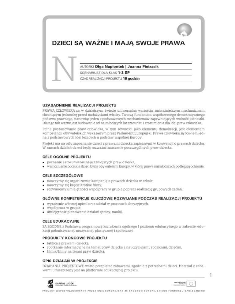 DZIECI SĄ WAŻNE I MAJĄ SWOJE PRAWA N AUTORKI Olga Napiontek | Joanna Pietrasik SCENARIUSZ DLA KLAS 1-3 SP CZAS REALIZACJI PROJEKTU 16 godzin UZASADNIENIE REALIZACJI PROJEKTU PRAWA CZŁOWIEKA są w dzisiejszym świecie uniwersalną wartością, najważniejszym mechanizmem chroniącym jednostkę przed nadużyciami władzy. Tworzą fundament współczesnego demokratycznego państwa prawnego, stanowiąc jeden z podstawowych mechanizmów zapewniających wolność jednostki. Dlatego tak ważne jest budowanie od najmłodszych lat szacunku i zrozumienia dla idei praw człowieka. Pełne poszanowanie praw człowieka, w tym równości jako elementu demokracji, jest elementem kompetencji obywatelskich wskazanym przez Parlament Europejski. Prawa człowieka są bowiem jedną z podstawowych idei leżących u podstaw wspólnej Europy. Projekt ma na celu zapoznanie dzieci z prawami dziecka zapisanymi w konwencji o prawach dziecka. W ramach działań dzieci będą rozważać znaczenie poszczególnych praw dziecka. CELE OGÓLNE PROJEKTU zz poznanie i zrozumienie najważniejszych praw dziecka, zz wzmocnienie poczucia dzieci bycia obywatelami Europy, w której prawa najmłodszych podlegają ochronie. CELE SZCZEGÓŁOWE zz nauczymy się organizować kampanię o prawach dziecka w szkole, się kręcić krótkie f ilmy, zz rozwiniemy umiejętności współpracy w grupie poprzez realizację grupowych zadań. zz nauczymy GŁÓWNE KOMPETENCJE KLUCZOWE ROZWIJANE PODCZAS REALIZACJI PROJEKTU zz wyrażanie własnej opinii oraz udział w procesach decyzyjnych, w grupie, zz umiejętność planowania działań (pracy, nauki). zz współpraca CELE EDUKACYJNE SĄ ZGODNE z Podstawą programową kształcenia ogólnego I poziomu edukacyjnego w zakresie: edukacji polonistycznej, muzycznej, plastycznej i społecznej. PRODUKTY KOŃCOWE PROJEKTU zz tablica z prawami dziecka, informacyjne na temat praw dziecka z nauczycielami, rodzicami, dziećmi, zz f ilmik/f ilmy na temat praw dziecka. zz spotkanie OPIS DZIAŁAŃ W PROJEKCIE DZIAŁANIA PROJEKTOWE warto przeplatać zabawami, zgodnie z potrzebami dzieci. Materiał z zabawami umieszczony jest na platformie edukacyjnej projektu. PROJEKT WSPÓŁFINANSOWANY PRZEZ UNIĘ EUROPEJSKĄ ZE ŚRODKÓW EUROPEJSKIEGO FUNDUSZU SPOŁECZNEGO 1 N DZIECI SĄ WAŻNE I MAJĄ SWOJE PRAWA harmonogram działań ETAP PROJEKTU DZIAŁANIA/OPIS CZAS SFORMUŁOWANIE PROBLEMU I CELÓW PROJEKTU. ÆÆ [N1] STARTER 2 godz. PLANOWANIE DZIAŁAŃ ÆÆ [N2] Planowanie kampanii informacyjnej DZIAŁANIA UCZNIÓW PLANOWANIE DZIAŁAŃ DZIAŁANIA UCZNIÓW PLANOWANIE DZIAŁAŃ PREZENTACJA Dzieci uczestniczą w zabawie „Prawa królika”, która jest punktem wyjścia do rozmowy o potrzebach dzieci, sposobach ich zaspokojenia oraz o osobach/instytucjach odpowiadających za zapewnienie tych potrzeb. Dzieci poznają Konwencję o Prawach Dziecka, rozmawiają o zapisanych w niej swoich prawach. o prawach dziecka Dzieci poznają zadania, z którymi zmierzą się w projekcie, wspólnie z nauczycielem budują harmonogram ich wykonania. ÆÆ [N3] Tablica z obrazami praw dziecka Uczniowie analizują zapisy Konwencji o Prawach Dziecka - wersję dla dzieci, rozmawiają o ich interpretacji i wykonują do nich ilustracje, które omawiają i przedstawiają sobie nawzajem. Dzieci na spotkaniu z dyrekcją szkoły przedstawiają swoje działania w projekcie oraz zabiegają o udostępnienie im szkolnej przestrzeni na tablicę o prawach dziecka. Umieszczają wykonane przez siebie ilustracje praw dziecka w widocznym miejscu w szkole. ÆÆ [N4] Planowanie filmików o prawach dziecka Planowanie nakręcenia filmików/filmu: opracowanie pomysłów na przedstawicie praw, podział zadań wewnątrz grupy. Dzieci wspólnie z nauczycielem wybierają kilka praw, które chciałyby wytłumaczyć za pomocą krótkich filmików/filmu. Omawiają i budują „scenariusze” filmów, czyli rozmawiają o pomysłach na filmową interpretację praw dziecka, o wykorzystaniu tekstu, gry ciała, rysunków itp. ÆÆ [N5] Nagrywanie filmików ÆÆ [N6] Zaplanowanie pokazu filmu i pre- zentacji tablicy z obrazami praw dziecka Planowanie prezentacji efektów projektu: pokazu filmu oraz tablicy z obrazami praw dziecka ÆÆ [N7] Prezentacja efektów pracy projek- towej Prezentacja będzie polegała na projekcji filmów/ filmu dotyczących praw dzieci oraz przedstawianiu ilustracji praw dzieci, wykonanych przez uczestników projektu. REFLEKSJA ÆÆ [N8] Podsumowanie realizacji projektu Uczniowie podsumowując swoją pracę w projekcie, przypominają sobie wypracowane w nim efekty, dokonują refleksji i samooceny. 1 godz. 3 godz. 2 godz. 3 godz. 2 godz. 2 godz. 1 godz. TERMINY (DZIEŃ I MIESIĄC) od . do . od . do . od . do . od . do . od . do . od . do . od . do . od . do . UWAGI Wspólne działania Praca w grupach, praca indywidualna praca całego zespołu Uczestniczy cały zespół projektowy Uczestniczy cały zespół projektowy/ udział Dyrektora szkoły Uczestniczy cały zespół projektowy Praca w grupach oraz praca całego zespołu Praca w grupach oraz praca całego zespołu Uczestniczy cały zespół projektowy/ nauczyciele, rodziny Uczestniczy cały zespół projektowy 2 PROJEKT WSPÓŁFINANSOWANY PRZEZ UNIĘ EUROPEJSKĄ ZE ŚRODKÓW EUROPEJSKIEGO FUNDUSZU SPOŁECZNEGO DZIECI SĄ WAŻNE I MAJĄ SWOJE PRAWA N SFORMUŁOWANIE PROBLEMU I CELÓW PROJEKTU 2 GODZ. CEL: uświadomienie dzieciom, dlaczego prawa dzieci są ważne oraz pokazanie, że „instynktownie” je rozumieją POMOCE: duże arku- sze papieru, farby lub kredki lub flamastry; tekst Konwencji o Prawach Dziecka w wersji dla dzieci (w: Kompasik. Edukacja na rzecz praw człowieka w pracy z dziećmi, wydanie III w języku polskim, Ośrodek Rozwoju Edukacji, Warszawa 2010). N1 STARTER [ ZABAWA ] „Prawa Królika” ZAPROŚ DZIECI DO ZABAWY: „Prawa Królika” na podstawie Kompasik. Edukacja na rzecz praw człowieka w pracy z dziećmi, wydanie III w języku polskim, Ośrodek Rozwoju Edukacji, Warszawa 2010