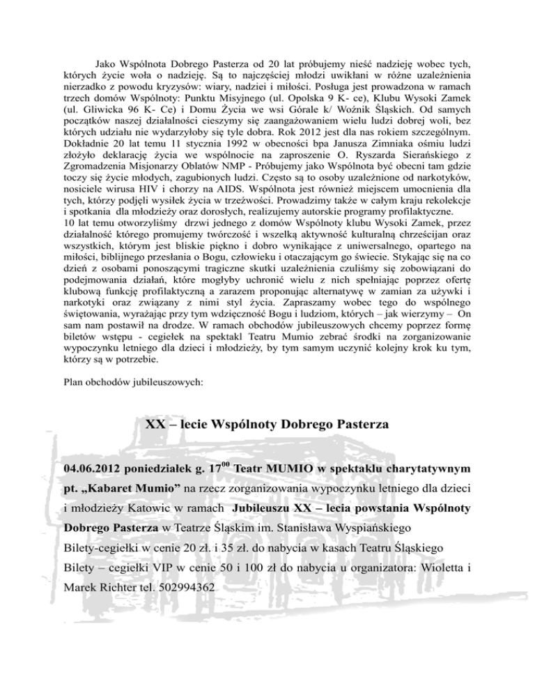 Jako Wspólnota Dobrego Pasterza od 20 lat próbujemy nieść nadzieję wobec tych, których życie woła o nadzieję. Są to najczęściej młodzi uwikłani w różne uzależnienia nierzadko z powodu kryzysów: wiary, nadziei i miłości. Posługa jest prowadzona w ramach trzech domów Wspólnoty: Punktu Misyjnego (ul. Opolska 9 K- ce), Klubu Wysoki Zamek (ul. Gliwicka 96 K- Ce) i Domu Życia we wsi Górale k/ Woźnik Śląskich. Od samych początków naszej działalności cieszymy się zaangażowaniem wielu ludzi dobrej woli, bez których udziału nie wydarzyłoby się tyle dobra. Rok 2012 jest dla nas rokiem szczególnym. Dokładnie 20 lat temu 11 stycznia 1992 w obecności bpa Janusza Zimniaka ośmiu ludzi złożyło deklarację życia we wspólnocie na zaproszenie O. Ryszarda Sierańskiego z Zgromadzenia Misjonarzy Oblatów NMP - Próbujemy jako Wspólnota być obecni tam gdzie toczy się życie młodych, zagubionych ludzi. Często są to osoby uzależnione od narkotyków, nosiciele wirusa HIV i chorzy na AIDS. Wspólnota jest również miejscem umocnienia dla tych, którzy podjęli wysiłek życia w trzeźwości. Prowadzimy także w całym kraju rekolekcje i spotkania dla młodzieży oraz dorosłych, realizujemy autorskie programy profilaktyczne. 10 lat temu otworzyliśmy drzwi jednego z domów Wspólnoty klubu Wysoki Zamek, przez działalność którego promujemy twórczość i wszelką aktywność kulturalną chrześcijan oraz wszystkich, którym jest bliskie piękno i dobro wynikające z uniwersalnego, opartego na miłości, biblijnego przesłania o Bogu, człowieku i otaczającym go świecie. Stykając się na co dzień z osobami ponoszącymi tragiczne skutki uzależnienia czuliśmy się zobowiązani do podejmowania działań, które mogłyby uchronić wielu z nich spełniając poprzez ofertę klubową funkcję profilaktyczną a zarazem proponując alternatywę w zamian za używki i narkotyki oraz związany z nimi styl życia. Zapraszamy wobec tego do wspólnego świętowania, wyrażając przy tym wdzięczność Bogu i ludziom, których – jak wierzymy – On sam nam postawił na drodze. W ramach obchodów jubileuszowych chcemy poprzez formę biletów wstępu - cegiełek na spektakl Teatru Mumio zebrać środki na zorganizowanie wypoczynku letniego dla dzieci i młodzieży, by tym samym uczynić kolejny krok ku tym, którzy są w potrzebie. Plan obchodów jubileuszowych: XX – lecie Wspólnoty Dobrego Pasterza 04.06.2012 poniedziałek g. 1700 Teatr MUMIO w spektaklu charytatywnym pt. „Kabaret Mumio” na rzecz zorganizowania wypoczynku letniego dla dzieci i młodzieży Katowic w ramach Jubileuszu XX – lecia powstania Wspólnoty Dobrego Pasterza w Teatrze Śląskim im. Stanisława Wyspiańskiego Bilety-cegiełki w cenie 20 zł. i 35 zł. do nabycia w kasach Teatru Śląskiego Bilety – cegiełki VIP w cenie 50 i 100 zł do nabycia u organizatora: Wioletta i Marek Richter tel. 502994362 X – lecie Klubu Wysoki Zamek 23.05.2012 środa g. 1600 – 1800 Happening na ulicach Katowic 24.05.2012 czwartek 1500 – 2200 Koncert plenerowy – festyn na ul. Janasa pamięci tragicznie zmarłych młodych Wystąpią: MALEO REGGAE ROCKERS (reggae) DJ ZIBEN (house) KATOLIKA FRONT (rock) POALKIDA (hip-hop) SZOPIENICKIE PEŁY RÓWNOCZEŚNIE: Malowanie emocjonalne prowadzone przez artystę malarza Adama Plackowskiego Zabawy i konkursy dla młodszych i starszych Oraz: Namiot spotkania PONADTO: 25.05.2012 piątek g. 1900 Warsztaty Bębniarskie prowadzone przez Andrzeja Kozackiego „Nożyka” w Klubie Wysoki Zamek Katowice ul. Gliwicka 96 / wstęp wolny 26.05.2012 sobota g. 1900 Koncert zespołu Nacinacze Sykomory połączony z Zesłaniem Ducha Świętego w Knajpie - Klub Wysoki Zamek Katowice ul. Gliwicka 96 / wstęp wolny 29.05.2012 wtorek g. 1900 Spotkanie z Ciekawym Człowiekiem – Ireneusz Krosny w Klubie Wysoki Zamek Katowice ul. Gliwicka 96 / wstęp wolny Projekt współfinansowany przez Prezydenta Miasta Katowice Patronat honorowy: Arcybiskup Wiktor Skworc Prezydent Miasta Katowice Patronat medialny: Radio Em Gość Niedzielny TVP 3 Współorganizatorzy i sponsorzy: Szkoła Podstawowa nr 10 im. Marii Curie-Skłodowskiej w Katowicach Teatr Śląski im St. Wyspiańskiego Pomoc Maltańska Salon Piękności Artemida Hipermarket OBI Hurtownia Odzieży ARTeam Fotosilesia Labolatorium Fotograficzne CLC Huhtamaki Pluta