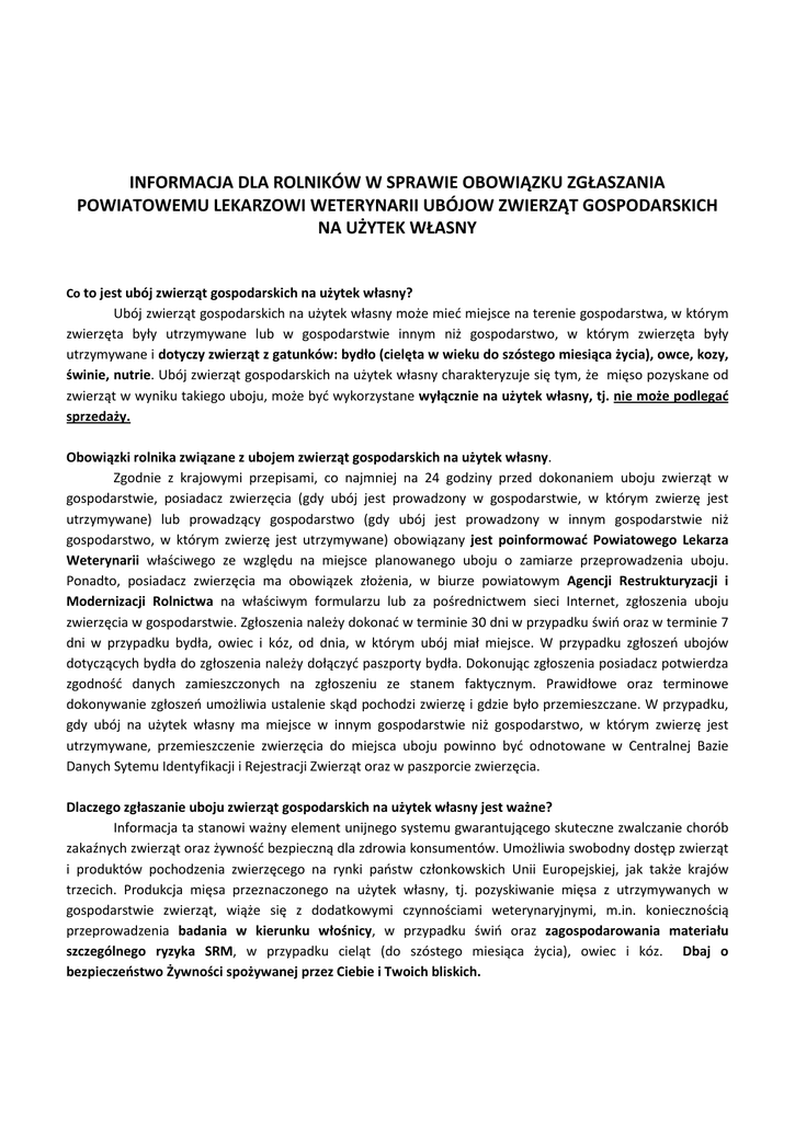 INFORMACJA DLA ROLNIKÓW W SPRAWIE OBOWIĄZKU ZGŁASZANIA POWIATOWEMU LEKARZOWI WETERYNARII UBÓJOW ZWIERZĄT GOSPODARSKICH NA UŻYTEK WŁASNY Co to jest ubój zwierząt gospodarskich na użytek własny? Ubój zwierząt gospodarskich na użytek własny może mied miejsce na terenie gospodarstwa, w którym zwierzęta były utrzymywane lub w gospodarstwie innym niż gospodarstwo, w którym zwierzęta były utrzymywane i dotyczy zwierząt z gatunków: bydło (cielęta w wieku do szóstego miesiąca życia), owce, kozy, świnie, nutrie. Ubój zwierząt gospodarskich na użytek własny charakteryzuje się tym, że mięso pozyskane od zwierząt w wyniku takiego uboju, może byd wykorzystane wyłącznie na użytek własny, tj. nie może podlegad sprzedaży. Obowiązki rolnika związane z ubojem zwierząt gospodarskich na użytek własny. Zgodnie z krajowymi przepisami, co najmniej na 24 godziny przed dokonaniem uboju zwierząt w gospodarstwie, posiadacz zwierzęcia (gdy ubój jest prowadzony w gospodarstwie, w którym zwierzę jest utrzymywane) lub prowadzący gospodarstwo (gdy ubój jest prowadzony w innym gospodarstwie niż gospodarstwo, w którym zwierzę jest utrzymywane) obowiązany jest poinformowad Powiatowego Lekarza Weterynarii właściwego ze względu na miejsce planowanego uboju o zamiarze przeprowadzenia uboju. Ponadto, posiadacz zwierzęcia ma obowiązek złożenia, w biurze powiatowym Agencji Restrukturyzacji i Modernizacji Rolnictwa na właściwym formularzu lub za pośrednictwem sieci Internet, zgłoszenia uboju zwierzęcia w gospodarstwie. Zgłoszenia należy dokonad w terminie 30 dni w przypadku świo oraz w terminie 7 dni w przypadku bydła, owiec i kóz, od dnia, w którym ubój miał miejsce. W przypadku zgłoszeo ubojów dotyczących bydła do zgłoszenia należy dołączyd paszporty bydła. Dokonując zgłoszenia posiadacz potwierdza zgodnośd danych zamieszczonych na zgłoszeniu ze stanem faktycznym. Prawidłowe oraz terminowe dokonywanie zgłoszeo umożliwia ustalenie skąd pochodzi zwierzę i gdzie było przemieszczane. W przypadku, gdy ubój na użytek własny ma miejsce w innym gospodarstwie niż gospodarstwo, w którym zwierzę jest utrzymywane, przemieszczenie zwierzęcia do miejsca uboju powinno byd odnotowane w Centralnej Bazie Danych Sytemu Identyfikacji i Rejestracji Zwierząt oraz w paszporcie zwierzęcia. Dlaczego zgłaszanie uboju zwierząt gospodarskich na użytek własny jest ważne? Informacja ta stanowi ważny element unijnego systemu gwarantującego skuteczne zwalczanie chorób zakaźnych zwierząt oraz żywnośd bezpieczną dla zdrowia konsumentów. Umożliwia swobodny dostęp zwierząt i produktów pochodzenia zwierzęcego na rynki paostw członkowskich Unii Europejskiej, jak także krajów trzecich. Produkcja mięsa przeznaczonego na użytek własny, tj. pozyskiwanie mięsa z utrzymywanych w gospodarstwie zwierząt, wiąże się z dodatkowymi czynnościami weterynaryjnymi, m.in. koniecznością przeprowadzenia badania w kierunku włośnicy, w przypadku świo oraz zagospodarowania materiału szczególnego ryzyka SRM, w przypadku cieląt (do szóstego miesiąca życia), owiec i kóz. Dbaj o bezpieczeostwo Żywności spożywanej przez Ciebie i Twoich bliskich. UBOJE GOSPODARCZE Powiatowy Lekarz w Międzychodzie przypomina o obowiązkach dotyczących produkcji mięsa przeznaczonego na użytek własnego gospodarstwa domowego. Na terenie gospodarstwa można dokonad uboju zwierzęcia z gatunku: 1. bydło w wieku do 6 miesiąca życia; 2. owcy lub kozy, świo, nutrii w dowolnym wieku; Ubojowi na terenie gospodarstwa w celu produkcji mięsa na własny użytek poddaje się zwierzęta: 1. zdrowe, 2. nie pochodzące z gospodarstwa lub obszaru podlegającego ograniczeniom, nakazom lub zakazom, mającym zastosowanie do danych zwierząt, 3. po upływie okresu karencji określonego dla użytego produktu leczniczego weterynaryjnego lub produktu leczniczego, jeżeli przed poddaniem ubojowi zwierzęta były leczone tymi produktami. 4. przy uboju zwierząt na terenie gospodarstwa powinny byd spełnione wymagania określone w przepisach o systemie identyfikacji i rejestracji zwierząt i o ochronie zwierząt (m.in. przedubojowe pozbawienie zwierzęcia świadomości przez przyuczoną osobę; ubój bez obecności osób nieletnich) oraz w przepisach o ochronie zdrowia zwierząt oraz zwalczaniu chorób zakaźnych. Posiadacz zwierzęcia lub podmiot prowadzący gospodarstwo inne niż gospodarstwo, w którym zwierzęta były utrzymywane, na 24 godziny przed dokonaniem na terenie gospodarstwa takiego uboju przekazuje powiatowemu lekarzowi weterynarii pisemne powiadomienie o zamiarze dokonania uboju cieląt do 6-go miesiąca życia, kóz, owiec lub składa oświadczenie o zagospodarowaniu na własny koszt materiału szczególnego ryzyka - SRM (utylizacja). Informacja ta powinna zawierad: 1. Imię i nazwisko, miejsce zamieszkania oraz adres posiadacza zwierząt poddawanych ubojowi; 2. Imię i nazwisko, miejsce zamieszkania oraz adres podmiotu prowadzącego gospodarstwo, w którym dokonywany jest ubój zwierząt pochodzących z innych gospodarstw w celu produkcji mięsa; 3. gatunek i liczba zwierząt poddawanych ubojowi; 4. numer identyfikacyjny zwierzęcia lub zwierząt poddawanych ubojowi; 5. miejsce i termin uboju; 6. imię i nazwisko oraz adres osoby uprawnionej do przeprowadzenia uboju; 7. dane kontaktowe zgłaszającego; 8. Informacja może zawierad zgłoszenie mięsa do badania poubojowego Mięso świo i nutrii poddanych ubojowi na terenie gospodarstwa oraz mięso dzików odstrzelonych, w celu produkcji mięsa poddaje się na koszt posiadacza tego mięsa, lub podmiotu prowadzącego gospodarstwo, w którym dokonano uboju badaniu poubojowemu na obecnośd włośni, przeprowadzane przez urzędowego lekarza weterynarii. W przypadku, gdy tusza podlega badaniu poubojowemu przeprowadzonemu przez urzędowego lekarza weterynarii na wniosek i na koszt posiadacza tego mięsa, lub podmiot