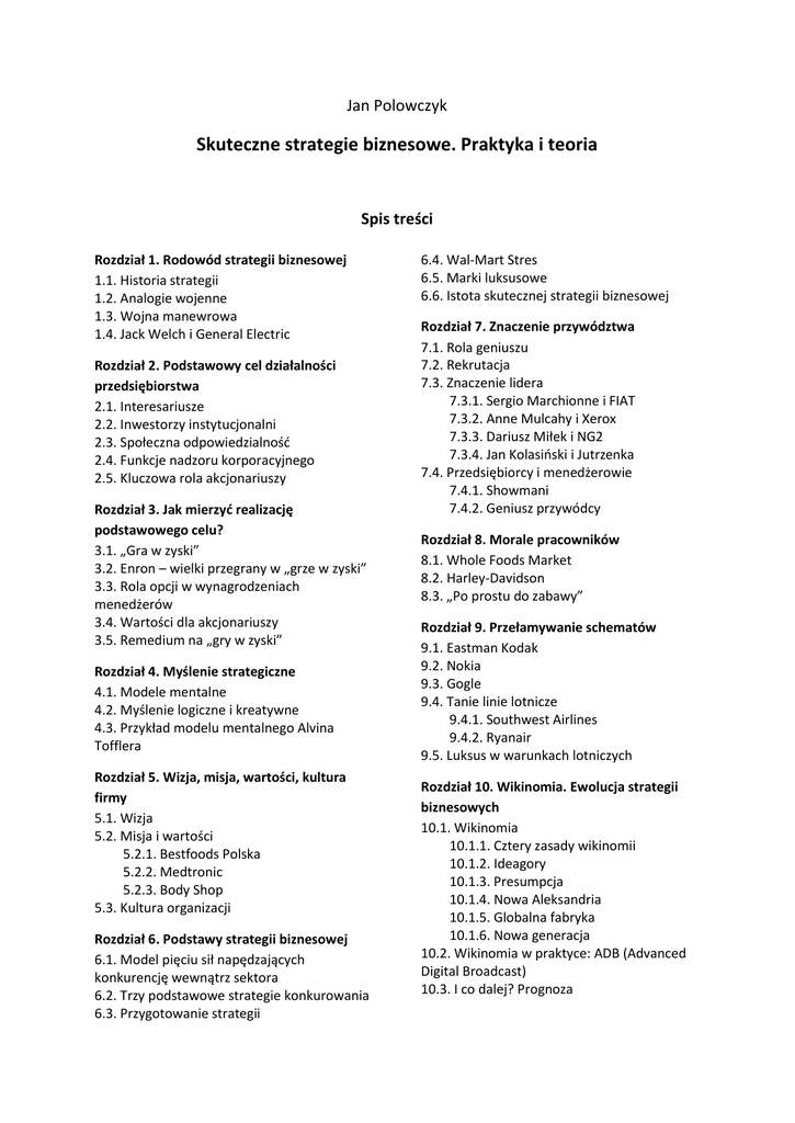 Jan Polowczyk Skuteczne strategie biznesowe. Praktyka i teoria Spis treści Rozdział 1. Rodowód strategii biznesowej 1.1. Historia strategii 1.2. Analogie wojenne 1.3. Wojna manewrowa 1.4. Jack Welch i General Electric Rozdział 2. Podstawowy cel działalności przedsiębiorstwa 2.1. Interesariusze 2.2. Inwestorzy instytucjonalni 2.3. Społeczna odpowiedzialność 2.4. Funkcje nadzoru korporacyjnego 2.5. Kluczowa rola akcjonariuszy Rozdział 3. Jak mierzyć realizację podstawowego celu? 3.1. „Gra w zyski” 3.2. Enron – wielki przegrany w „grze w zyski” 3.3. Rola opcji w wynagrodzeniach menedżerów 3.4. Wartości dla akcjonariuszy 3.5. Remedium na „gry w zyski” Rozdział 4. Myślenie strategiczne 4.1. Modele mentalne 4.2. Myślenie logiczne i kreatywne 4.3. Przykład modelu mentalnego Alvina Tofflera Rozdział 5. Wizja, misja, wartości, kultura firmy 5.1. Wizja 5.2. Misja i wartości 5.2.1. Bestfoods Polska 5.2.2. Medtronic 5.2.3. Body Shop 5.3. Kultura organizacji Rozdział 6. Podstawy strategii biznesowej 6.1. Model pięciu sił napędzających konkurencję wewnątrz sektora 6.2. Trzy podstawowe strategie konkurowania 6.3. Przygotowanie strategii 6.4. Wal-Mart Stres 6.5. Marki luksusowe 6.6. Istota skutecznej strategii biznesowej Rozdział 7. Znaczenie przywództwa 7.1. Rola geniuszu 7.2. Rekrutacja 7.3. Znaczenie lidera 7.3.1. Sergio Marchionne i FIAT 7.3.2. Anne Mulcahy i Xerox 7.3.3. Dariusz Miłek i NG2 7.3.4. Jan Kolasiński i Jutrzenka 7.4. Przedsiębiorcy i menedżerowie 7.4.1. Showmani 7.4.2. Geniusz przywódcy Rozdział 8. Morale pracowników 8.1. Whole Foods Market 8.2. Harley-Davidson 8.3. „Po prostu do zabawy” Rozdział 9. Przełamywanie schematów 9.1. Eastman Kodak 9.2. Nokia 9.3. Gogle 9.4. Tanie linie lotnicze 9.4.1. Southwest Airlines 9.4.2. Ryanair 9.5. Luksus w warunkach lotniczych Rozdział 10. Wikinomia. Ewolucja strategii biznesowych 10.1. Wikinomia 10.1.1. Cztery zasady wikinomii 10.1.2. Ideagory 10.1.3. Presumpcja 10.1.4. Nowa Aleksandria 10.1.5. Globalna fabryka 10.1.6. Nowa generacja 10.2. Wikinomia w praktyce: ADB (Advanced Digital Broadcast) 10.3. I co dalej? Prognoza Rozdział 11. Firmy komputerowe 11.1. IBM – International Business Machines Corporation 11.2. Hewlett-Packard 11.3. Steve Jobs i Apple 11.4. Michael Dell i Dell Rozdział 12. Firmy odzieżowe 12.1. Benetton 12.2. Inditex 12.3. H&M – Hennes & Mauritz 12.4. Gap 12.5. LPP 12.6. Samanta Rozdzial 13. Producenci gier komputerowych 13.1. Electronic Arts 13.2. CD Projekt 13.3. City Interactive Rozdział 14. Poznańska specjalność: firmy jubilerskie 14.1. W. Kruk 14.2. Apart 14.3. Yes Biżuteria Rozdział 15. Polskie sieci delikatesów 15.1. Piotr i Paweł 15.2. Bomi 15.3. Alma Market Rozdział 16. Zdrowa żywność i bakalie 16.1. Bakalland 16.2. Sante A. Kowalski Zakończenie Bibliografia