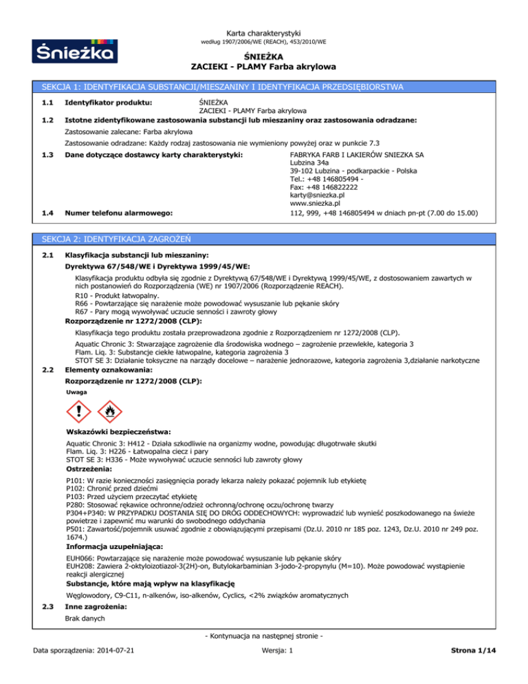 Karta charakterystyki według 1907/2006/WE (REACH), 453/2010/WE ŚNIEŻKA ZACIEKI - PLAMY Farba akrylowa SEKCJA 1: IDENTYFIKACJA SUBSTANCJI/MIESZANINY I IDENTYFIKACJA PRZEDSIĘBIORSTWA 1.1 1.2 Identyfikator produktu: ŚNIEŻKA ZACIEKI - PLAMY Farba akrylowa Istotne zidentyfikowane zastosowania substancji lub mieszaniny oraz zastosowania odradzane: Zastosowanie zalecane: Farba akrylowa Zastosowanie odradzane: Każdy rodzaj zastosowania nie wymieniony powyżej oraz w punkcie 7.3 1.3 Dane dotyczące dostawcy karty charakterystyki: 1.4 Numer telefonu alarmowego: FABRYKA FARB I LAKIERÓW SNIEZKA SA Lubzina 34a 39-102 Lubzina - podkarpackie - Polska Tel.: +48 146805494 Fax: +48 146822222 [email protected] www.sniezka.pl 112, 999, +48 146805494 w dniach pn-pt (7.00 do 15.00) SEKCJA 2: IDENTYFIKACJA ZAGROŻEŃ 2.1 Klasyfikacja substancji lub mieszaniny: Dyrektywa 67/548/WE i Dyrektywa 1999/45/WE: Klasyfikacja produktu odbyła się zgodnie z Dyrektywą 67/548/WE i Dyrektywą 1999/45/WE, z dostosowaniem zawartych w nich postanowień do Rozporządzenia (WE) nr 1907/2006 (Rozporządzenie REACH). R10 - Produkt łatwopalny. R66 - Powtarzające się narażenie może powodować wysuszanie lub pękanie skóry R67 - Pary mogą wywoływać uczucie senności i zawroty głowy Rozporządzenie nr 1272/2008 (CLP): Klasyfikacja tego produktu została przeprowadzona zgodnie z Rozporządzeniem nr 1272/2008 (CLP). 2.2 Aquatic Chronic 3: Stwarzające zagrożenie dla środowiska wodnego – zagrożenie przewlekłe, kategoria 3 Flam. Liq. 3: Substancje ciekłe łatwopalne, kategoria zagrożenia 3 STOT SE 3: Działanie toksyczne na narządy docelowe – narażenie jednorazowe, kategoria zagrożenia 3,działanie narkotyczne Elementy oznakowania: Rozporządzenie nr 1272/2008 (CLP): Uwaga Wskazówki bezpieczeństwa: Aquatic Chronic 3: H412 - Działa szkodliwie na organizmy wodne, powodując długotrwałe skutki Flam. Liq. 3: H226 - Łatwopalna ciecz i pary STOT SE 3: H336 - Może wywoływać uczucie senności lub zawroty głowy Ostrzeżenia: P101: W razie konieczności zasięgnięcia porady lekarza należy pokazać pojemnik lub etykietę P102: Chronić przed dziećmi P103: Przed użyciem przeczytać etykietę P280: Stosować rękawice ochronne/odzież ochronną/ochronę oczu/ochronę twarzy P304+P340: W PRZYPADKU DOSTANIA SIĘ DO DRÓG ODDECHOWYCH: wyprowadzić lub wynieść poszkodowanego na świeże powietrze i zapewnić mu warunki do swobodnego oddychania P501: Zawartość/pojemnik usuwać zgodnie z obowiązującymi przepisami (Dz.U. 2010 nr 185 poz. 1243, Dz.U. 2010 nr 249 poz. 1674.) Informacja uzupełniająca: EUH066: Powtarzające się narażenie może powodować wysuszanie lub pękanie skóry EUH208: Zawiera 2-oktyloizotiazol-3(2H)-on, Butylokarbaminian 3-jodo-2-propynylu (M=10). Może powodować wystąpienie reakcji alergicznej Substancje, które mają wpływ na klasyfikację Węglowodory, C9-C11, n-alkenów, iso-alkenów, Cyclics, <2% związków aromatycznych 2.3 Inne zagrożenia: Brak danych - Kontynuacja na następnej stronie - Data sporządzenia: 2014-07-21 Wersja: 1 Strona 1/14 Karta charakterystyki według 1907/2006/WE (REACH), 453/2010/WE ŚNIEŻKA ZACIEKI - PLAMY Farba akrylowa SEKCJA 3: SKŁAD/INFORMACJA O SKŁADNIKACH Opis chemiczny: Mieszanina na bazie żywicy akrylowej w rozpuszczalnikach Składniki: Zgodnie z Załącznikiem II do Rozporządzenia (WE) nr 1907/2006 (punkt 3), Produkt zawiera: Identyfikacja Nazwa chemiczna/klasyfikacja Stężenie Węglowodory, C9-C11, n-alkenów, iso-alkenów, Cyclics, <2% związków Klas. dost. CAS: Nie dotyczy aromatycznych EC: 919-857-5 Index: Nie dotyczy Dyrektywa 67/548/WE Xn: R65; R10; R66; R67 REACH: 01-2119463258-33-XXXX Aquatic Chronic 3: H412; Asp. Tox. 1: H304; Flam. Liq. 3: H226; STOT SE 3: H336 Rozporządzenie 1272/2008 Niebezpieczeństwo Diizomaślan 1-izopropylo-2,2-dimetylotrimetylenu CAS: 6846-50-0 EC: 229-934-9 Dyrektywa 67/548/WE Index: Nie dotyczy REACH: 01-2119451093-47-XXXX Rozporządzenie 1272/2008 Aquatic Chronic 3: H412 Niesklasyfikowa 2-(2-butoksyetoksy)etanol CAS: 112-34-5 EC: 203-961-6 Dyrektywa 67/548/WE Xi: R36 Index: 603-096-00-8 REACH: 01-2119475104-44-XXXX Rozporządzenie 1272/2008 Eye Irrit. 2: H319 - Uwaga ATP CLP00 CAS: 55406-53-6 EC: 259-627-5 Index: 616-212-00-7 REACH: Nie dotyczy Butylokarbaminian 3-jodo-2-propynylu (M=10) Dyrektywa 67/548/WE 20 - <50 % 1 - <5 % 0,1 - <0,5 % ATP ATP06 N: R50; T: R23, R48/23; Xi: R41, R43; Xn: R22 0,1 - <0,5 % Acute Tox. 3: H331; Acute Tox. 4: H302; Aquatic Acute 1: H400; Aquatic Chronic Rozporządzenie 1272/2008 1: H410; Eye Dam. 1: H318; Skin Sens. 1: H317; STOT RE 1: H372 Niebezpieczeństwo Dokładne brzmienie zwrotów R i H patrz sekcja 16 SEKCJA 4: ŚRODKI PIERWSZEJ POMOCY 4.1 Opis środków pierwszej pomocy: Objawy w wyniku zatrucia mogą wystąpić dopiero po narażeniu, w związku z czym w razie wątpliwości, bezpośredniego narażenia na produkt chemiczny lub przeciągającego się złego samopoczucia należy skonsultować się z lekarzem i pokazać mu Kartę Charakterystyki produktu. Przez wdychanie: Usunąć poszkodowanego z miejsca narażenia, zapewnić mu dostęp świeżego powietrza i odpoczynek. W ciężkich przypadkach tj. zatrzymanie krążenia i oddychania, należy zastosować sztuczne oddychanie (metoda usta-usta, masaż serca, dostarczenie tlenu, itd.) i natychmiast wezwać pomoc lekarską. Przez kontakt ze skórą: Zdjąć zanieczyszczone ubranie i buty, oczyścić skórę lub umyć poszkodowanego mydłem naturalnym , spłukując obficie zimną wodą. W przypadku poważnych dolegliwości należy się udać do lekarza. Jeżeli mieszanka spowodowała oparzenia lub odmrożenia, nie wolno zdejmować ubrania z poszkodowanego, gdyż w sytuacji, gdy ubranie jest przylepione do skóry może to spowodować jeszcze większe obrażenia. Jeśli na skórze pojawią się pęcherze, nie wolno ich przekłuwać, ponieważ może to zwiększyć ryzyko infekcji. Przez kontakt z oczami: Obficie pł