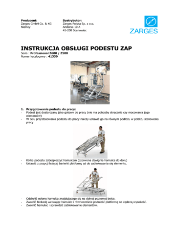 Producent: Zarges GmbH Co. & KG Niemcy Dystrybutor: Zarges Polska Sp. z o.o. Andersa 10 A 41-200 Sosnowiec INSTRUKCJA OBSŁUGI PODESTU ZAP Seria : Professional Z600 / Z500 Numer katalogowy : 41330 1. Przygotowanie podestu do pracy: - Podest jest dostarczany jako gotowy do pracy (nie ma potrzeby skręcania czy mocowania jego elementów) - W celu przystosowania podestu do pracy naleŜy ustawić go na równym podłoŜu w pobliŜu stanowiska pracy - Kółka podestu zabezpieczyć hamulcem (czerwona dzwignia hamulca do dołu) Ustawić z pozycji leŜącej barierki platformy aŜ do zablokowania się elementu. - Odchylić osłonę hamulca znajdującego się na dolnej poziomej belce. Zwolnić blokadę wciskając hamulec i równocześnie podnieść platformę na Ŝądaną wysokość. Zwolnić hamulec i sprawdzić zablokowanie elementów. UWAGA ! w zaleŜności od ustawionej wysokości jak i fizycznej sprawności osób obsługujących podest, przemieszczenie, rozkładanie i składanie podestu moŜe wymagać udziału więcej niŜ jednej osoby ! Wchodzenie na podest jak i przebywanie na nim wymaga zachowania szczególnej ostroŜności. Przede wszystkim ruchy związane z wchodzeniem jak i schodzeniem z podestu powinny być pewne i spokojne. Nie wolno odchylać tułowia w sposób znaczący. Podczas pracy na podeście drzwi zabezpieczające powinny być zamknięte i zablokowane ! 2. Składanie podestu - czynności związane ze składaniem podestu powinny przebiegać odwrotnie do wyŜej opisanych. KONSERWACJA, UTRZYMYWANIE W DOBRYM STANIE I SKŁADOWANIE 3. Czyszczenie podzespołów Czyszczenie moŜe następować za pomocą wody i z dodatkiem dopuszczonego w handlu środka czyszczącego. Zabrudzenia farbą mogą być usunięte za pomocą terpentyny. UWAGA Środki czyszczące nie mogą dostać się do gruntu, zuŜyte ciecze czyszczące muszą być usunięte zgodnie z obowiązującymi postanowieniami dotyczącymi ochrony środowiska naturalnego. 4. Sprawdzanie podzespołów Podstawa • NaleŜy sprawdzać ją pod względem odkształceń, zmiaŜdŜeń oraz powstających rys i pęknięć; w przypadku stwierdzenia wady podstawa nie moŜe być uŜywana. Przesuwane drabinki • NaleŜy sprawdzać je pod względem odkształceń, zmiaŜdŜeń oraz powstających rys i pęknięć; w przypadku stwierdzenia wady przesuwana drabinka nie moŜe być uŜywana. Podpory • NaleŜy sprawdzać je pod względem odkształceń, zmiaŜdŜeń oraz powstających rys i pęknięć; w przypadku stwierdzenia wady podpora nie moŜe być uŜywana. Pomost • NaleŜy sprawdzać go pod względem odkształceń, zmiaŜdŜeń oraz powstających rys i pęknięć; w przypadku stwierdzenia wady pomost nie moŜe być uŜywany. Kółka • NaleŜy sprawdzać zdolności trakcyjne kółka, zdolności śruby do lekkiego obracania się ; w przypadku stwierdzenia wady kółko nie moŜe być uŜywane. 5. Smarowanie ruchomych części Wszystkie ruchome części (śruba wspornika, łoŜysko koła ) naleŜy smarować dopuszczonym w handlu olejem. Natomiast do uŜytku w zimie naleŜy stosować olej rzadki. UWAGA NaleŜy wycierać nadmiar oleju; olej nie moŜe dostać się na powierzchnie przeznaczone do chodzenia – istnieje bowiem ryzyko poślizgu. Ścierki do czyszczenia nasączone olejem naleŜy usunąć zgodnie z obowiązującymi postanowieniami dotyczącymi ochrony środowiska naturalnego. 6 Składowanie Składowanie drabiny musi być przeprowadzane tak, aby wykluczyć jej uszkodzenia. Drabiny muszą być chronione przed wpływami warunków atmosferycznych. Podczas transportu drabin na miejsce ich składowania lub z miejsca składowania naleŜy zabezpieczyć je przed przesunięciem, uderzeniem, a takŜe upadkiem. Przy załadunku drabiny nie mogą być rzucane.