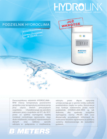 Kompatybilny z systemem zdalnego odczytu PODZIELNIK HYDROCLIMA Dwuczujnikowy odzielnik HYDROCLIMARFM mierzy temperaturę powierzchni grzejnika oraz temperaturę pomieszczenia przy użyciu dwóch precyzyjnych czujników. Charakteryzuje się szerokim zakresem pracy czujników od 0°C do 95°C przez co spełnia wymagania każdej instalacji centralnego ogrzewania. Jego duże możliwości, mnogość rejestrowanych danych oraz radiowy sposób odczytu w połączeniu z możliwością JUŻ TCE Ó R K W odczytu przez złącze optyczne umiejscawiają go w gronie ścisłej czołówki podzielników ciepła na rynku. Konstrukcja oraz funkcje realizowane przez nasze podzielniki HYDROCLIMA-RFM są tak dobrane, aby spełniały wszystkie wymagania normy PN-EN 834 oraz dostarczały przydatnych informacji do rozliczania kosztów ogrzewania za pomocą systemu dostosowanego do warunków polskich. Podzielnik kosztów HYDROCLIMA-RFM Elektroniczny podzielnik kosztów ogrzewania z dwoma czujnikami temperatury. Podzielnik jest wyposażony w moduł radiowy Wireless MBUS Radio (zgodny z PN-EN13757) należący do systemu zdalnego odczytu HYDROLINK. Razem z wodomierzami z serii RFM oraz urządzeniami do zdalnego odczytu tworzą kompletny system rozliczeniowo-odczytowy. Gwarancją trwałości są materiały konstrukcyjne pierwszej jakości - procesor lidera na rynku światowym Texas Instruments i czujniki termistorowe o dokładności 1%. JUŻ TCE WKRÓ Rejestracja temperatury grzejnika oraz temperatury otoczenia co pozwala na uniknięcie zliczania ogrzewania pochodzącego od innego źródła ciepła (kominek, słońce, etc.) Urządzenie wchodzi w skład radiowego systemu zdalnego odczytu HYDROLINK - Wireless MBUS (zgodny z PN-EN13757) Żywotność baterii 10 lat Wskazania wyświetlacza m.in.: aktualnie zużytych jednostek, z poprzedniego okresu rozliczeniowego, średnia temperatura grzejnika oraz otoczenia w ostatnim okresie rozliczeniowym Podzielnik elektroniczny posiada system sprawdzenia poprawności działania bez zdejmowania go z grzejnika, można również bez zdejmowania z grzejnika zmienić parametry jego pracy. Gwarancja obejmuje 10 letni okres obsługi systemu. Podzielnik elektroniczny jest dostosowany do ustawy o Prawie Energetycznym z dnia 04.03.2005 r. oraz zgodny z normą PN-EN 834. HYDROCLIMA-RFM - Dwuczujnikowy, elektroniczny podzielnik kosztów ogrzewania wyposażony w radiowy system zdalnego odczytu HYDROLINK Wszystkie podzielniki kosztów ogrzewania firmy BMETERS posiadają trwale zamkniętą obudowę już od chwili opuszczenia taśmy produkcyjnej. Eliminuje to przypadki potencjalnej ingerencji we wnętrze podzielnika (nawet przez pracowników serwisu) mogącej wpływać na dokładność wskazania. Podzielnik HYDROCLIMA-RFM można otworzyć poprzez trwałe zniszczenie obudowy. v1.1 | 05.10.10 ul. Główna 60 Tel: + 48 71 388 90 83 [email protected] 51-188 PSARY k.WROCŁAWIA Fax: + 48 71 387 15 37 www.bmeters.pl PODZIELNIK HYDROCLIMA-RFM Mod. HYDROCLIMA-RFM Podzielnik kosztów ogrzewania - elektroniczny, dwuczujnikowy z radiowym systemem zdalnego odczytu HYDROCLIMA-RFM Dwuczujnikowy zgodny z PN-EN834 Typ Ciekłokrystaliczny LCD sześciomiejscowy z kropkami Wyświetlacz Wymiary 90 x 44 x 24 mm Zasilanie bateria o trwałości > 10 lat radiowy elektroniczny optyczny Odczyt Nominalny zakres pracy czujników Rodzaj instalacji C.O. od 0°C do 95°C jednorurowa dwururowa Maksymalna moc grzejników Dokładność pomiarów do 12 500 W termistory 1% 3 Ilość kodów błędów Sposób realizacji pomiaru Komunikacja z podzielnikiem zastrzeżony radiowa optyczna Dwa czujniki temperatury Konstrukcja nierozbieralna Komunikacja radiowa w protokole Wireless MBUS (PN-EN13757) Rejestracja wyłączenia grzejnika lokatora Rejestracja przedziałów temperaturowych RADIO Budynki własności publicznej Posiadłości prywatne Zakłady przemysłowe Budynki wielorodzinne HYDROLINK Wireless MBUS Radio system zdalnego odczytu oparty o radiową transmisję danych w protokole Wireless MBUS (PN-EN13757) Każdy podzielnik wyposażony jest zarówno w system radiowy jak i nowoczesne złącze optyczne. Oba rozwiązania pozwalają na komfortowy, elektroniczny odczyt danych, co skraca czas rozliczenia i obniża jego koszty. Podzielnik HYDROCLIMA-RFM zapisuje w pamięci dane pozwalające na dokonanie pełnej analizy warunków w jakich pracował przez cały sezon. Analiza ta jest możlwia poprzez rejestrację między innymi takich danych jak ilość pomiarów w 4 różnych zakresach temperatur zarówno grzejnika jak i pomieszczenia. v1.1 | 05.10.10 ul. Główna 60 Tel: + 48 71 388 90 83 [email protected] 51-188 PSARY k.WROCŁAWIA Fax: + 48 71 387 15 37 www.bmeters.pl Podzielnik kosztów HYDROCLIMA-RFM Test wyświetlacza: świecą wszystkie segmenty 88888 Aktualne c 143 Data rozpoczęcia okresu rozliczeniowego 1 1.10 Nr ewidencyjny podzielnika Samoczynne wskazanie (co 10 sekund) aktualnego zużycia jednostek w sezonie grzewczym. Dzięki temu lokator ma możliwość ciągłej kontroli kosztów ogrzewania . Wskazania na wyświetlaczu po oświetleniu złącza optycznego Wskazanie w aktualnym okresie rozliczeniowym data rozpoczęcia okresu rozliczeniowego numer indentyfikacyjny podzielnika wskazanie za ostatni zakończony okres rozliczeniowy liczba kontrolna wyliczona na koniec ostatniego okresu rozliczeniowego 4A 876 Pozostałe wskazania można odczytać drogą radiową lub poprzez złącze optyczne, m.in: Wskazanie za ostatni okres U 176 Liczba kontrolna na koniec ostatniego zakończonego okresu 5234 Średnia temperatura grzejnika z ostatniego okresu rozliczeniowego 42.1 Średnia temperatura otoczenia z ostatniego okresu rozliczeniowego 21.7 seria i numer podzielnika bieżąca zmierzona temperatura grzejnika oraz otoczenia maksymalna temperatura grzejnika w bieżącym okresie rozliczeniowym wraz z datą wystąpienia wskazanie za zakończony sezon grzewczych średnia temperatura grzejnika w ostatnim okresie rozliczeniowym aktualna data i czas w