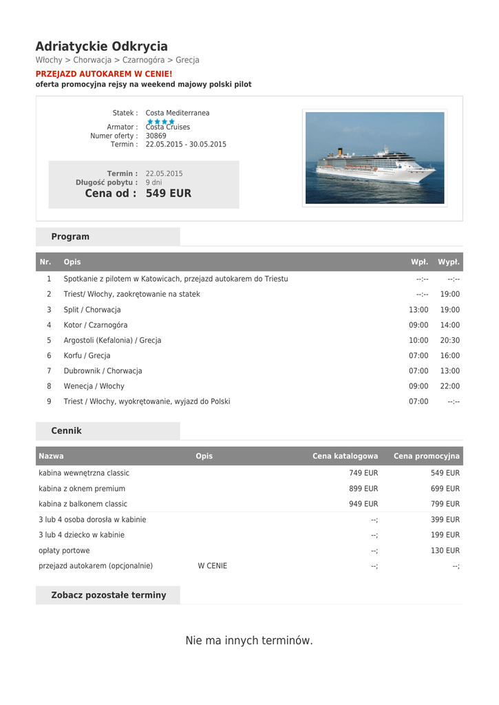 Adriatyckie Odkrycia Włochy > Chorwacja > Czarnogóra > Grecja PRZEJAZD AUTOKAREM W CENIE! oferta promocyjna rejsy na weekend majowy polski pilot Statek : Armator : Numer oferty : Termin : Termin : Długość pobytu : Costa Mediterranea Costa Cruises 30869 22.05.2015 - 30.05.2015 22.05.2015 9 dni Cena od : 549 EUR Program Nr. Opis Wpł. Wypł. 1 Spotkanie z pilotem w Katowicach, przejazd autokarem do Triestu --:-- --:-- 2 Triest/ Włochy, zaokrętowanie na statek --:-- 19:00 3 Split / Chorwacja 13:00 19:00 4 Kotor / Czarnogóra 09:00 14:00 5 Argostoli (Kefalonia) / Grecja 10:00 20:30 6 Korfu / Grecja 07:00 16:00 7 Dubrownik / Chorwacja 07:00 13:00 8 Wenecja / Włochy 09:00 22:00 9 Triest / Włochy, wyokrętowanie, wyjazd do Polski 07:00 --:-- Cennik Nazwa Cena katalogowa Cena promocyjna kabina wewnętrzna classic 749 EUR 549 EUR kabina z oknem premium 899 EUR 699 EUR kabina z balkonem classic 949 EUR 799 EUR 3 lub 4 osoba dorosła w kabinie --; 399 EUR 3 lub 4 dziecko w kabinie --; 199 EUR opłaty portowe --; 130 EUR --; --; przejazd autokarem (opcjonalnie) Opis W CENIE Zobacz pozostałe terminy Nie ma innych terminów. Informacje dodatkowe cena obejmuje: rejs statkiem Costa Mediterranea ****; zakwaterowanie w kabinie wybranej kategorii (7 noclegów); ubezpieczenie: KL 30 000€, KR 6 000€, NWI 16 000 PLN, BP 1800 PLN + choroby przewlekłe; serwis bagażowy i kabinowy; wyżywienie – 3 główne posiłki, przekąski między posiłkami; korzystanie z basenu i innych urządzeń sportowo-rekreacyjnych; udział we wszystkich imprezach organizowanych na statku, przejazd autokarem na trasie Katowice – Triest – Katowice, opiekę polskiego pilota. cena nie obejmuje: opłat portowych i podatków (130€/os.); ewentualnych noclegów w hotelu przed/po rejsie i transferów (na zapytanie); wycieczek fakultatywnych; korzystania z punktów usługowych (pralnia, fotograf, salon piękności i odnowy biologicznej, Internet); napojów do obiadów i kolacji, drinków oraz napiwków obowiązkowych dla obsługi statku (ok. 8,5€/dzień/osobę od 14 roku życia; 4,25€/dzień/osobę 4-14 lat). uwagi: kabiny 3/4 osobowe nie są dostępne we wszystkich kategoriach, a ich liczba jest ograniczona – sprzedaż tylko po potwierdzeniu. Grupa realizowana przy min. 20 osobach. Na pokładzie statku obowiązuje bezgotówkowy system opłat. Należność reguluje się ostatniego dnia rejsu gotówką (wpłata depozytu ok. 250€/kabina pierwszego dnia rejsu) lub kartą kredytową (VISA, Mastercard, American Express) na podstawie zbiorczego rachunku. Karty kredytowe należy zarejestrować zaraz po zaokrętowaniu. DOJAZD WŁASNY: w przypadku dojazdu własnego zniżka w wysokości 70€/os. ALL INCLUSIVE (opcja) istnieje możliwość wykupienia pakietu ALL INCLUSIVE obejmującego wybrane napoje alkoholowe i bezalkoholowe dostępne bez ograniczeń we wszystkich barach. Cena pakietu 25€/dzień/ osoba dorosła i 16€/dzień/dziecko. Warunkiem skorzystania z pakietu all inclusive jest wykupienie pakietu przez wszystkich pasażerów podróżujących w jednej kabinie na czas całego rejsu. WYCIECZKI FAKULTATYWNE Adriatyckie Odkrycia