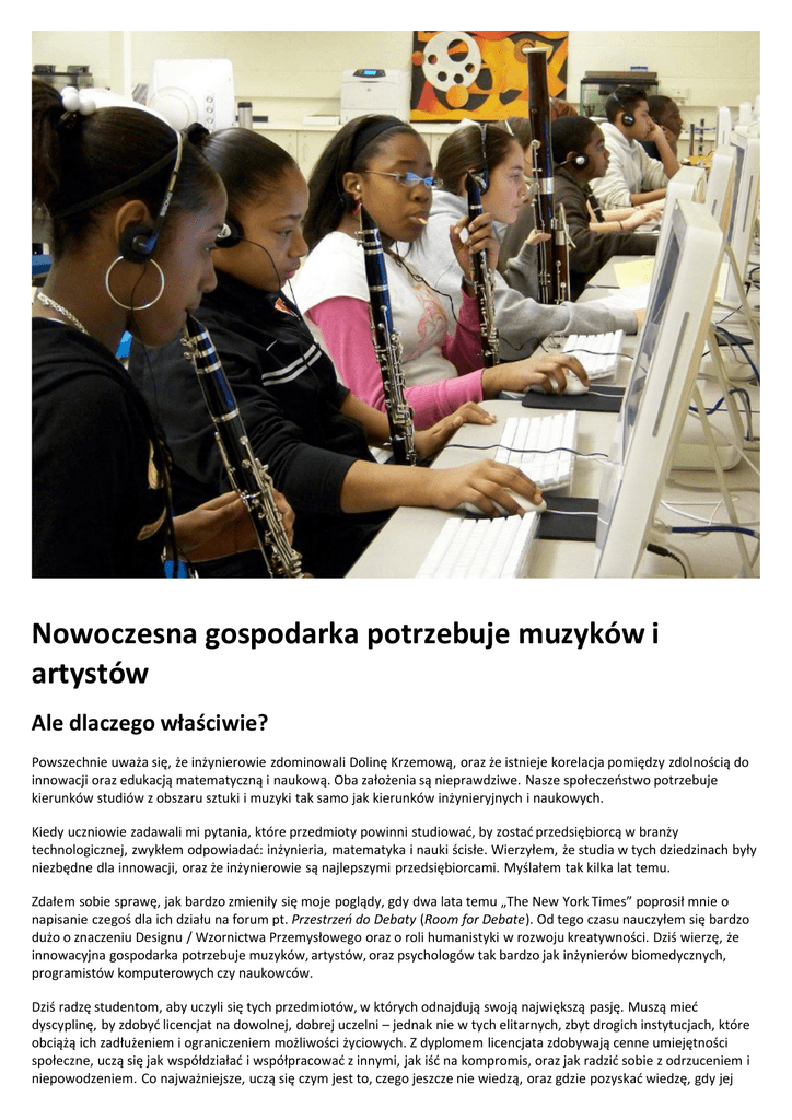 Nowoczesna gospodarka potrzebuje muzyków i artystów Ale dlaczego właściwie? Powszechnie uważa się, że inżynierowie zdominowali Dolinę Krzemową, oraz że istnieje korelacja pomiędzy zdolnością do innowacji oraz edukacją matematyczną i naukową. Oba założenia są nieprawdziwe. Nasze społeczeństwo potrzebuje kierunków studiów z obszaru sztuki i muzyki tak samo jak kierunków inżynieryjnych i naukowych. Kiedy uczniowie zadawali mi pytania, które przedmioty powinni studiować, by zostać przedsiębiorcą w branży technologicznej, zwykłem odpowiadać: inżynieria, matematyka i nauki ścisłe. Wierzyłem, że studia w tych dziedzinach były niezbędne dla innowacji, oraz że inżynierowie są najlepszymi przedsiębiorcami. Myślałem tak kilka lat temu. Zdałem sobie sprawę, jak bardzo zmieniły się moje poglądy, gdy dwa lata temu „The New York Times” poprosił mnie o napisanie czegoś dla ich działu na forum pt. Przestrzeń do Debaty (Room for Debate). Od tego czasu nauczyłem się bardzo dużo o znaczeniu Designu / Wzornictwa Przemysłowego oraz o roli humanistyki w rozwoju kreatywności. Dziś wierzę, że innowacyjna gospodarka potrzebuje muzyków, artystów, oraz psychologów tak bardzo jak inżynierów biomedycznych, programistów komputerowych czy naukowców. Dziś radzę studentom, aby uczyli się tych przedmiotów, w których odnajdują swoją największą pasję. Muszą mieć dyscyplinę, by zdobyć licencjat na dowolnej, dobrej uczelni – jednak nie w tych elitarnych, zbyt drogich instytucjach, które obciążą ich zadłużeniem i ograniczeniem możliwości życiowych. Z dyplomem licencjata zdobywają cenne umiejętności społeczne, uczą się jak współdziałać i współpracować z innymi, jak iść na kompromis, oraz jak radzić sobie z odrzuceniem i niepowodzeniem. Co najważniejsze, uczą się czym jest to, czego jeszcze nie wiedzą, oraz gdzie pozyskać wiedzę, gdy jej potrzebują. Czasopismo „NY Times” poprosiło mnie o komentarz na temat rozbieżności w opiniach, jakie mają Bill Gates i Steve Jobs. W przemówieniu przed Narodowym Stowarzyszeniem Gubernatorów w USA (National Governors Association) Bill Gates twierdził, że musimy wydawać nasz ograniczony budżet edukacyjny na dyscypliny, które tworzą najwięcej miejsc pracy. Sugerował redukcję naszych inwestycji w Sztuki Wyzwolone (liberal arts, czyli kierunki artystyczne oraz nauki humanistyczne), ponieważ dyplomy z tych dziedzin nie korelują z tworzeniem miejsc pracy. Trzy dni później, podczas premiery iPad 2, Steve Jobs powiedział: „To jest w DNA firmy Apple, że sama technologia nie wystarcza. Jedynie technologia w połączeniu ze sztukami wyzwolonymi, w połączeniu z humanistyką przynoszą nam rezultaty, które sprawiają, że nasze serce śpiewa. I nigdzie nie jest to bardziej prawdziwe, niż w tych post-komputerowych urządzeniach”. Oto co napisałem dla „The Times”: Powszechnie uważa się, że inżynierowie zdominowali Dolinę Krzemową, oraz że istnieje korelacja pomiędzy zdolnością do innowacji oraz edukacją matematyczną i naukową. Oba założenia są nieprawdziwe. Mój zespół badawczy na uniwersytetach Duke oraz Harvard zankietował 652 osoby urodzone w USA, które pełnią funkcje dyrektora zarządzającego lub szefa inżynierii produktu w przedsiębiorstwach z listy 502 największych firm technologicznych w USA. Odkryliśmy, że ludzie ci są z reguły wysoko wykształceni: 92% z nich posiadało tytuł licencjata, a 47% inny, wyższy stopień naukowy. Jednak tylko 37% osób posiadało wykształcenie w inżynierii lub technologii komputerowej, a tylko 2% wykształcenie matematyczne. Pozostali ukończyli tak różne kierunki jak: biznes, rachunkowość, opieka zdrowotna, oraz sztuki wyzwolone i nauki humanistyczne. Uzyskanie przez założyciela firmy dyplomu uczelni zrobiło dużą różnicę dla jego firmy – zauważalną w sprzedaży i stanie jej zatrudnienia. Jednak kierunek wykształcenia oraz rodzaj uczelni nie stanowiły istotnego czynnika. W ciągu ostatniego roku rozmawiałem z założycielami ponad 200 firm typu Start-Up z Doliny Krzemowej. Najczęstsze cechy, jakie wśród nich zaobserwowałem, to pasja by zmieniać świat oraz pewność siebie by przeciwstawiać się nierównościom i odnieść sukces. Identycznie jest w biznesie. W dwóch firmach, które założyłem, byłem zaangażowany w zatrudnianie ponad 100 pracowników na przestrzeni lat. Nigdy nie zaobserwowałem korelacji pomiędzy uczelnią, która zapewniła wykształcenie, lub dziedziną studiów – po jednej stronie, a sukcesem w miejscu pracy – po drugiej stronie. Tym, co sprawia, że ludzie osiągają sukces, jest ich motywacja, pęd do działania, zdolność do uczenia się na błędach, oraz to, jak ciężko pracują. I w tym momencie przychodzi Design / Wzornictwo Przemysłowe. Steve Jobs uczył świat, że dobra inżynieria technologiczna jest ważna, ale to, co znaczy najwięcej to dobry Design. Możesz uczyć artystów jak używać oprogramowania i narzędzi graficznych, ale znacznie trudniej będzie przemienić inżynierów w artystów. Nasze społeczeństwo potrzebuje kierunków studiów z obszaru Sztuk Wyzwolonych tak samo jak kierunków inżynieryjnych i naukowych. Ale tutaj nadchodzi brutalna rzeczywistość: perspektywy zatrudnienia są nikłe dla kierunków ze Sztuk Wyzwolonych. Absolwenci z najlepszych uczelni technicznych są poszukiwani zawsze, ale absolwenci filologii z tytułem doktora nawet z najbardziej prestiżowych uniwersytetów często nie mogą znaleźć pracy. Przedstawione powyżej dane zostały opracowane na tle założycieli firm technologicznych – tych, którzy przekwalifikowali się na przedsiębiorców. Większości z nich jednak się to nie udało. I, jak można zauważyć w przemówieniu Billa Gates’a, istnieje (w społeczeństwie) uprzedzenie wobec Sztuk Wyzwolonych i Nauk Humanistycznych. Dlatego studenci humanistyki musz