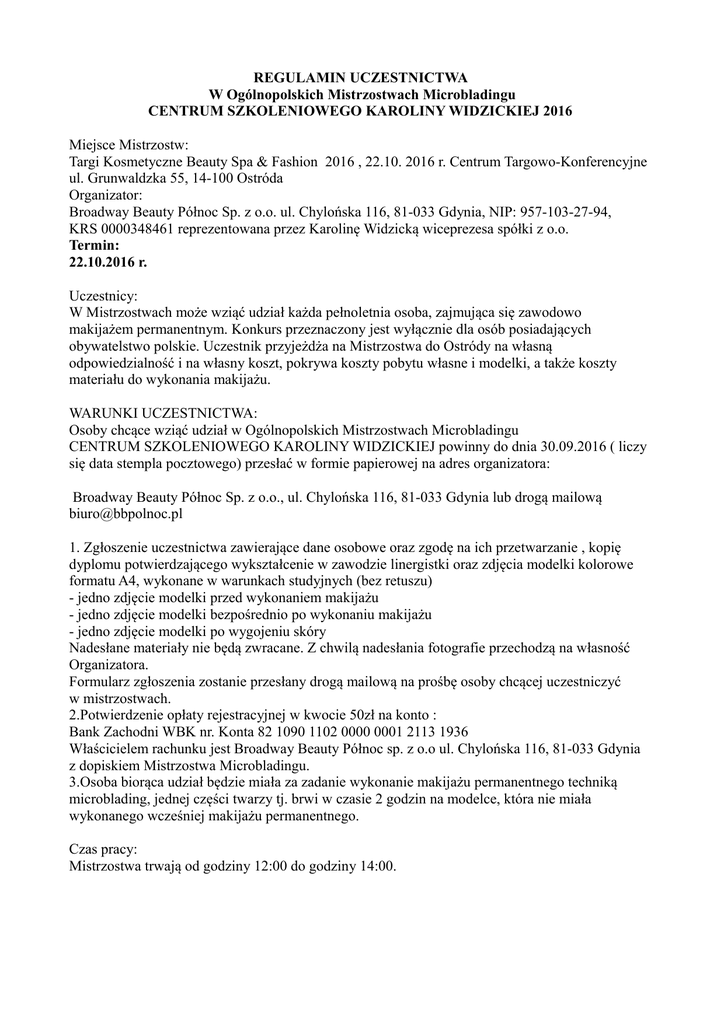 REGULAMIN UCZESTNICTWA W Ogólnopolskich Mistrzostwach Microbladingu CENTRUM SZKOLENIOWEGO KAROLINY WIDZICKIEJ 2016 Miejsce Mistrzostw: Targi Kosmetyczne Beauty Spa & Fashion 2016 , 22.10. 2016 r. Centrum Targowo-Konferencyjne ul. Grunwaldzka 55, 14-100 Ostróda Organizator: Broadway Beauty Północ Sp. z o.o. ul. Chylońska 116, 81-033 Gdynia, NIP: 957-103-27-94, KRS 0000348461 reprezentowana przez Karolinę Widzicką wiceprezesa spółki z o.o. Termin: 22.10.2016 r. Uczestnicy: W Mistrzostwach może wziąć udział każda pełnoletnia osoba, zajmująca się zawodowo makijażem permanentnym. Konkurs przeznaczony jest wyłącznie dla osób posiadających obywatelstwo polskie. Uczestnik przyjeżdża na Mistrzostwa do Ostródy na własną odpowiedzialność i na własny koszt, pokrywa koszty pobytu własne i modelki, a także koszty materiału do wykonania makijażu. WARUNKI UCZESTNICTWA: Osoby chcące wziąć udział w Ogólnopolskich Mistrzostwach Microbladingu CENTRUM SZKOLENIOWEGO KAROLINY WIDZICKIEJ powinny do dnia 30.09.2016 ( liczy się data stempla pocztowego) przesłać w formie papierowej na adres organizatora: Broadway Beauty Północ Sp. z o.o., ul. Chylońska 116, 81-033 Gdynia lub drogą mailową [email protected] 1. Zgłoszenie uczestnictwa zawierające dane osobowe oraz zgodę na ich przetwarzanie , kopię dyplomu potwierdzającego wykształcenie w zawodzie linergistki oraz zdjęcia modelki kolorowe formatu A4, wykonane w warunkach studyjnych (bez retuszu) - jedno zdjęcie modelki przed wykonaniem makijażu - jedno zdjęcie modelki bezpośrednio po wykonaniu makijażu - jedno zdjęcie modelki po wygojeniu skóry Nadesłane materiały nie będą zwracane. Z chwilą nadesłania fotografie przechodzą na własność Organizatora. Formularz zgłoszenia zostanie przesłany drogą mailową na prośbę osoby chcącej uczestniczyć w mistrzostwach. 2.Potwierdzenie opłaty rejestracyjnej w kwocie 50zł na konto : Bank Zachodni WBK nr. Konta 82 1090 1102 0000 0001 2113 1936 Właścicielem rachunku jest Broadway Beauty Północ sp. z o.o ul. Chylońska 116, 81-033 Gdynia z dopiskiem Mistrzostwa Microbladingu. 3.Osoba biorąca udział będzie miała za zadanie wykonanie makijażu permanentnego techniką microblading, jednej części twarzy tj. brwi w czasie 2 godzin na modelce, która nie miała wykonanego wcześniej makijażu permanentnego. Czas pracy: Mistrzostwa trwają od godziny 12:00 do godziny 14:00. KRYTERIA OCENY- ELIMINACJE W ocenie komisja będzie brała pod uwagę : 1. Dobranie odpowiedniego kształtu i koloru makijażu do modelki. 2. Technikę makijażu, wybraną przez osobę wykonującą. Na podstawie przesłanych materiałów wyłonione zostanie 8 finalistek ( +2 rezerwowe). O zakwalifikowaniu się na mistrzostwa uczestnik zostanie powiadomiony mailowo lub telefonicznie w dniach 3-6.10.2016r. KRYTERIA OCENY PODCZAS FINAŁU 1. Dobranie kształtu i koloru makijażu do modelki. 2. Technika makijażu. 3. Czas wykonywania makijażu. 4. Estetyka pracy. JURY KONKURSU 1. Jury konkursu powołuje organizator imprezy. 2. Jury konkursu ocenia, przyznaje nagrody i wyróżnienia, a także interpretuje regulamin. 3. Finalista z własnej woli poddaje się ocenie i krytyce członków Jury 4. Ocena i interpretacja Jury jest ostateczna i nie podlega odwołaniu. Żadne odwołania od decyzji Jury nie będzie uwzględniane. 5. Posiedzenie Jury odbędzie się po zakończeniu prezentacji makijaży 22.10.2016 r . NAGRODY I Miejsce: tytuł Mistrza Polski w Microbladingu w roku 2016 oraz nagroda o wartości 2000 zł, statuetka,dyplom oraz bezpłatne wejście na warsztaty z Microbladingu, które odbędą się w dniu 23.10.2016 podczas targów Beauty Spa & Fashion. II Miejsce: tytuł Wicemistrza Polski w Makijażu Permanentnym w roku 2016 oraz nagroda o wartości 1500 zł, dyplom, statuetka oraz bezpłatne wejście na warsztaty z Microbladingu, które odbędą się w dniu 23.10.2016 podczas targów Beauty Spa & Fashion. III Miejsce: tytuł Drugiego Wicemistrza Polski w Makijażu Permanentnym w roku 2016 oraz nagroda o wartości 1000 zł, dyplom,statuetka oraz bezpłatne wejście na warsztaty z Microbladingu, które odbędą się w dniu 23.10.2016 podczas targów Beauty Spa & Fashion. Wszyscy uczestnicy otrzymują dyplomy udziału w Mistrzostwach oraz 15% zniżki na szkolenia w Centrum Szkoleniowym Karoliny Widzickiej ( termin ważności upustów do dnia 31.12.2016 r.) PRZEPISY KOŃCOWE 1. Nadesłanie zgłoszenia udziału w konkursie stanowi jednocześnie deklarację, że osoba nadsyłająca zdjęcie jest autorem koncepcji i wykonania sfotografowanych makijaży 2. Nadesłanie zgłoszenia udziału w konkursie jest jednocześnie oświadczeniem, że autor wyjaśnił prawa osób portretowanych i osoby sportretowane wyrażają zgodę na ich publikację dla celów promocyjnych konkursu oraz, że autor przyjmuje na siebie wszelkie roszczenia jakiejkolwiek natury, które osoby trzecie mogłyby kierować przeciwko organizatorowi Konkursu. 3. Nadsyłając zgłoszenie udziału w konkursie uczestnik konkursu tym samym przyjmuje warunki Regulaminu konkursu i wyraża zgodę na przetwarzanie swoich danych osobowych zgodnie z ustawą o Ochronie Danych Osobowych ( Dz.U.Nr.133 pozycja 883) 4. Udział w konkursie jest jednoznaczny z nieodpłatnym udzieleniem prawa do wykorzystywania przez Organizatora zdjęć z przebiegu konkursu w następujących polach eksploatacji: druku w dowolnej liczbie publikacji i w dowolnym nakładzie, używania ich w Internecie oraz w innych formach utrwaleń, nadających się do rozpowszechniania w ramach działań Organizatora w zakresie związanym z promocją konkursu. 5. W konkursie nie mogą brać udziału pracownicy Organizatora oraz innych firm współpracujących przy organizacji i przeprowadzeniu konkursu ani członkowie najbliższej rodziny pracowników tych przedmiotów. 6. Niniejszy Regulamin wchodzi w życie z dniem rozpoczęcia konkursu i obowiązuje do czasu jego zakończenia. 