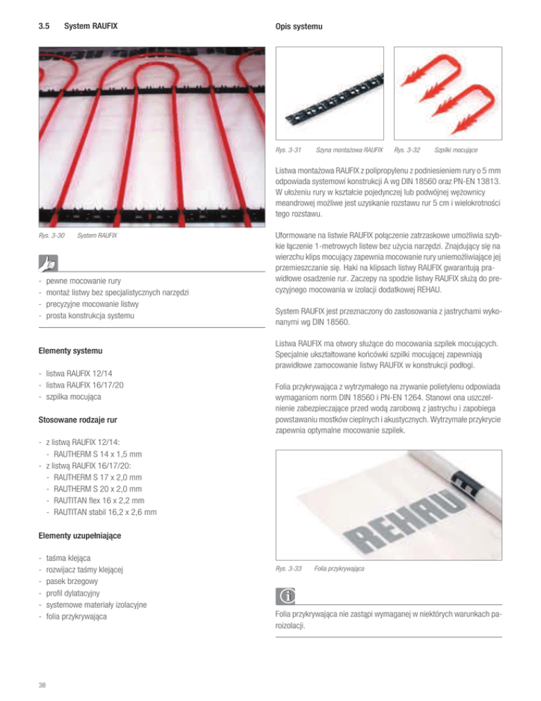 3.5 System RAUFIX Opis systemu Rys. 3-31 Szyna montaţowa RAUFIX Rys. 3-32 Szpilki mocujėce Listwa montařowa RAUFIX z polipropylenu z podniesieniem rury o 5 mm odpowiada systemowi konstrukcji A wg DIN 18560 oraz PN-EN 13813. W uořeniu rury w ksztacie pojedynczej lub podwójnej wĝřownicy meandrowej mořliwe jest uzyskanie rozstawu rur 5 cm i wielokrotnoŁci tego rozstawu. Rys. 3-30 - System RAUFIX pewne mocowanie rury montař listwy bez specjalistycznych narzĝdzi precyzyjne mocowanie listwy prosta konstrukcja systemu Elementy systemu - listwa RAUFIX 12/14 - listwa RAUFIX 16/17/20 - szpilka mocujčca Stosowane rodzaje rur Uformowane na listwie RAUFIX počczenie zatrzaskowe umořliwia szybkie čczenie 1-metrowych listew bez uřycia narzĝdzi. Znajdujčcy siĝ na wierzchu klips mocujčcy zapewnia mocowanie rury uniemořliwiajčce jej przemieszczanie siĝ. Haki na klipsach listwy RAUFIX gwarantujč prawidowe osadzenie rur. Zaczepy na spodzie listwy RAUFIX suřč do precyzyjnego mocowania w izolacji dodatkowej REHAU. System RAUFIX jest przeznaczony do zastosowania z jastrychami wykonanymi wg DIN 18560. Listwa RAUFIX ma otwory suřčce do mocowania szpilek mocujčcych. Specjalnie uksztatowane koıcówki szpilki mocujčcej zapewniajč prawidowe zamocowanie listwy RAUFIX w konstrukcji podogi. Folia przykrywajčca z wytrzymaego na zrywanie polietylenu odpowiada wymaganiom norm DIN 18560 i PN-EN 1264. Stanowi ona uszczelnienie zabezpieczajčce przed wodč zarobowč z jastrychu i zapobiega powstawaniu mostków cieplnych i akustycznych. Wytrzymae przykrycie zapewnia optymalne mocowanie szpilek. - z listwč RAUFIX 12/14: - RAUTHERM S 14 x 1,5 mm - z listwč RAUFIX 16/17/20: - RAUTHERM S 17 x 2,0 mm - RAUTHERM S 20 x 2,0 mm - RAUTITAN flex 16 x 2,2 mm - RAUTITAN stabil 16,2 x 2,6 mm Elementy uzupeāniajÇce - 38 taŁma klejčca rozwijacz taŁmy klejčcej pasek brzegowy profil dylatacyjny systemowe materiay izolacyjne folia przykrywajčca Rys. 3-33 Folia przykrywajėca Folia przykrywajčca nie zastčpi wymaganej w niektórych warunkach paroizolacji. Przy temperaturze poniřej +10 °C i/lub rozstawie rur d15 cm rury RAUTHERM S 17 x 2,0 mm i 20 x 2,0 mm oraz rurĝ RAUTITAN flex 16 x 2,2 mm naleřy ukadaĎ na ciepo za pomocč koowrotu do ukadania na ciepo oraz urzčdzenia grzewczego. 1. 2. 3. 4. 9. Listwĝ RAUFIX zabezpieczyĎ szpilkč mocujčcč w odstĝpie co 40 cm. 10. WcisnčĎ szpilkĝ mocujčcč przez listwy RAUFIX w konstrukcjĝ podogi. SYSTEMY MONTAĸOWE OGRZEWANIA PODĀOGOWEGO MontaĹ ZamontowaĎ szafkĝ rozdzielacza REHAU. ZamontowaĎ rozdzielacz REHAU. ZamocowaĎ pasek brzegowy REHAU. W razie potrzeby uořyĎ systemowy materia izolacyjny. Uszkodzenia folii przykrywajčcej majč negatywny wpyw na jej funkcjĝ. - Nie uszkodziĎ folii przykrywajčcej REHAU podczas ukadania. - W razie potrzeby otwory lub pĝkniĝcia w folii przykrywajčcej REHAU cakowicie zakleiĎ taŁmč klejčcč REHAU. 5. Foliĝ przykrywajčcč REHAU rozořyĎ tak, aby na čczeniach zachodzia na siebie na szerokoŁĎ 8 cm. 6. čczenia pasów folii przykrywajčcej REHAU cakowicie zakleiĎ taŁmč klejčcč REHAU. 7. PrzykleiĎ samoprzylepnč foliowč stopĝ paska brzegowego REHAU bez nacičgania do folii przykrywajčcej REHAU. 8. PočczyĎ listwy RAUFIX, aby uzyskaĎ wymaganč dugoŁĎ i wcisnčĎ w odstĝpie 1 metra równolegle w konstrukcjĝ podogi. Rys. 3-35 Wciskanie szpilki mocujėcej w konstrukcjħ podogi 11. PodčczyĎ jeden koniec rury do rozdzielacza REHAU. 12. UořyĎ rurĝ w listwach mocujčcych. 13. PodčczyĎ drugi koniec rury do rozdzielacza REHAU. 14. Rurĝ w obszarze zmiany kierunku prowadzenia zamocowaĎ dodatkowymi szpilkami RAUTAC Tacker lub szpilkami Tacker. 15. ZamontowaĎ profil dylatacyjny REHAU. WaĹne wskazówki dotyczÇce podstaw i projektowania znajdujÇ siÛ w rozdziaāach 3.1 i 3.2. Dane techniczne listew montaĹowych RAUFIX W przypadku stosowania jastrychów pynnych naleřy w razie potrzeby zmniejszyĎ odstĝp miĝdzy listwami montařowymi RAUFIX. Materia listwy polipropylen DugoŁĎ listwy 1m WysokoŁĎ listwy (bez spodnich zaczepów) Listwa 12/14 Listwa 16/17/20 24 mm 27 mm SzerokoŁĎ listwy Listwa 12/14 Listwa 16/17/20 40 mm 50 mm PrzeŁwit 5 mm Rozstaw rur 5 cm i wielokrotnoĘÉ Dane techniczne szpilki mocujÇcej Rys. 3-34 Materia szpilki mocujčcej polipropylen DugoŁĎ szpilki 50 mm Rozstaw koıcówek 20 mm Wciskanie listwy RAUFIX w konstrukcjħ podogi 39