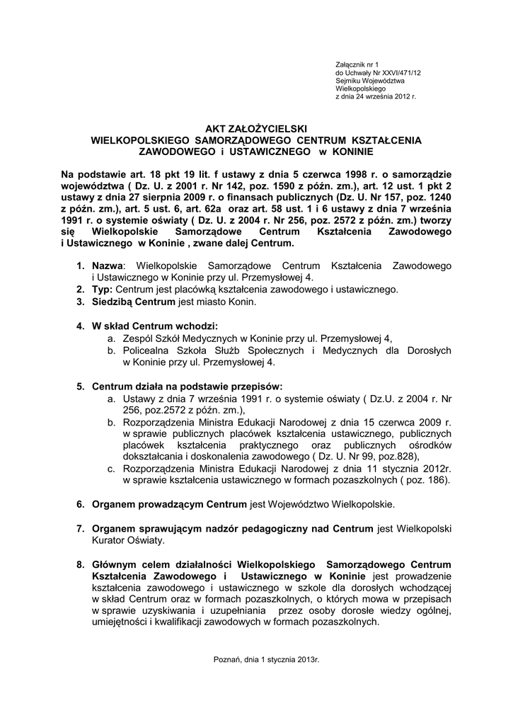 Załącznik nr 1 do Uchwały Nr XXVI/471/12 Sejmiku Województwa Wielkopolskiego z dnia 24 września 2012 r. AKT ZAŁOŻYCIELSKI WIELKOPOLSKIEGO SAMORZĄDOWEGO CENTRUM KSZTAŁCENIA ZAWODOWEGO i USTAWICZNEGO w KONINIE Na podstawie art. 18 pkt 19 lit. f ustawy z dnia 5 czerwca 1998 r. o samorządzie województwa ( Dz. U. z 2001 r. Nr 142, poz. 1590 z późn. zm.), art. 12 ust. 1 pkt 2 ustawy z dnia 27 sierpnia 2009 r. o finansach publicznych (Dz. U. Nr 157, poz. 1240 z późn. zm.), art. 5 ust. 6, art. 62a oraz art. 58 ust. 1 i 6 ustawy z dnia 7 września 1991 r. o systemie oświaty ( Dz. U. z 2004 r. Nr 256, poz. 2572 z późn. zm.) tworzy się Wielkopolskie Samorządowe Centrum Kształcenia Zawodowego i Ustawicznego w Koninie , zwane dalej Centrum. 1. Nazwa: Wielkopolskie Samorządowe Centrum Kształcenia Zawodowego i Ustawicznego w Koninie przy ul. Przemysłowej 4. 2. Typ: Centrum jest placówką kształcenia zawodowego i ustawicznego. 3. Siedzibą Centrum jest miasto Konin. 4. W skład Centrum wchodzi: a. Zespól Szkół Medycznych w Koninie przy ul. Przemysłowej 4, b. Policealna Szkoła Służb Społecznych i Medycznych dla Dorosłych w Koninie przy ul. Przemysłowej 4. 5. Centrum działa na podstawie przepisów: a. Ustawy z dnia 7 września 1991 r. o systemie oświaty ( Dz.U. z 2004 r. Nr 256, poz.2572 z późn. zm.), b. Rozporządzenia Ministra Edukacji Narodowej z dnia 15 czerwca 2009 r. w sprawie publicznych placówek kształcenia ustawicznego, publicznych placówek kształcenia praktycznego oraz publicznych ośrodków dokształcania i doskonalenia zawodowego ( Dz. U. Nr 99, poz.828), c. Rozporządzenia Ministra Edukacji Narodowej z dnia 11 stycznia 2012r. w sprawie kształcenia ustawicznego w formach pozaszkolnych ( poz. 186). 6. Organem prowadzącym Centrum jest Województwo Wielkopolskie. 7. Organem sprawującym nadzór pedagogiczny nad Centrum jest Wielkopolski Kurator Oświaty. 8. Głównym celem działalności Wielkopolskiego Samorządowego Centrum Kształcenia Zawodowego i Ustawicznego w Koninie jest prowadzenie kształcenia zawodowego i ustawicznego w szkole dla dorosłych wchodzącej w skład Centrum oraz w formach pozaszkolnych, o których mowa w przepisach w sprawie uzyskiwania i uzupełniania przez osoby dorosłe wiedzy ogólnej, umiejętności i kwalifikacji zawodowych w formach pozaszkolnych. Poznań, dnia 1 stycznia 2013r.