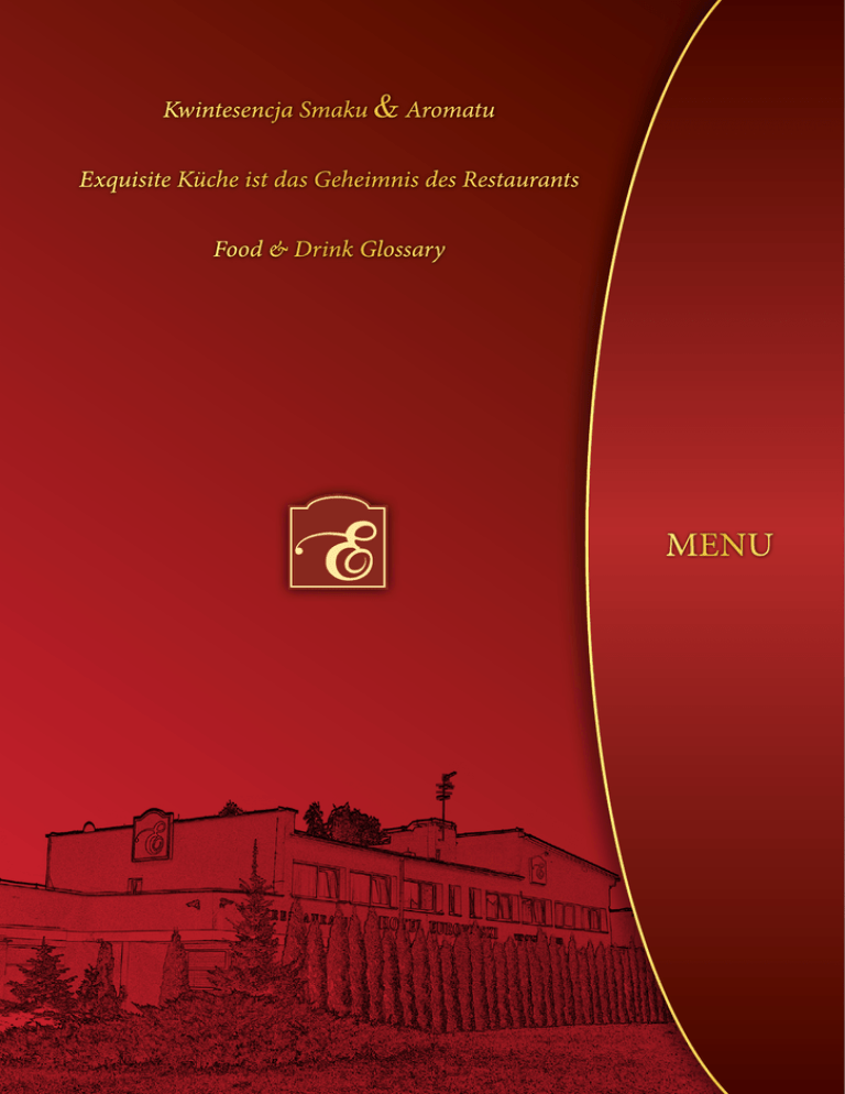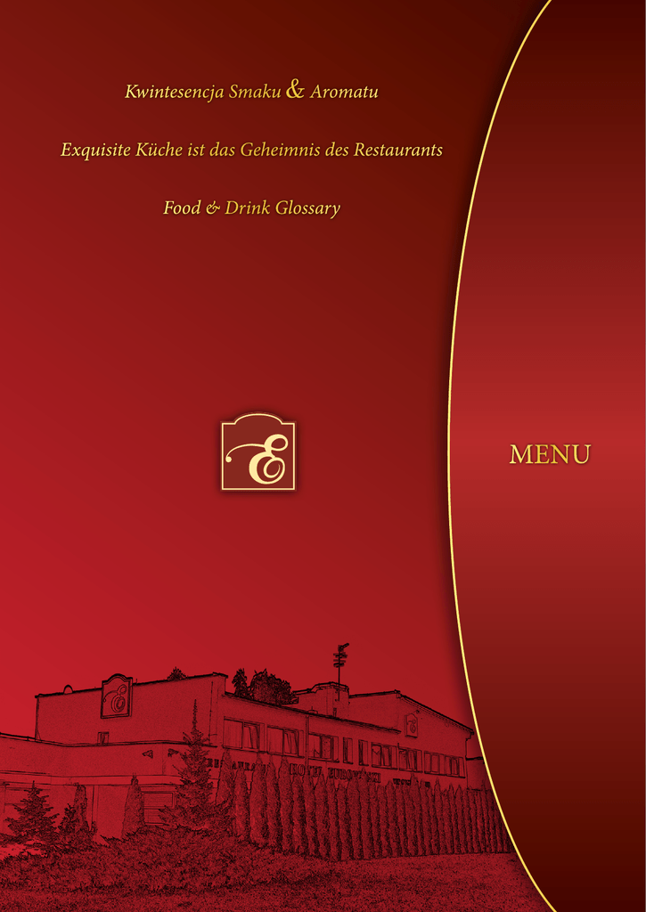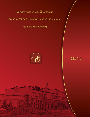 Kwintesencja Smaku & Aromatu Exquisite Küche ist das Geheimnis des Restaurants Food & Drink Glossary MENU Befsztyk tatarski z polędwicy wołowej 35 zł Deska serów na sałacie 22 zł Krewetki smażone na masełku w sosie śmietanowo – koperkowym 32 zł Przekrój serów i wędlin 28 zł Ser camembert panierowany 15 zł Szpinak po katalońsku zapiekany z sosem serowym 20 zł Śledź z cebulką po wiejsku 16 zł Warzywka zapiekane na szpinaku 25 zł Tatar z łososia wędzonego 25 zł Polnische ,,Befsztyk Tatarski” Tatar steak made of beef tenderloin Käseplatte auf einem Bett von Salat Cheese platter on lettuce Gebratene Garnelen in Dill – Sahne Soβe Shrimps fried in butter in a cream – dill sauce Kalte Platte mit Käse und Wurst Review of cheeses and sausages Panierte Camembert Breaded Camembert Cheese Spinat auf katalonische Art Catalan spinach baked with cheese sauce Landliche Hering mit Zwiebel Country herring with onion Gemüse überbacken mit Spinat Vegetables baked on spinach Lachs ”Tatar“ Tartar steak made of smoked salmon PRZYSTAWKI VORSPEISEN APPETISERS Klasyczna sałatka grecka 20 zł Sałatka Royal z kurczakiem 24 zł Sałatka włoska z pomidorem i serem mozzarella 20 zł Sałatka a’la feta 15 zł Sałatka Frutti di Mare 18 zł Klasische Griechische Salat Classic Greek Salad SAŁATKI SALATE SALADS Royal Salat mit Hähnchen Royal Chicken Salad Italienischer Salat mit frischen Tomaten und Mozzarella Italian salad with tomato and mozzarella cheese Salat a’la feta A’la feta salad Salat Frutti die Mare Frutti di Mare salad Barszcz czerwony czysty 5 zł Cebulowa z grzankami zapiekana serem 9 zł Rote Bete Suppe Pure red borscht Zwiebelsuppe mit Croutons überbacken mit Käse Onion soup with toast and baked cheese Flaczki z pieczywem Polnische ,,Flaki wołowe” mit Brot Beef tripe with bread Krem brokułowy z jajkiem Broccoli Suppe mit Ei Broccoli cream with egg Magnacki krem borowikowy z groszkiem ptysiowym Steinpilzen Cremsuppe mit Erbsen Puffer Baronial mushroom cream with peas Rosół drobiowo – wołowy z makaronem Rind – Hühner Brühe mit Nudeln Beef and chicken broth with noodles Solanka staropolska Soljanka Traditional Old-Polish solanka soup Zupa pomidorowa z makaronem Tomatensuppe mit Nudeln Tamato soup with noodles Żurek wiejski z jajkiem i wędzonką Ländliche ,,Żurek” mit Schinken und Ei White Borscht with egg and smoked meat 12 zł 8 zł 13 zł 8 zł 15 zł 7 zł 10 zł ZUPY SUPPEN SOUPS DANIA Z WOŁOWINY Gerichte vom Rind Beef dishes Polędwica marynowana po staropolsku 33 zł Polędwica faszerowana serem pleśniowym 36 zł Stek z polędwicy wołowej 35 zł Boeuf Strogonow 25 zł Tradycyjny kotlet schabowy 15 zł Schab po zbójnicku 16 zł Schab po królewsku 16 zł Karczek grillowany 12 zł Polędwiczki wieprzowe 17 zł Golonka zapiekana 25 zł Półmisek firmowy 28 zł Marinierte Lende auf altpolnische Art Marinated tenderloin prepared in a traditional Old-Polish way Gefülte Tasche mit Schimmelkäse Tenderloin stuffed with blue cheese Rindsteak Steak made of beef tenderloin Boeuf Strogonow Boeuf Strogonow Traditionele Schnitzel Traditional pork cutlet Räuberische Schnitzel Robber pork tenderloin DANIA Z WIEPRZOWINY Gerichte vom Schwein Pork dishes Königliche Schnitzel Royal pork tenderloin Schweinesteak Grilled pork Schweinlende Pork tenderloins Gebratne Eisbein Grilled pork knuckle Heiβe Fleisch Platte in drei Variationen Special hotel dish Opiekana pierś z kurczaka 14 zł Pierś z kurczaka panierowana 16 zł De volaille faszerowany serem żółtym 18 zł Filet z indyka na szpinaku 25 zł Filet z indyka w sezamie 17 zł Wątróbka z jabłkiem i cebulką 14 zł Gebratne Hähnchenbrust Baked chicken breast Panierte Schnitzel Breaded chicken breast De volaille gefült mit Käse De volaille stuffed with cheese Putenfilet auf Spinat Fillet made of turkey on spinach Putenfilet in Sesam Fillet made of turkey in sesame Hühnerleber mit Zwiebel und Apfel Liver with onion and apple DANIA Z DROBIU Geflügelgerichte Poultry dishes Filet z sandacza grillowany na szpinaku 28 zł Filet z sandacza sote 21 zł Filet z łososia grillowany 27 zł Filet z pangi panierowany 12 zł Pstrąg grillowany 25 zł Krewetki tygrysie w sosie śmietanowo - koperkowym 60 zł Filet z dorsza panierowany 15 zł Gegrillte Zanderfilet auf Spinat Fillet made of perch grilled on spinach Zanderfilet Fillet made of perch sote DANIA Z RYB Fischgerichte Fish dishes Gegrillte Lachsfilet Grilled fillet made of salmon Panierte Pangafilet Breaded fillet made of panga fish Gegrillte Forelle Grilled trout Tiger Garnelen in Dill – Sahne Soβe Tigerish shrimps in dill-cream sauce Panierte Dorschfilet Fried fillet made of cod Tagiatelle z sosem neapolitańskim zapiekane z serem 24 zł Tagiatella Nudeln mit neapolinetare Soße Tagiatelle in Neapolitan sauce grilled with cheese Tagiatelle ragou z sosem z grzybów leśnych 22 zł Penne z warzywami w sosie serowym 18 zł Farfalle ze szpinakiem zapiekane sosem serowym 22 zł Naleśniki z białym serem 16 zł Naleśniki ze szpinakiem 18 zł Tagiatelle Nudeln mit Waldpilzen Ragou Tagiatelle ragout with forest mushrooms Penne Nudeln mit Gemüse und Soβe Penne with vegetables and cheese sauce Fartfalle Nudeln mit Spinat und überbacken mit Käse Soβe Farfalle with spinach grilled with cheese sauce Pfankuchen mit süβen Quark Pancakes with cottage cheese Pfankuchen mit Spinat Pancakes with spinach Pierogi ze szpinakiem 20 zł Pierogi z kapustą i mięsem 17 zł Pierogi ruskie 12 zł Teigtaschen gefült mit Spinat „Pierogi”(a kind of dumplings) with spinach Teigtaschen mit Fleisch und Kraut „Pierogi”(a kind of dumplings) with meat and cabbage Rusische Teigtaschen „Pierogi”(a kind of dumplings with mashed potatoes and cottage cheese) Placki ziemniaczane Kartoffelrösti Potato pancakes 13 zł DANIA JARSKIE I INNE Vegetarische Gerichte Und andere Vegetarian dishes And others Bukiet warzyw z wody z masełkiem 9 zł Kapusta czerwona