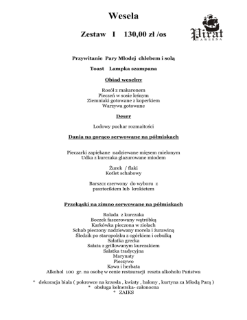 Wesela Zestaw I 130,00 zł /os Przywitanie Pary Młodej chlebem i solą Toast Lampka szampana Obiad weselny Rosół z makaronem Pieczeń w sosie leśnym Ziemniaki gotowane z koperkiem Warzywa gotowane Deser Lodowy puchar rozmaitości Dania na gorąco serwowane na półmiskach Pieczarki zapiekane nadziewane mięsem mielonym Udka z kurczaka glazurowane miodem Żurek / flaki Kotlet schabowy Barszcz czerwony do wyboru z pasztecikiem lub krokietem Przekąski na zimno serwowane na półmiskach Rolada z kurczaka Boczek faszerowany wątróbką Karkówka pieczona w ziołach Schab pieczony nadziewany morela i żurawiną Śledzik po staropolsku z ogórkiem i cebulką Sałatka grecka Sałata z grillowanym kurczakiem Sałatka tradycyjna Marynaty Pieczywo Kawa i herbata Alkohol 100 gr. na osobę w cenie restauracji reszta alkoholu Państwa * dekoracja biała ( pokrowce na krzesła , kwiaty , balony , kurtyna za Młodą Parą ) * obsługa kelnerska- całonocna * ZAIKS Zestaw II 140,00 zł / os Przywitanie Młodej Pary chlebem i solą Toast lampką szampana Obiad weselny Rosół z makaronem Pierś grillowana w sosie borowikowym Ziemniaki zapiekane w ziołach Warzywa gotowane Deser Lodowy puchar rozmaitości Dania na gorąco serwowane na półmiskach Zupa gulaszowa Pieczarka nadziewana mięsem mielonym Zraziki staropolskie Pieczeń w sosie borowikowym Kluski śląski Barszcz czerwony z krokietem lub pasztecikiem Przekąski na zimno serwowane na półmiskach Karkówka pieczona w ziołach Schab pieczony nadziewany śliwką / morelą Rolada z kurczaka Szynka pieczona w tymianku Śledzik w oleju Sałata lodowa z grillowanym kurczakiem Sałatka grecka Sałatka jarzynowa tradycyjna Marynaty Pieczywo Kawa , herbatka bez ograniczeń Alkohol 100 g / osobę- reszta alkoholu Państwa * dekoracja biała ( pokrowce na krzesła , kwiaty , balony , kurtyna za Młodą Parą ) * obsługa kelnerska – całonocna * ZAIKS Zestaw III 150,00 zł / os Przywitanie Pary Młodej chlebem i solą Toast Lampka szampana Obiad Rosół z makaronem Roladki schabowe w sosie chrzanowym Ziemniaki gotowane z koperkiem Warzywa gotowane Dania na gorąco serwowane na półmiskach Żurek z białą kiełbasą i jajkiem Udko z kurczaka Sznycel z serem i ananasem Kotlet de volaj Barszczyk czerwony z pasztecikiem lub krokietem Przekąski na zimno serwowane na półmiskach Boczek faszerowany wątróbką Rolada z kurczaka nadziewana Karkówka pieczona w ziołach Schab pieczony nadziewany morela i żurawiną Tatar z polędwicy Śledzik po staropolsku z ogórkiem i cebulką Sałatka grecka Sałata z grillowanym kurczakiem Sałatka jarzynowa Galaretka wieprzowa Marynaty Pieczywo Kawa i herbata Alkohol 100 gr. na osobę w cenie restauracji reszta alkoholu Państwa * dekoracja biała ( pokrowce na krzesła , kwiaty , balony , kurtyna za Młodą Parą ) * obsługa kelnerska - całonocna * ZAIKS Zestaw IV 160,00 zł / os Przywitanie Pary Młodej chlebem i solą Toast Lampka szampana Obiad Flaki / rosół z makaronem podane w wazach II danie serwowane na półmiskach Pieczeń w sosie żurawinowym Dorsz w warzywach Kotlet de volaii Ziemniaki opiekane po staropolsku Ziemniaki gotowane z koperkiem Warzywa gotowane Dania na gorąco serwowane na półmiskach Kotlet schabowy z pieczarką Udko na ostro Pieczarki faszerowane mięsem Szaszłyki drobiowe Barszczyk czerwony z pasztecikiem lub krokietem Przekąski na zimno serwowane na półmiskach Szynka pieczona w tymianku Rolada z kurczaka nadziewana Karkówka pieczona w ziołach Schab pieczony nadziewany śliwką i morelą Pstrąg w galarecie Śledzik po staropolsku z ogórkiem i cebulką Rolada łososiowa Sałatka grecka Sałatka jarzynowa Marynaty Pieczywo Kawa i herbata Alkohol 100 gr. na osobę w cenie restauracji reszta alkoholu Państwa * dekoracja biała ( pokrowce na krzesła , kwiaty , balony , kurtyna za Młodą Parą ) * obsługa kelnerska - całonocna * ZAIKS