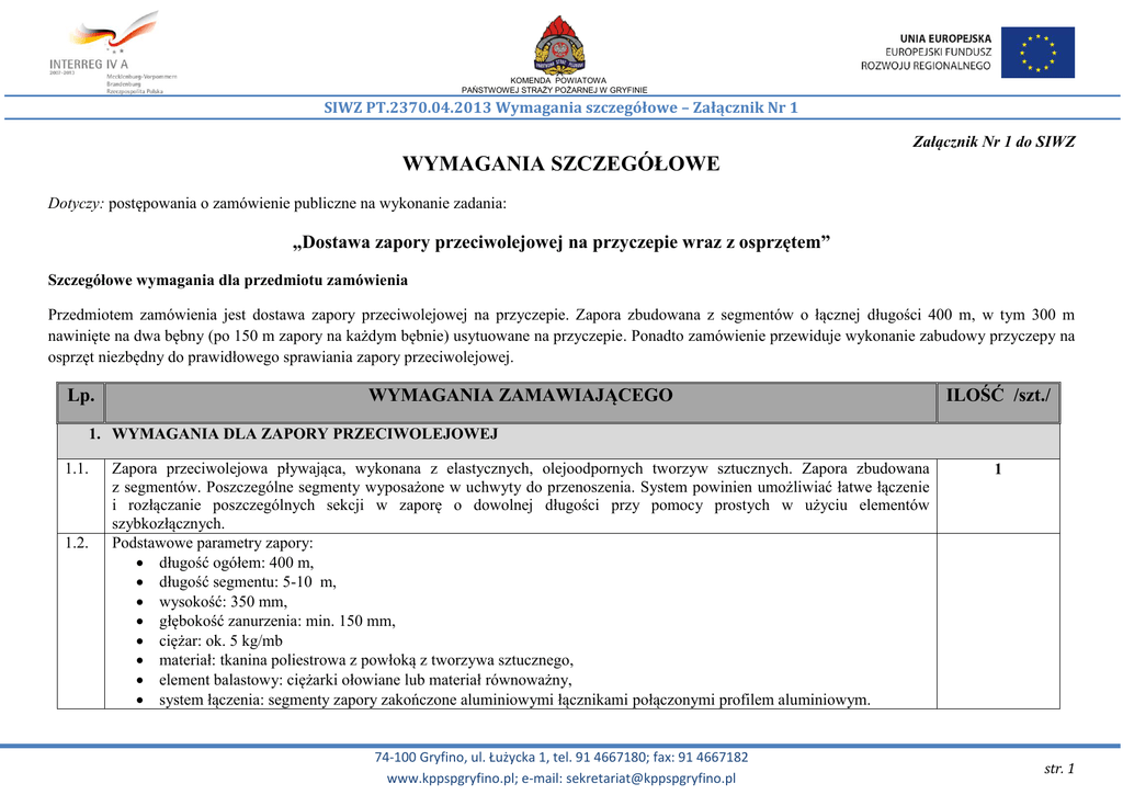 KOMENDA POWIATOWA PAŃSTWOWEJ STRAŻY POŻARNEJ W GRYFINIE SIWZ PT.2370.04.2013 Wymagania szczegółowe – Załącznik Nr 1 Załącznik Nr 1 do SIWZ WYMAGANIA SZCZEGÓŁOWE Dotyczy: postępowania o zamówienie publiczne na wykonanie zadania: „Dostawa zapory przeciwolejowej na przyczepie wraz z osprzętem” Szczegółowe wymagania dla przedmiotu zamówienia Przedmiotem zamówienia jest dostawa zapory przeciwolejowej na przyczepie. Zapora zbudowana z segmentów o łącznej długości 400 m, w tym 300 m nawinięte na dwa bębny (po 150 m zapory na każdym bębnie) usytuowane na przyczepie. Ponadto zamówienie przewiduje wykonanie zabudowy przyczepy na osprzęt niezbędny do prawidłowego sprawiania zapory przeciwolejowej. Lp. WYMAGANIA ZAMAWIAJĄCEGO ILOŚĆ /szt./ 1. WYMAGANIA DLA ZAPORY PRZECIWOLEJOWEJ 1.1. 1.2. Zapora przeciwolejowa pływająca, wykonana z elastycznych, olejoodpornych tworzyw sztucznych. Zapora zbudowana z segmentów. Poszczególne segmenty wyposażone w uchwyty do przenoszenia. System powinien umożliwiać łatwe łączenie i rozłączanie poszczególnych sekcji w zaporę o dowolnej długości przy pomocy prostych w użyciu elementów szybkozłącznych. Podstawowe parametry zapory: długość ogółem: 400 m, długość segmentu: 5-10 m, wysokość: 350 mm, głębokość zanurzenia: min. 150 mm, ciężar: ok. 5 kg/mb materiał: tkanina poliestrowa z powłoką z tworzywa sztucznego, element balastowy: ciężarki ołowiane lub materiał równoważny, system łączenia: segmenty zapory zakończone aluminiowymi łącznikami połączonymi profilem aluminiowym. 74-100 Gryfino, ul. Łużycka 1, tel. 91 4667180; fax: 91 4667182 www.kppspgryfino.pl; e-mail: [email protected] 1 str. 1 KOMENDA POWIATOWA PAŃSTWOWEJ STRAŻY POŻARNEJ W GRYFINIE SIWZ PT.2370.04.2013 Wymagania szczegółowe – Załącznik Nr 1 1.3. Zapora nawinięta na dwa stalowe bębny zamontowane na przyczepie transportowej (po 150 mb na każdym bębnie). Pozostałe 100 m w pojedynczych segmentach. 2. OSPRZĘT ZAPORY 2.1. Profil aluminiowy (łącznik) sprzęgający poszczególne segmenty zapory. 2.2. Końcówka zapory przeciwolejowej, do zastosowania jako rozdzielacz z dwoma podłączeniami do zapór przeciwolejowych (zapora prowadząca / zapora ochrony brzegu) z zintegrowaną rurą aluminiową Ø 50 mm. Końcówka zapory przeciwolejowej do jej mocowania na brzegu zbiornika wodnego, w postaci złączki z zintegrowaną rurą aluminiową Ø 50 mm. Końcówka zapory przeciwolejowej do jej mocowania na brzegu zbiornika wodnego, w postaci złączki z zintegrowanym otworem do mocowania liny. Łącznik do naciągnięcia lub umocowania zapory na brzegu za pomocą liny. Łącznik wykonany z aluminium z dwiema złączkami do połączenia zapory przeciwolejowej. Każdy łącznik wyposażony w pas stabilizujący, umożliwiający mocowanie zapory do brzegu zbiornika wodnego. Urządzenie do holowania i dociskania podczas rozwijania zapory przeciwolejowej, wyposażone w linę o grubości min. 14 mm i długości min. 15 m z wplecionym okiem naczepowym oraz w szekle i łącznik do zapory. Osłona wraz z obciążnikami do stabilizowania urządzenia holującego o masie ok. 12 kg. 2 Zestaw kotwiczny dla wszystkich rodzajów podłoża. Zestaw składa się z 1 kotwicy składanej czzterołapowej, łańcucha kotwicznego ocynkowanego o dł. min. 6 m, 8 ocynkowanych szekli, 1 boi kotwicznej, 1 liny kotwicznej o dł. min. 50 m. Waga kotwicy zapewniająca utrzymanie zapory w określonym miejscu. 2.9. Urządzenie kotwiące służące do mocowania zapory do brzegu zbiornika wodnego, składające się z 2 nakładek z otworami wykonanych z płaskownika spiętych szeklą oraz 8 kołków mocujących o wytrzymałości min. 3 t. 2.10. Wyciągarka do wyciągania kołków mocujących urządzenie kotwiące. 2 2.11. Kołki mocujące / śledzie, (wymiary min. 25 mm x 750 mm), z powierzchnią ocynkowaną, jednostronnie zaostrzone, profil typu T. 2.12. Młot kowalski o masie ok. 5 kg. 10 2.13. Liny naciągowe gr. min. 14 mm i dł. min. 20 m, z okami wplecionymi na obu końcach. 8 2.3. 2.4. 2.5. 2.6. 2.7. 2.8. 74-100 Gryfino, ul. Łużycka 1, tel. 91 4667180; fax: 91 4667182 www.kppspgryfino.pl; e-mail: [email protected] 100 2 2 6 2 2 2 1 2 str. 2 KOMENDA POWIATOWA PAŃSTWOWEJ STRAŻY POŻARNEJ W GRYFINIE SIWZ PT.2370.04.2013 Wymagania szczegółowe – Załącznik Nr 1 2.14. Liny naciągowe pływające gr. min. 14 mm i dł. min. 20 m, z okami wplecionymi na obu końcach. 8 2.15. Zestaw do naciągnięcia zapory przeciwolejowej składający się z rury z otworami na górze i na dole połączonej dwoma szeklami z dwuczęściowym zestawem lin stalowych. Zestaw ma współpracować z końcówkami zapór przeciwolejowych wyposażonych w rury aluminiowe Ø 50 mm. 2.16. Wciągarka o napędzie ręcznym o sile naciągu min. 1.6 t; w komplecie lina naciągowa o dł. min. 20 m z nawijarką ręczną oraz hak z zabezpieczeniem. 2.17. Zestaw wyczepiający składający się z urządzenia wyczepiającego, ocynkowanej szekli o wytrzymałości min. 3,5 t, dwóch lin pływających z szeklami, stalowej liny mocującej o długości min. 5 m zakończonej po obu stronach wplecionymi okami. 2.18 Boja z liną i szeklami 2 Kamizelka ratunkowa pneumatyczna (automatyczna kamizelka ratunkowa) o klasie wyporności co najmniej zgodnej z EN 396 (150 N) z napisem STRAŻ. 2.20. Wodery (spodniobuty) w rozmiarach 5 x 43 / 5 x 45, włącznie z zintegrowanymi butami ochronnymi. 10 2.19 1 1 4 10 3. WYMAGANIA DLA PRZYCZEPY 3.1. Przyczepa jednoosiowa (oś podwójna/tandemowa) o masie całkowitej do 3,5 t wyposażona w następujące elementy: dyszel holowniczy z regulowaną wysokością, zakończony wymiennymi zaczepami – kulowym i paszczowym, ciężkie koło podporowe, 4 podpory stabilizujące, 2 kliny hamulcowe pod koła, klucz do zmiany koła, hamulec najazdowy, hamulec ręczny (postojowy), koła wzmocnione (rozmiar min. 14 cali), dodatkowo koło zapasowe zamocowane na przyczepie, podwozie