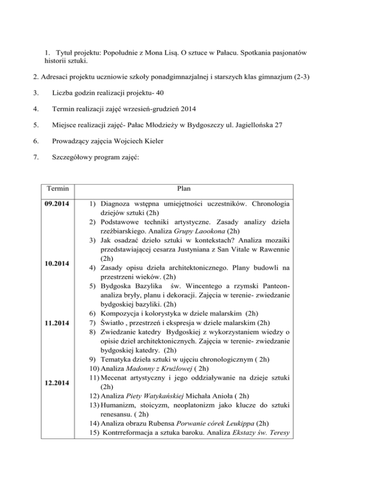 1. Tytuł projektu: Popołudnie z Mona Lisą. O sztuce w Pałacu. Spotkania pasjonatów historii sztuki. 2. Adresaci projektu uczniowie szkoły ponadgimnazjalnej i starszych klas gimnazjum (2-3) 3. Liczba godzin realizacji projektu- 40 4. Termin realizacji zajęć wrzesień-grudzień 2014 5. Miejsce realizacji zajęć- Pałac Młodzieży w Bydgoszczy ul. Jagiellońska 27 6. Prowadzący zajęcia Wojciech Kieler 7. Szczegółowy program zajęć: Termin 09.2014 10.2014 11.2014 12.2014 Plan 1) Diagnoza wstępna umiejętności uczestników. Chronologia dziejów sztuki (2h) 2) Podstawowe techniki artystyczne. Zasady analizy dzieła rzeźbiarskiego. Analiza Grupy Laookona (2h) 3) Jak osadzać dzieło sztuki w kontekstach? Analiza mozaiki przedstawiającej cesarza Justyniana z San Vitale w Rawennie (2h) 4) Zasady opisu dzieła architektonicznego. Plany budowli na przestrzeni wieków. (2h) 5) Bydgoska Bazylika św. Wincentego a rzymski Panteonanaliza bryły, planu i dekoracji. Zajęcia w terenie- zwiedzanie bydgoskiej bazyliki. (2h) 6) Kompozycja i kolorystyka w dziele malarskim (2h) 7) Światło , przestrzeń i ekspresja w dziele malarskim (2h) 8) Zwiedzanie katedry Bydgoskiej z wykorzystaniem wiedzy o opisie dzieł architektonicznych. Zajęcia w terenie- zwiedzanie bydgoskiej katedry. (2h) 9) Tematyka dzieła sztuki w ujęciu chronologicznym ( 2h) 10) Analiza Madonny z Krużlowej ( 2h) 11) Mecenat artystyczny i jego oddziaływanie na dzieje sztuki (2h) 12) Analiza Piety Watykańskiej Michała Anioła ( 2h) 13) Humanizm, stoicyzm, neoplatonizm jako klucze do sztuki renesansu. ( 2h) 14) Analiza obrazu Rubensa Porwanie córek Leukippa (2h) 15) Kontrreformacja a sztuka baroku. Analiza Ekstazy św. Teresy Berniniego (2h) 16) Rembrandt o synu marnotrawnym- zwiedzanie wystawy dzieł sztuki z kolekcji Książąt Czartoryskich w Toruńskim Ratuszu połączone ze zwiedzaniem gotyckich zabytków Torunia (6h) 17) Rokokowy hedonizm- analiza Huśtawki Fragonarda ( 2h) 18) Eskapizm XIX stulecia-Analiza Wędrowca w morzu chmur Friedricha i Pijących Absynt Degasa (2h) Dodatkowo podczas większości zajęć przeprowadzane będą testy typu olimpijskiego, badające przekrojowo wiedzę uczniów. Testy te będą rozwiązywane wspólnie i ilustrowane reprodukcjami dzieł. Wszyscy uczestnicy zaopatrzeni zostaną w materiały kserograficzne i płyty CD zawierające niezbędne materiały dydaktyczne i zbiór wymaganych programem zajęć dzieł. Konkretne terminy zajęć zostaną określone w pierwszym tygodniu września, po ustaleniu planów zajęć lekcyjnych w szkołach. 8. Zasady rekrutacji do grupy - Rekrutacja odbędzie się na podstawie testu sprawdzającego zainteresowani sztuką i elementarną wiedzę z dziedzin humanistycznych, zawierającego 10 pytań zamkniętych i otwartych.