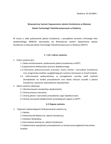 Świdnica, 10.10.2009 r. Wewnętrzny System Zapewnienia Jakości Kształcenia w Wyższej Szkole Technologii Teleinformatycznych w Świdnicy W trosce o stałe podnoszenie jakości kształcenia, z początkiem semestru zimowego roku akademickiego 2009/10, wprowadza się Wewnętrzny System Zapewnienia Jakości Kształcenia w Wyższej Szkole Technologii Teleinformatycznych w Świdnicy (WSTT). § 1 Cel i zakres systemu 1. Celem systemu jest: 1.1.Stałe monitorowanie i podnoszenie jakości kształcenia w WSTT, 1.2.Zapewnienie efektywności procesu dydaktycznego, 1.3.Tworzenie jednoznacznych procedur oceny metod i warunków kształcenia oraz programów studiów uwzględniających systemy stosowane w innych krajach, 1.4. Informowanie społeczeństwa, w szczególności uczniów szkół średnich (kandydatów na studia) pracodawców oraz władz różnych szczebli o jakości kształcenia i poziomie wykształcenia absolwentów. 2. Zakres systemu obejmuje: 2.1. Monitorowanie standardów akademickich, 2.2. Ocenę procesu nauczania, 2.3. Ocenę jakości i warunków prowadzenia zajęć dydaktycznych, 2.4. Ocenę nauczycieli akademickich prowadzących zajęcia w WSTT. § 2 Organy systemu 1. Organami zapewniającymi funkcjonowanie systemu są: 1.1. Rektor, 1.2. Pełnomocnik Rektora ds. Jakości Kształcenia, 1.3. Dziekani Wydziałów, 1.4. Kierunkowe Komisje ds. Jakości Kształcenia, 1.5. Opiekunowie specjalności prowadzonych w ramach poszczególnych kierunków studiów. 2. Rektor WSTT jest odpowiedzialny za zapewnienie wysokiej jakości kształcenia w WSTT i działa przy pomocy Pełnomocnika Rektora ds. Jakości Kształcenia. 3. Pełnomocnika Rektora ds. Jakości Kształcenia powołuje Rektor spośród nauczycieli akademickich zatrudnionych w WSTT po zasięgnięciu opinii Senatu. 4. Zakres działania Pełnomocnika Rektora ds. Jakości Kształcenia obejmuje: 4.1. Stałe monitorowanie jakości kształcenia na poszczególnych Wydziałach i kierunkach studiów, 4.2. Koordynowanie prac związanych z oceną procesu nauczania, 4.3. Koordynowanie prac związanych z oceną jakości prowadzenia zajęć dydaktycznych, 4.4. Koordynowanie prac związanych z oceną nauczycieli akademickich, 4.5. Koordynowanie prac związanych z informowaniem społeczeństwa o jakości kształcenia, 4.6. Składanie raz w roku sprawozdań z funkcjonowania systemu Senatowi WSTT. 5. Nadzór nad procesami zapewnienia jakości kształcenia i weryfikacji jego efektów na kierunku studiów sprawuje Dziekan Wydziału, na którym kierunek ten jest prowadzony. W szczególności do zadań Dziekana należy: 5.1. Stałe monitorowanie zgodności planu i programu studiów oraz sylabusów z obowiązującymi standardami kształcenia, 5.2. Stałe monitorowanie spójności treści programowych poszczególnych przedmiotów na podstawie analizy sylabusów, 5.3. Organizacja hospitacji zajęć, 5.4. Organizacja przeprowadzania ankiet wśród studentów i ich analiza, 5.5. Badania opinii przedstawicieli pracodawców, 5.6.Zbieranie uwag i wniosków przekazanych przez studentów, w szczególności przez organy samorządu studenckiego, 5.7.Przekazywanie wyników obserwacji oraz podjętych działań Pełnomocnikowi Rektora ds. Jakości Kształcenia. 6. Część lub całość obowiązków Dziekana w zakresie pkt. 5.1 ‐ 5.6. może być za zgodą Rektora przekazana Pełnomocnikowi Rektora ds. Jakości Kształcenia. 7. Dziekan może powołać opiekunów specjalności prowadzonych na danym kierunku studiów. 8. Do obowiązków opiekuna specjalności należy monitorowanie jakości kształcenia w zakresie wymienionym w p. 5.1 i 5.2 w ramach specjalności dydaktycznej będącej pod jego opieką. 9. Opiekunowie wszystkich specjalności prowadzonych na danym kierunku studiów (jeżeli zostaną powołani przez Dziekana) tworzą Kierunkową Komisję ds. Jakości Kształcenia. 10. Kierunkowa Komisja ds. Jakości Kształcenia wspomaga działania Dziekana i pełnomocnika Rektora ds. Jakości Kształcenia przekazując im swoje obserwacje oraz sugestie działań mających na celu stałe podnoszenie jakości kształcenia. § 3 Monitorowanie i ocena jakości kształcenia 1. Monitorowanie jakości kształcenia na poszczególnych wydziałach i kierunkach studiów polega na systematycznej analizie i ocenie: 1.1.Kadry nauczającej, 1.2.Zgodności programów nauczania ze standardami nauczania, 1.3.Zgodności obsady zajęć z specjalnością naukową kadry nauczającej. 2. Oceny procesu nauczania dokonuje się na podstawie dokumentacji danego kierunku studiów i specjalności, na którą składają się: 2.1.Program nauczania, 2.2.Plan studiów, 2.3.Sylwetka absolwenta, 2.4.Sylabusy poszczególnych przedmiotów, 2.5.System punktowy ECTS, 2.6.Wymagania stawiane pracom dyplomowym, 2.7.Wymagania egzaminacyjne. 3. Ocena jakości prowadzenia zajęć dydaktycznych odbywa się na podstawie: 3.1.Oceny zgodności merytorycznej treści poszczególnych przedmiotów ze standardami nauczania i programem nauczania, 3.2.Oceny warunków realizacji kształcenia w zakresie infrastruktury dydaktycznej oraz dostępności materiałów dydaktycznych dla studentów. 3.3.Hospitacji zajęć dydaktycznych, 3.4. Ankietyzacji zajęć dydaktycznych. § 4 Hospitacje i ankietyzacje zajęć dydaktycznych 1. Hospitacje zajęć dydaktycznych dotyczą wszystkich nauczycieli akademickich i powinny być przeprowadzane przez doświadczonych nauczycieli akademickich, uznanych dydaktyków. 2. Hospitacje zajęć dydaktycznych przeprowadza się okresowo. Każdy nauczyciel akademicki powinien być hospitowany nie rzadziej niż jednokrotnie w okresie 4 lat. 3. Z przeprowadzonych hospitacji zajęć sporządza się protokoły. Wzór protokołu hospitacji zajęć stanowi Załącznik 1. 4. Protokół hospitacji przekazywany jest w trybie poufnym na ręce Pełnomocnika Rektora ds. Jakości Kształcenia. 6. Osoba przeprowadzająca hospitację zajęć ma obowiązek przedstawić wnioski z niej wynikające hospitowanemu nauczycielowi ak