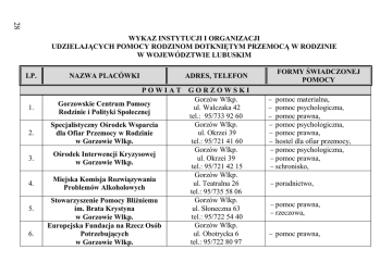 28 WYKAZ INSTYTUCJI I ORGANIZACJI UDZIELAJĄCYCH POMOCY RODZINOM DOTKNIĘTYM PRZEMOCĄ W RODZINIE W WOJEWÓDZTWIE LUBUSKIM LP. 1. 2. 3. 4. 5. 6. NAZWA PLACÓWKI ADRES, TELEFON POWIAT GORZOWSKI Gorzów Wlkp. Gorzowskie Centrum Pomocy ul. Walczaka 42 Rodzinie i Polityki Społecznej tel.: 95/733 92 60 Gorzów Wlkp. Specjalistyczny Ośrodek Wsparcia ul. Okrzei 39 dla Ofiar Przemocy w Rodzinie tel.: 95/721 41 60 w Gorzowie Wlkp. Gorzów Wlkp. Ośrodek Interwencji Kryzysowej ul. Okrzei 39 w Gorzowie Wlkp. tel.: 95/721 42 15 Gorzów Wlkp. Miejska Komisja Rozwiązywania ul. Teatralna 26 Problemów Alkoholowych tel.: 95/735 58 06 Gorzów Wlkp. Stowarzyszenie Pomocy Bliźniemu ul. Słoneczna 63 im. Brata Krystyna tel.: 95/722 54 40 w Gorzowie Wlkp. Gorzów Wlkp. Europejska Fundacja na Rzecz Osób ul. Obotrycka 6 Potrzebujących tel.: 95/722 80 97 w Gorzowie Wlkp. FORMY ŚWIADCZONEJ POMOCY pomoc materialna, pomoc psychologiczna, pomoc prawna, pomoc psychologiczna, pomoc prawna, hostel dla ofiar przemocy, pomoc psychologiczna, pomoc prawna, schronisko, poradnictwo, pomoc prawna, rzeczowa, pomoc prawna, 7. Ośrodek Wsparcia Rodziny w Gorzowie Wlkp. 8. Ośrodek Pomocy Społecznej w Witnicy 9. Ośrodek Pomocy Społecznej w Bogdańcu 10. Ośrodek Pomocy Społecznej w Kłodawie 11. Ośrodek Pomocy Społecznej w Deszcznie 12. Ośrodek Pomocy Społecznej w Lubiszynie 13. Ośrodek Pomocy Społecznej w Kostrzynie 14. Komenda Miejska Policji w Gorzowie Wlkp. 15. Komisariat Policji I Gorzów Wlkp. ul. K. Wielkiego 42 tel.: 95/720 16 42 Witnica ul. Rutkowskiego 9 tel.: 95/751 51 83 Bogdaniec ul. Leśna tel.: 95/751 00 61 Kłodawa ul. Kościelna 10 tel.: 95/721 66 63 Deszczno 23a tel.: 95/728 76 59 Lubiszyn ul. Myśliborska 9 tel.: 95/727 71 44 Kostrzyn n/O ul. Niepodległości 17 tel.: 95/752 30 33 Gorzów Wlkp. ul. Kard. Wyszyńskiego 122 tel.: 95/738 25 11 Telefon Zaufania 95/721 25 60 Gorzów Wlkp. pomoc psychologiczna, poradnictwo, pomoc materialna, poradnictwo, zgłoszenie przemocy w rodzinie, interwencja wobec przemocy w rodzinie, pomoc prawna, poradnictwo, 29 30 ul. Obotrycka 14 tel.: 95/738 21 11 Gorzów Wlkp. Komisariat Policji II ul. Kwiatowa 10 w Gorzowie Wlkp. tel.: 95/738 23 11 Witnica Komisariat Policji ul. Rutkowskiego 41 w Witnicy tel.: 95/751 72 11 Kostrzyn Komisariat Policji ul. Jana Pawła II 64 w Kostrzynie tel.: 95/721 04 11 Gorzów Wlkp. ul. Moniuszki 2 Prokuratura Rejonowa tel.: 95/739 22 09 POWIAT ZIELONOGÓRSKI w Gorzowie Wlkp. 16. 17. 18. 19. zgłoszenie przemocy/znęcania w rodzinie, programy korekcyjno- 1. Powiatowe Centrum Pomocy w Rodzinie im. Jana Pawła II w Zielonej Górze Zielona Góra ul. Podgórna 5 tel.: 68/452 75 90 tel.: 68/452 75 51 edukacyjne dla sprawców przemocy, wywiady w rodzinach zastępczych oraz gdzie została ograniczona władza rodzicielska, poradnictwo, Ośrodek Interwencji 2. Terenowy Komitet Ochrony Praw Dziecka oraz Ośrodek Interwencji Kryzysowej w Zielonej Górze 3. Lubuski Ośrodek Profilaktyki i Terapii dla Osób Uzależnionych i Współuzależnionych od Narkotyków w Zielonej Górze 4. Towarzystwo Integracji Społecznej w Zielonej Górze 5. Towarzystwo Przyjaciół Dzieci w Zielonej Górze 6. Lubuskie Stowarzyszenie na Rzecz Zielona Góra ul. Piaskowa 9e tel.: 68/324 49 00 telefon zaufania: 68/328 08 63 czynny całodobowo Kryzysowej z 22 miejscami hostelowymi dla kobiet i dzieci, mieszkania chronione, mediacje rodzinne, bezpłatne poradnictwo prawne, psychologiczne, psychoterapie (indywidualne i w grupie), grupa profilaktyczna dla dzieci, Zielona Góra ul. Jelenia 1a tel.: 68/453 20 00 poradnictwo, udzielanie informacji, psychoterapia, badania psychologiczne, Zielona Góra ul. Drzewna 13 tel.: 68/327 18 63 Zielona Góra ul. Reja 3/1 tel.: 68/324 14 74 tel.: 68/320 27 26 Zielona Góra udzielanie informacji, szkolenia mediatorów, wsparcie psychologiczne, udzielanie informacji, poradnictwo, kierowanie do specjalistycznych instytucji, porady prawne, 31 32 Kobiet „BABA” w Zielonej Górze 7. 8. 9. 10. Miejski Ośrodek Pomocy Społecznej w Zielonej Górze Poradnia Zdrowia Psychicznego Poradnia Odwykowa – alkohol Poradnia Odwykowa – środki psychoaktywne Poradnia neurologiczna Poradnictwo Psychologiczne w Zielonej Górze Wojewódzki Ośrodek Terapii Uzależnienia i Współuzależnienia od Alkoholu w Zielonej Górze Biuro Pełnomocnika oraz Miejska Komisja ds. Rozwiązywania Problemów ul. Stary Rynek 17 tel.: 68/454 92 32 tel.: 692 064 061 Zielona Góra ul. Anieli Krzywoń 2 tel.: 68/323 69 00 Zielona Góra ul. Zamenhofa 27/19 tel.: 68/327 14 63 porady psychologiczne, udzielanie informacji, poradnictwo, udzielanie informacji, pomoc materialna, kierowanie do specjalistycznych placówek, monitorowanie rodzin, gdzie stwierdzono przemoc, wywiady środowiskowe w rodzinach, poradnictwo, poradnictwo psychologiczne, udzielanie informacji, psychoterapia ofiar, terapia sprawców (uzależnionych od alkoholu), Zielona Góra ul. Wazów 36 tel.: 68/325 79 17 Zielona Góra ul. Dworcowa 31/ 6 poradnictwo, udzielanie informacji, psychoterapia, psychoedukacja, poradnictwo, udzielanie informacji, terapia sprawców, Alkoholowych w Zielonej Górze 11. 12. 13. Zarząd Rejonowy Czerwonego Krzyża w Zielonej Górze Poradnia Psychologiczno Pedagogiczna w Zielonej Górze Gminny Ośrodek Pomocy Społecznej w Zielonej Górze 14. Ośrodek Pomocy Społecznej w Czerwieńsku 15. Miejsko-Gminny Ośrodek Pomocy Społecznej w Nowogrodzie Bobrzańskim 16. Ośrodek Pomocy Społecznej tel.: 68/327 29 28 68/327 05 18 Zielona Góra ul. Jedności 22b tel.: 68/325 38 12 Zielona Góra ul. Drzewna 13 tel.: 68/3241695 Zielona Góra ul. Dąbrowskiego 41 tel.: 68/475 56 55 tel.: 68/475 56 57 tel.: 68/475 56 56/58 Czerwieńsk ul. Marii Rozwens 4 tel.: 068/321 90 92 tel.: 68/327 83 37 Nowogród Bobrzański ul. Ogrodowa 9 tel.: 68/327 68 43 tel. 694 708 176 Zabór terapia ofiar, pomoc psychologiczna i prawna ofiarom przemocy w sytuacjach związanych z nadużywaniem alkoholu w rodzinie, poradnictwo, u
