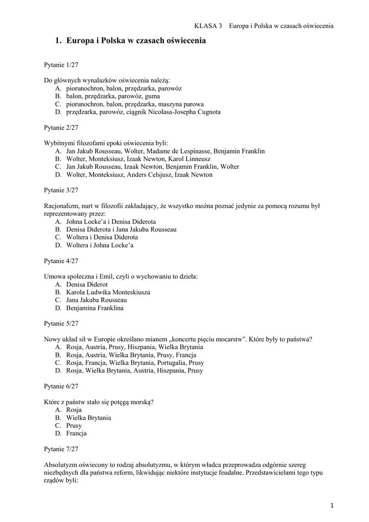 KLASA 3 Europa i Polska w czasach oświecenia 1. Europa i Polska w czasach oświecenia Pytanie 1/27 Do głównych wynalazków oświecenia należą: A. piorunochron, balon, przędzarka, parowóz B. balon, przędzarka, parowóz, guma C. piorunochron, balon, przędzarka, maszyna parowa D. przędzarka, parowóz, ciągnik Nicolasa-Josepha Cugnota Pytanie 2/27 Wybitnymi filozofami epoki oświecenia byli: A. Jan Jakub Rousseau, Wolter, Madame de Lespinasse, Benjamin Franklin B. Wolter, Monteksiusz, Izaak Newton, Karol Linneusz C. Jan Jakub Rousseau, Izaak Newton, Benjamin Franklin, Wolter D. Wolter, Monteksiusz, Anders Celsjusz, Izaak Newton Pytanie 3/27 Racjonalizm, nurt w filozofii zakładający, że wszystko można poznać jedynie za pomocą rozumu był reprezentowany przez: A. Johna Locke’a i Denisa Diderota B. Denisa Diderota i Jana Jakuba Rousseau C. Woltera i Denisa Diderota D. Woltera i Johna Locke’a Pytanie 4/27 Umowa społeczna i Emil, czyli o wychowaniu to dzieła: A. Denisa Diderot B. Karola Ludwika Monteskiusza C. Jana Jakuba Rousseau D. Benjamina Franklina Pytanie 5/27 Nowy układ sił w Europie określano mianem „koncertu pięciu mocarstw”. Które były to państwa? A. Rosja, Austria, Prusy, Hiszpania, Wielka Brytania B. Rosja, Austria, Wielka Brytania, Prusy, Francja C. Rosja, Francja, Wielka Brytania, Portugalia, Prusy D. Rosja, Wielka Brytania, Austria, Hiszpania, Prusy Pytanie 6/27 Które z państw stało się potęgą morską? A. Rosja B. Wielka Brytania C. Prusy D. Francja Pytanie 7/27 Absolutyzm oświecony to rodzaj absolutyzmu, w którym władca przeprowadza odgórnie szereg niezbędnych dla państwa reform, likwidując niektóre instytucje feudalne. Przedstawicielami tego typu rządów byli: 1 KLASA 3 Europa i Polska w czasach oświecenia A. B. C. D. Piotr I, Maria Teresa, Józef II Józef II, Katarzyna II, Fryderyk Wilhelm I Józef II, Katarzyna II, Fryderyk II Fryderyk Wilhelm I, Fryderyk II, Józef II Pytanie 8/27 W Austrii w XVIII wieku panowała dynastia: A. Romanowów B. Habsburgów C. Hohenzollernów D. Sasów Pytanie 9/27 Na mocy pokoju w Karłowicach w 1699 Polska: A. straciła Inflanty B. otrzymała Mołdawię C. odzyskała Ukrainę i Podole D. straciła Ukrainę i Podole Pytanie 10/27 Określenie Polska nierządem stoi charakteryzuje panowanie: A. Stanisława Leszczyńskiego B. Augusta II Mocnego C. Augusta III Sasa D. Stanisława Augusta Pytanie 11/27 Określenie: Za króla Sasa jedz, pij i popuszczaj pasa, charakteryzuje panowanie: A. Stanisława Leszczyńskiego B. Augusta II Mocnego C. Augusta III Sasa D. Stanisława Augusta Pytanie 12/27 Familia to stronnictwo: A. Czartoryskich B. Potockich C. Poniatowskich D. Branickich Pytanie 13/27 Stanisław August Poniatowski panował w latach: A. 1763-1772 B. 1764-1798 C. 1764-1791 D. 1764-1795 Pytanie 14/27 Mikołaj Repnin był: A. dysydentem 2 KLASA 3 Europa i Polska w czasach oświecenia B. rosyjskim ambasadorem C. konfederatem D. barskim innowiercą Pytanie 15/27 Reformą oświaty miała zająć się Komisja Edukacji Narodowej. Skąd otrzymała fundusze? A. od jezuitów B. od carycy Katarzyny II C. od papieża D. od Stanisława Augusta Pytanie 16/27 Pierwszy rozbiór Polski miał miejsce: A. 5 sierpnia 1772 roku B. 12 grudnia 1771 roku C. 10 września 1772 roku D. 10 maja 1795 roku Pytanie 17/27 Kto próbował przerwać obrady sejmu rozbiorowego? A. Adam Poniński B. Mikołaj Repnin C. Tadeusz Rejtan D. Józef Pułaski Pytanie 18/27 Stanisław Konarski, wybitny reformator oświecenia założył: A. Korpus Kadetów B. Collegium Nobilium C. Komisję Edukacji Narodowej D. Towarzystwo do Ksiąg Elementarnych Pytanie 19/27 Komisja Edukacji Narodowej była: A. ministerstwem oświaty B. szkołą pijarską C. szkołą świecką D. organizacją nadzorującą szkoły miejskie Pytanie 20/27 Kto był sekretarzem Towarzystwa do Ksiąg Elementarnych zajmującego się m. in. opracowywaniem podręczników? A. Stanisław Konarski B. Grzegorz Piramowicz C. Stanisław Staszic D. Franciszek Bohomolec Pytanie 21/27 Który z wybitnych dramaturgów oświecenia stanisławowskiego założył w 1779 Teatr Narodowy? A. Julian Ursyn Niemcewicz 3 KLASA 3 Europa i Polska w czasach oświecenia B. Ignacy Krasicki C. Franciszek Zabłocki D. Wojciech Bogusławski Pytanie 22/27 Pierwsza w Polsce biblioteka publiczna to: A. Biblioteka Jagiellońska B. Biblioteka Ossolińskich C. Biblioteka Załuskich D. Biblioteka Narodowa Pytanie 23/27 Najwybitniejszym pisarzem polskiego oświecenia, autorem bajek, satyr, powieści, był: A. Franciszek Bohomolec B. Wojciech Bogusławski C. Ignacy Krasicki D. Stanisław Konarski Pytanie 24/27 Komisję Edukacji Narodowej założono w: A. 1766 roku B. 1773 roku C. 1775 roku D. 1747 roku Pytanie 25/27 Lorenz Mitzler de Kolof nie był: A. muzykologiem B. wydawcą C. fizykiem D. lekarzem Pytanie 26/27 Nowymi szkołami założonymi w czasach oświecenia stanisławowskiego były: A. Szkoła Rycerska i Collegium Nobilium B. Komisja Edukacji Narodowej i Collegium Nobilium C. Szkoła Główna Handlowa i Collegium Nobilium D. Korpus Kadetów i Szkoła Główna Handlowa Pytanie 27/27 Pierwszy numer „Monitora” ukazał się w: A. 1764 roku B. 1765 roku C. 1766 roku D. 1767 roku 4