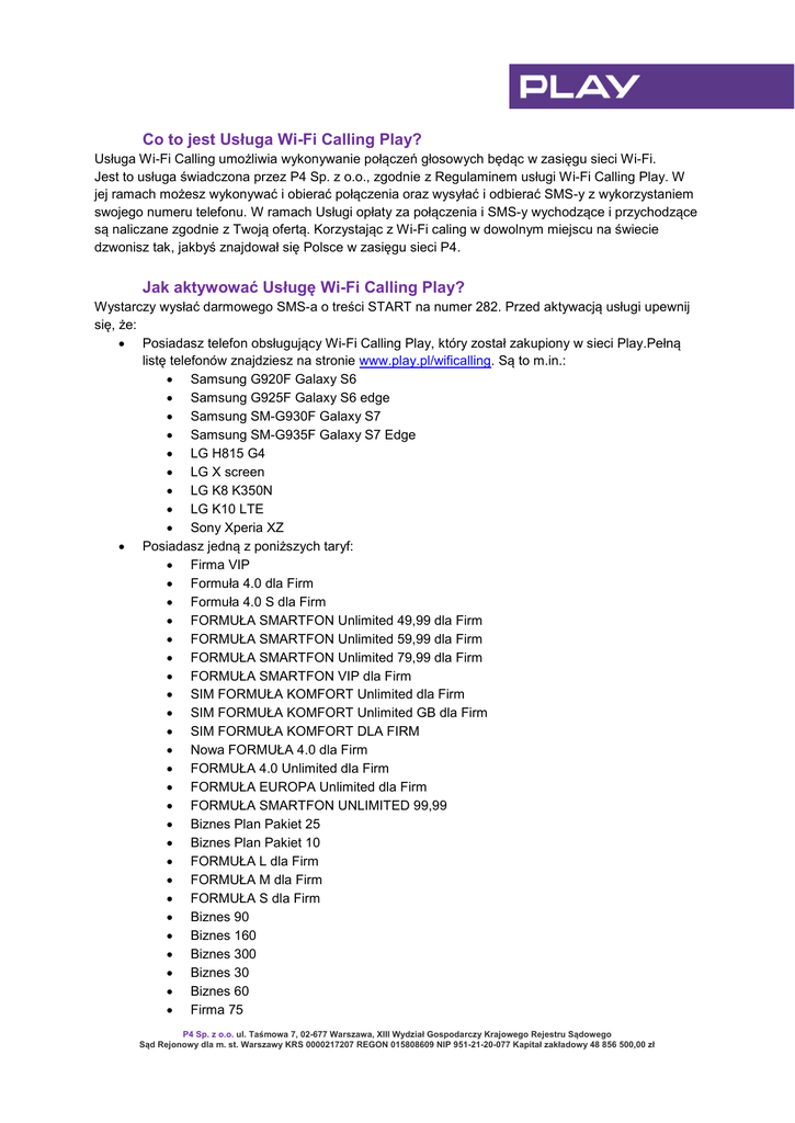 Co to jest Usługa Wi-Fi Calling Play? Usługa Wi-Fi Calling umożliwia wykonywanie połączeń głosowych będąc w zasięgu sieci Wi-Fi. Jest to usługa świadczona przez P4 Sp. z o.o., zgodnie z Regulaminem usługi Wi-Fi Calling Play. W jej ramach możesz wykonywać i obierać połączenia oraz wysyłać i odbierać SMS-y z wykorzystaniem swojego numeru telefonu. W ramach Usługi opłaty za połączenia i SMS-y wychodzące i przychodzące są naliczane zgodnie z Twoją ofertą. Korzystając z Wi-Fi caling w dowolnym miejscu na świecie dzwonisz tak, jakbyś znajdował się Polsce w zasięgu sieci P4. Jak aktywować Usługę Wi-Fi Calling Play? Wystarczy wysłać darmowego SMS-a o treści START na numer 282. Przed aktywacją usługi upewnij się, że: Posiadasz telefon obsługujący Wi-Fi Calling Play, który został zakupiony w sieci Play.Pełną listę telefonów znajdziesz na stronie www.play.pl/wificalling. Są to m.in.: Samsung G920F Galaxy S6 Samsung G925F Galaxy S6 edge Samsung SM-G930F Galaxy S7 Samsung SM-G935F Galaxy S7 Edge LG H815 G4 LG X screen LG K8 K350N LG K10 LTE Sony Xperia XZ Posiadasz jedną z poniższych taryf: Firma VIP Formuła 4.0 dla Firm Formuła 4.0 S dla Firm FORMUŁA SMARTFON Unlimited 49,99 dla Firm FORMUŁA SMARTFON Unlimited 59,99 dla Firm FORMUŁA SMARTFON Unlimited 79,99 dla Firm FORMUŁA SMARTFON VIP dla Firm SIM FORMUŁA KOMFORT Unlimited dla Firm SIM FORMUŁA KOMFORT Unlimited GB dla Firm SIM FORMUŁA KOMFORT DLA FIRM Nowa FORMUŁA 4.0 dla Firm FORMUŁA 4.0 Unlimited dla Firm FORMUŁA EUROPA Unlimited dla Firm FORMUŁA SMARTFON UNLIMITED 99,99 Biznes Plan Pakiet 25 Biznes Plan Pakiet 10 FORMUŁA L dla Firm FORMUŁA M dla Firm FORMUŁA S dla Firm Biznes 90 Biznes 160 Biznes 300 Biznes 30 Biznes 60 Firma 75 P4 Sp. z o.o. ul. Taśmowa 7, 02-677 Warszawa, XIII Wydział Gospodarczy Krajowego Rejestru Sądowego Sąd Rejonowy dla m. st. Warszawy KRS 0000217207 REGON 015808609 NIP 951-21-20-077 Kapitał zakładowy 48 856 500,00 zł Firma 100 Firma 150 Biznes Plan Pakiet Unlimited FORMUŁA dla Firm SIM FORMUŁA BIZBOX FORMUŁA SOLO L SIM RODZINA SIM DUET FORMUŁA SOLO S FORMUŁA SOLO M Firma 25 Firma 55 Biznes Plan Pakiet FORMUŁA Unlimited 29,99 dla Firm FORMUŁA PLAY Unlimited dla Firm Jakie usługi są dostępne w ramach Usługi Wi-Fi Calling? Jeżeli jesteś w zasięgu sieci Wi-Fi, która ma dostęp do internetu możesz: Wykonywać i odbierać połączenia na terenie całego świata. Wysyłać i odbierać SMS-y na terenie całego świata. Czy i jakie występują opłaty za korzystanie z Usługi? Korzystanie z Wi-Fi Calling Play jest całkowicie darmowe. Opłaty za połączenia wychodzące i przychodzące oraz wiadomości SMS w roamingu międzynarodowym będą naliczane jak zwykłe połączenia głosowe oraz wiadomości SMS, zgodnie z Cennikiem właściwym dla Taryfy, którą posiadasz. Korzystając z Wi-Fi caling w dowolnym miejscu na świecie, dzwonisz tak, jakbyś znajdował się Polsce w zasięgu sieci P4. Czy mogę wysyłać wiadomości SMS i MMS w ramach Usługi Wi-Fi Calling Play? Można wysyłać i odbierać SMS będąc połączonym z siecią Wi-Fi. Wysyłanie lub odbieranie MMS-ów będzie odbywało się przez sieć komórkową P4 i będzie naliczane zgodnie z Cennikiem właściwym dla Taryfy, którą posiadasz. Co się stanie, jeśli utracę połączenie z siecią Wi-Fi podczas rozmowy przez Wi-Fi Calling? Takie połączenie zostanie przerwane. Nie chcemy Cie narażać na nieoczekiwane koszty. W ramach Usługi nie będzie dostępna funkcjonalność przełączania rozmowy pomiędzy siecią Wi-Fi, a siecią komórkową i odwrotnie. Na jakich portach działa Wi-Fi Calling w Play? Wi-Fi Calling w Play działa na portach UDP 500 oraz UDP 4500. Czy połączenia przez Wi-Fi Calling w Play są bezpieczne? Tak, to połączenia w standardzie non 3GPP access, które są podwójnie szfrowane. Połączenia są całkowicie bezpieczne mimo wykorzystywanych np.: publicznych hotspotów z dostępem do internetu. Co muszę zainstalować aby korzystać z Wi-Fi Calling Play? P4 Sp. z o.o. ul. Taśmowa 7, 02-677 Warszawa, XIII Wydział Gospodarczy Krajowego Rejestru Sądowego Sąd Rejonowy dla m. st. Warszawy KRS 0000217207 REGON 015808609 NIP 951-21-20-077 Kapitał zakładowy 48 856 500,00 zł Należy posiadać najnowsze oprogramowanie w telefonie, który spełnia warunki regulaminu Usługi WiFi Calling Play. Po poprawnej aktywacji usługi i po połączeniu się z dowolnym hotspotem Wi-Fi pojawi się nowa funkcja w telefonie Wi-Fi Calling. Specjalna ikona (słuchawka z Wi-Fi) na górnym pasku stanu poinformuje Cię, gdy telefon zaloguje się do sieci Wi-Fi. Od tego momentu można wykonywać połączenia oraz wysyłać SMS-y w ramach usługi Wi-Fi Calling Play. Więcej informacji znajdziesz w Instrukcji Wi-Fi Calling Play dostępnej na stronie www.play.pl/wificalling Na jakich telefonach dostępna jest Usługa Wi-Fi Calling Play? Pełną listę telefonów obsługujących Usługę Wi-Fi Calling Play znajdziesz na stronie www.play.pl/wificalling.Są to m.in.: Samsung G920F Galaxy S6 Samsung G925F Galaxy S6 edge Samsung SM-G930f Galaxy S7 Samsung SM-G935f Galaxy S7 Edge LG H815 G4 LG X screen LG K8 K350N LG K10 LTE Sony Xperia XZ Czy osoby, do których dzwonię korzystając z Wi-Fi Calling Play muszą mieć tę samą funkcję w telefonie? Nie, Osoby które wykonują połączenia do Ciebie oraz te, które odbierają połączenia od Ciebie nie muszą mieć takiej funkcji. Jak podłączyć się do sieci Wi-Fi? Aby sprawdzić możliwości Usługi Wi-Fi Calling Play włącz opcję Wi-Fi oraz wybór ustawienia automatycznego logowania do otwartych dostępów Wi-Fi lub Wi-Fi szyfrowanych, do których posiadasz hasła dostępu. Dlaczego na stronie www.play.pl/wificalling nie ma wszystkich telefonów, które obsługują Wi-Fi Calling? Każdy telefon posiadający Wi-Fi Calling jako wgraną funkcję przez producenta musi zostać dostosowany do indywidualnych ustawień danego opera