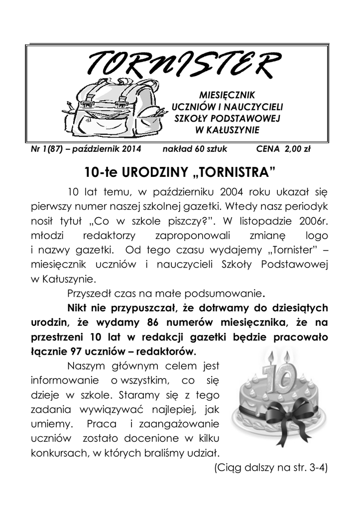 TORNISTER MIESIĘCZNIK UCZNIÓW I NAUCZYCIELI SZKOŁY PODSTAWOWEJ W KAŁUSZYNIE Nr 1(87) – październik 2014 nakład 60 sztuk CENA 2,00 zł 10-te URODZINY „TORNISTRA” 10 lat temu, w październiku 2004 roku ukazał się pierwszy numer naszej szkolnej gazetki. Wtedy nasz periodyk nosił tytuł „Co w szkole piszczy?”. W listopadzie 2006r. młodzi redaktorzy zaproponowali zmianę logo i nazwy gazetki. Od tego czasu wydajemy „Tornister” – miesięcznik uczniów i nauczycieli Szkoły Podstawowej w Kałuszynie. Przyszedł czas na małe podsumowanie. Nikt nie przypuszczał, że dotrwamy do dziesiątych urodzin, że wydamy 86 numerów miesięcznika, że na przestrzeni 10 lat w redakcji gazetki będzie pracowało łącznie 97 uczniów – redaktorów. Naszym głównym celem jest informowanie o wszystkim, co się dzieje w szkole. Staramy się z tego zadania wywiązywać najlepiej, jak umiemy. Praca i zaangażowanie uczniów zostało docenione w kilku konkursach, w których braliśmy udział. (Ciąg dalszy na str. 3-4) TORNISTER numer 1 (87) – październik 2014 SPIS TREŚCI: CO SIĘ DZIEJE W NASZEJ SZKOLE? 10-te urodziny „Tornistra” – s. 1, 3-4; Zabawa dla stałych czytelników „Tornistra” – s. 4; Kalendarz roku szk. 2014/2015 – s. 5-6; „Fleciki” w Bułgarii – s. 7-8; Sukces „Kasianiecki” – s.9; Goście z Ukrainy w Kałuszynie – s. 10-12; Uczestniczka Powstania Warszawskiego gościem gimnazjum w Kałuszynie – s. 12-14; Wyniki szkolnych biegów przełajowych – s. 15; Samorządy klasowe w roku sz. 2014/15 – s. 16-17; Rada Samorządu Uczniowskiego 2014/15–s. 17; WAKACJE 2014 Wakacje Ady – s. 18-19; Księżniczka w adidasach – s. 20-23; Kartka z wakacji z Wielkiej Brytanii – s. 24-28; Wielkopolska i Berlin zdobyte – s. 28-29; ZDANIEM NAUCZYCIELI Sonda na przerwie „Z kim chciałaby Pani/chciałby Pan spędzić choć minutę?”– s. 30-31; Zdaniem eksperta – str. 31; Pomocna dłoń – s. 32; Skojarzeniowa gra słów z p. Grażyną Michalską – s. 32-33; Ludzie listy piszą ...– s. 33-34; ZDANIEM UCZNIÓW Sonda na przerwie: „Najważniejszy dzień w Twoim życiu – s. 35; Pierwszaki mają głos – s. 36; Z czym kojarzy Ci się Twoja nauczycielka? – s. 37; Zeszyty uczniowskie s. 38-39; Stara, nowa redaktorka – s. 39; Za ścianą – s. 40; 3 pokolenia w „Tornistrze” – s. 41; Matematyka jest fajna – s. 42-43; 10 powodów… dlaczego warto chodzić do lasu – s. 44; INNE Czy wiesz, że… – s. 45; Kartka z kalendarza – s. 46; Top 10 gier na telefon – s. 47. 2 10-te URODZINY „TORNISTRA” (c.d. ze str. 1) W 2010r. w I Powiatowym Konkursie Gazetek Szkolnych promujących powiat miński nasza gazetka "Tornister" zdobyła I miejsce. W czerwcu 2009r. otrzymaliśmy tytuł laureata konkursu "Redaktor - Uczeń". Jest to konkurs organizowany przez "Tygodnik Siedlecki" we współpracy z siedlecką delegaturą Kuratorium Oświaty. W kolejnych czterech edycjach konkursu (rok szk. 2009/2010; 2010/2011; 2011/2012 i 2012/2013) również zdobyliśmy tytuł laureata. W 2012r. w Powiatowym Konkursie Gazetek Szkolnych "Młodzi Dziennikarze Papieżowi" (w kategorii: szkoły podstawowe kl. IV - VI) "Tornister" zdobył I miejsce. Oprócz pracy, ważny jest też odpoczynek i chwila wytchnienia. Dlatego co roku nasza redakcja starała się wyjeżdżać na wycieczki, gdzie łączyliśmy przyjemne z pożytecznym. Obserwowaliśmy pracę redaktorów różnych mediów – telewizyjnych, radiowych czy prasowych. TORNISTER numer 1 (87) – październik 2014 Stąd nasza obecność w siedzibie Telewizji Polskiej, w studiu Polskiego Radia – w Programie 1 i w Trójce, w Radiu „Podlasie”, w „Gazecie Wyborczej”, w „Tygodniku Siedleckim”, w „Super Expressie”, w „Świecie Seriali”, w wydawnictwie „Egmont Polska” i w drukarni „Agora”. Uczestniczyliśmy również w nagraniu programu „Tomasz Lis na żywo”. Co roku pojawiają się nowi redaktorzy, każdy numer to wielka niewiadoma, każda strona przynosi większą albo mniejszą niespodziankę. I właśnie tego sobie życzymy z okazji 10-tych urodzin – aby dalej Was zaskakiwać, zaciekawiać, aby chciało Wam się nas czytać. Miłej lektury! Izabela Borucińska ZABAWA DLA STAŁYCH CZYTELNIKÓW „TORNISTRA” Zachęcamy do czytania naszego miesięcznika. Przez cały rok w kolejnych numerach „Tornistra” będziemy drukować kupon. Wśród czytelników, którzy zbiorą wszystkie kupony, w czerwcu 2015r. zostaną rozlosowane 3 nagrody. Zapraszamy do zabawy. KUPON NR 1 (87) PAŹDZIERNIK 2014r. 4 TORNISTER numer 1 (87) – październik 2014 KALENDARZ ROKU SZKOLNEGO 2014/2015 1. 2. 3. 4. 5. Rozpoczęcie zajęć dydaktyczno wychowawczych Rocznica walk pod Kałuszynem - dzień wolny od zajęć dydaktycznych Spotkania klasowe z rodzicami uczniów Dzień Edukacji Narodowej - dzień wolny od zajęć dydaktycznych Zebranie Rady Rodziców 1 września 2014r. 12 września 2014r. wg terminarza wychowawcy klasy/ cały wrzesień 14 października 2014r. 15 października 2014r. godz. 17. 00 31 października 2014 r. 6. Dzień wolny od zajęć dydaktyczno wychowawczych (w ramach dni wolnych ustalonych przez dyrektora szkoły) 7. Dzień wolny od zajęć dydaktyczno wychowawczych (w ramach dni wolnych ustalonych przez dyrektora szkoły) 10 listopada 2014r. 8. Szkolenie Rady Pedagogicznej ,,Ochrona danych osobowych w szkole” Zebranie rodziców - ogólne z prelekcją, spotkania klasowe Przerwa świąteczna 19 listopada 2014r. godz. 14.00 26 listopada 2014r. godz. 17.00 22 grudnia 2014r. 1 stycznia 2015r. 13 stycznia 2015r. godz. 14.00 14 stycznia godz. 17.00 19 stycznia 1 lutego 2015 r. 9. 10. 11. 12. K1asyfikacja uczniów za I półrocze rada pedagogiczna Semestralne zebranie rodziców 13. Ferie zimowe 5 TORNISTER 14. 15. 16. numer 1 (87) – październik 2014 Szkolenie Rady Pedagogicznej ,,Jak przeciwdziałać agresji i przemocy w szkole” Rekolekcje wielkopostne 17. Sprawdzian szóstoklas