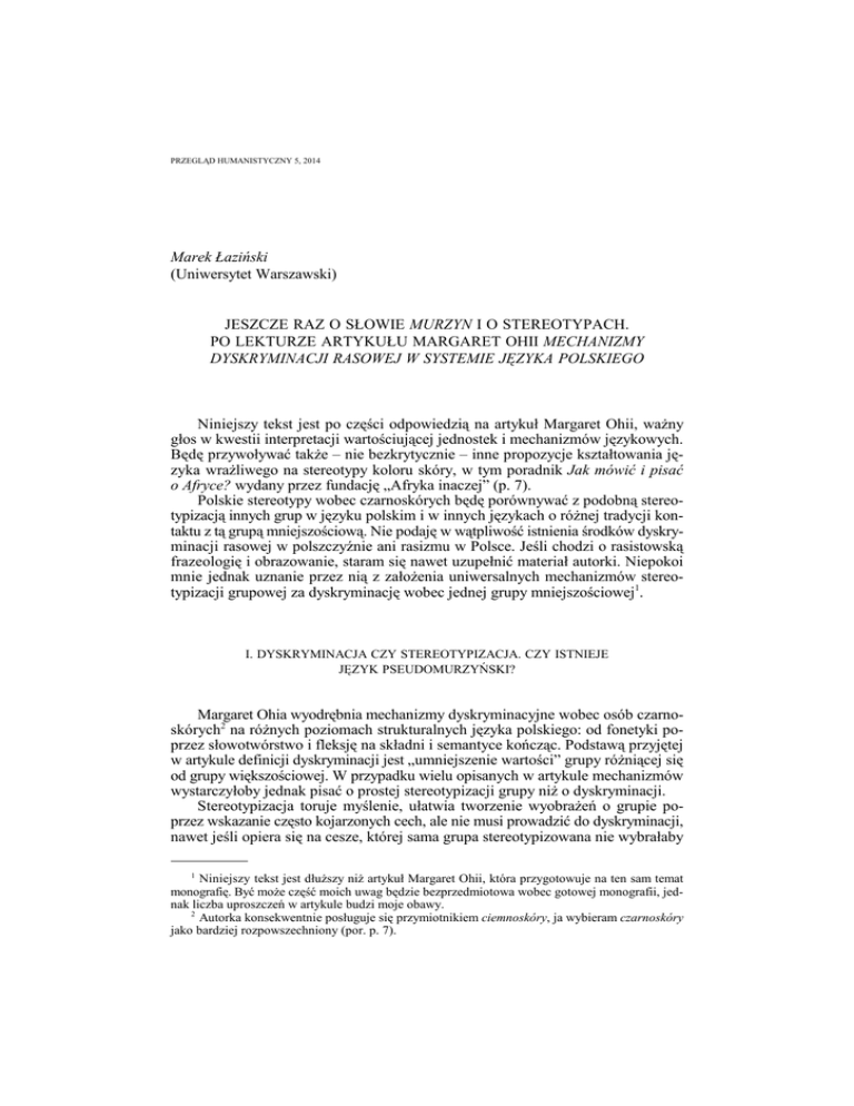 PRZEGLĄD HUMANISTYCZNY 5, 2014 Marek Łaziński (Uniwersytet Warszawski) JESZCZE RAZ O SŁOWIE MURZYN I O STEREOTYPACH. PO LEKTURZE ARTYKUŁU MARGARET OHII MECHANIZMY DYSKRYMINACJI RASOWEJ W SYSTEMIE JĘZYKA POLSKIEGO Niniejszy tekst jest po części odpowiedzią na artykuł Margaret Ohii, ważny głos w kwestii interpretacji wartościującej jednostek i mechanizmów językowych. Będę przywoływać także – nie bezkrytycznie – inne propozycje kształtowania języka wrażliwego na stereotypy koloru skóry, w tym poradnik Jak mówić i pisać o Afryce? wydany przez fundację „Afryka inaczej” (p. 7). Polskie stereotypy wobec czarnoskórych będę porównywać z podobną stereotypizacją innych grup w języku polskim i w innych językach o różnej tradycji kontaktu z tą grupą mniejszościową. Nie podaję w wątpliwość istnienia środków dyskryminacji rasowej w polszczyźnie ani rasizmu w Polsce. Jeśli chodzi o rasistowską frazeologię i obrazowanie, staram się nawet uzupełnić materiał autorki. Niepokoi mnie jednak uznanie przez nią z założenia uniwersalnych mechanizmów stereotypizacji grupowej za dyskryminację wobec jednej grupy mniejszościowej1. I. DYSKRYMINACJA CZY STEREOTYPIZACJA. CZY ISTNIEJE JĘZYK PSEUDOMURZYŃSKI? Margaret Ohia wyodrębnia mechanizmy dyskryminacyjne wobec osób czarnoskórych2 na różnych poziomach strukturalnych języka polskiego: od fonetyki poprzez słowotwórstwo i fleksję na składni i semantyce kończąc. Podstawą przyjętej w artykule definicji dyskryminacji jest „umniejszenie wartości” grupy różniącej się od grupy większościowej. W przypadku wielu opisanych w artykule mechanizmów wystarczyłoby jednak pisać o prostej stereotypizacji grupy niż o dyskryminacji. Stereotypizacja toruje myślenie, ułatwia tworzenie wyobrażeń o grupie poprzez wskazanie często kojarzonych cech, ale nie musi prowadzić do dyskryminacji, nawet jeśli opiera się na cesze, której sama grupa stereotypizowana nie wybrałaby 1 Niniejszy tekst jest dłuższy niż artykuł Margaret Ohii, która przygotowuje na ten sam temat monografię. Być może część moich uwag będzie bezprzedmiotowa wobec gotowej monografii, jednak liczba uproszczeń w artykule budzi moje obawy. 2 Autorka konsekwentnie posługuje się przymiotnikiem ciemnoskóry, ja wybieram czarnoskóry jako bardziej rozpowszechniony (por. p. 7). 128 Marek Łaziński jako autoidentyfikacji. Sam stereotyp nie jest sądem ani działaniem wobec innych. Autorka w ogóle nie pisze o stereotypach, każde uproszczone wyobrażenie, np. stereotypowe przedstawienie języka traktuje jak dyskryminację. Zdaniem autorki Polacy „wymyślili język alternatywny (pseudojęzyk), który przypisują osobom ciemnoskórym”, a „infantylizacja mowy osób ciemnoskórych może prowadzić do przypisania [im] niedojrzałości i «dziecinnej» emocjonalności, a w konsekwencji do odmowy lub ograniczenia udziału [...] w dyskursie publicznym”. Równie dobrze można by się obawiać, że stereotypizacja językowa Niemca jako tego, który mówi niezrozumiale, obecna zarówno w etymologii słowiańskiej nazwy tego narodu, jak też w mowie wielu bohaterów literackich czy filmowych, doprowadzi do wykluczenia mniejszości niemieckiej z dyskursu publicznego. Rosyjska potoczna nazwa Polaka pšek i czeska nazwa Pšonek pochodzące od częstej w naszym języku grupy spółgłoskowej nie automatyzują antypolskiego nastawienia sąsiadów. Wiele uwagi w artykule poświęcono poziomowi fonologicznemu języka. Wśród mechanizmów fonetycznych w „odtwarzaniu pseudojęzyka” Afryki wymienione są m.in. rytmizacja, rymy i reduplikacja spółgłosek wybuchowych. Można zapytać, czy konstruowanie pseudojęzyka jest potrzebne, ale jest faktem, że w żartach i w literaturze naśladujemy fonetycznie Francuzów, Włochów, Chińczyków czy Japończyków (nie różnicując między dwoma ostatnimi językami, czyli tworząc „pseudojęzyk dalekowschodni”). Dlaczego z tego mechanizmu mieliby być wyłączeni Afrykanie? Jeśli chcemy tworzyć wyobrażenie języków Afryki subsaharyjskiej albo nadać imiona bohaterom związanym z Afryką, to rzeczywiście często gromadzimy spółgłoski zwartowybuchowe, szczególnie połączenia -mb-. Jest to uzasadnione skojarzeniem z wieloma nazwami geograficznymi i nazwiskami, by wspomnieć tylko Zambię, Zimbabwe, Gambię, Mombasę3. Taki jest kulturowy kontekst imienia Tuwimowskiego Murzynka czy tytułowego bohatera piosenki zespołu Big Cyc z lat dziewięćdziesiątych. Można się zgodzić z tym, że wiersz Tuwima, niegdyś niewinny, jest dziś anachroniczny i stereotypizujący. Podobna dyskusja toczy się w sprawie piosenki Makumba (za którą na swym blogu przepraszał Krzysztof Skiba). Ale jeśli za strategię dyskryminującą uznamy sam fonetyczny kształt wymyślonego imienia, to za tak samo niebezpieczne trzeba by uznać każde obcojęzyczne wyobrażanie Polaka z nazwiskiem zawierającym spółgłoski szumiące i zakończonym na -ski. Wśród elementów „pseudojęzyka afrykańskiego” poza stereotypizacją fonetyczną wymieniono także użycie bezokolicznika zamiast form osobowych. Także ten zabieg, choć kojarzy się z językiem Kalego, jest mechanizmem uniwersalnym pokazującym, że ktoś źle mówi w języku nadawcy. Niemcy czy Rosjanie także używają bezokolicznika, żeby zaznaczyć, że ktoś, np. imigrant, źle mówi w ich języku. Użycie bezokolicznika w tej funkcji jest zapewne naśladowaniem uproszczonej angielszczyzny, w której formy osobowe i bezokoliczniki są często identyczne. Swoistą parodią angielskich zaimków osobowych podmiotowych i zależnych jest inny zabieg stereotypizujący język obcokrajowca, o którym autorka nie wspomina: 3 Nagromadzenie spółgłosek wybuchowych nie jest cechą wszystkich języków Afryki subsaharyjskiej, jednak potoczne skojarzenia fonetyczne oparte są na przeciętnej znajomości mapy Afryki. Jeszcze raz o słowie Mur
