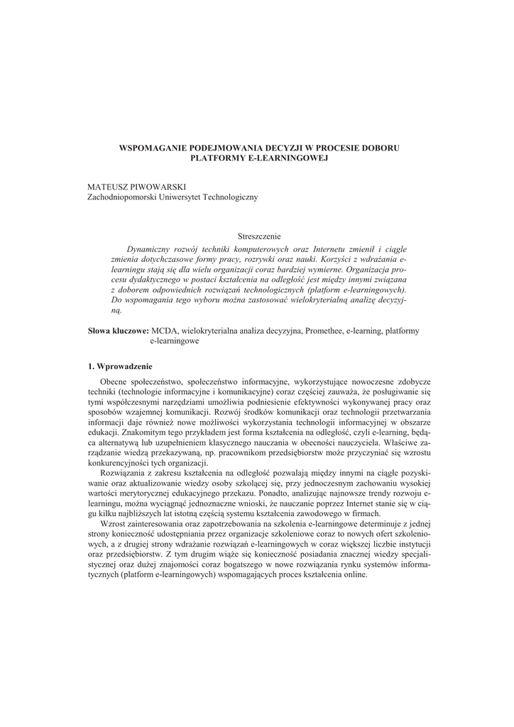 WSPOMAGANIE PODEJMOWANIA DECYZJI W PROCESIE DOBORU PLATFORMY E-LEARNINGOWEJ MATEUSZ PIWOWARSKI Zachodniopomorski Uniwersytet Technologiczny Streszczenie Dynamiczny rozwój techniki komputerowych oraz Internetu zmienił i cigle zmienia dotychczasowe formy pracy, rozrywki oraz nauki. Korzyci z wdraania elearningu staj si dla wielu organizacji coraz bardziej wymierne. Organizacja procesu dydaktycznego w postaci kształcenia na odległo jest midzy innymi zwizana z doborem odpowiednich rozwiza technologicznych (platform e-learningowych). Do wspomagania tego wyboru mona zastosowa wielokryterialn analiz decyzyjn. Słowa kluczowe: MCDA, wielokryterialna analiza decyzyjna, Promethee, e-learning, platformy e-learningowe 1. Wprowadzenie Obecne społeczestwo, społeczestwo informacyjne, wykorzystujce nowoczesne zdobycze techniki (technologie informacyjne i komunikacyjne) coraz czciej zauwaa, e posługiwanie si tymi współczesnymi narzdziami umoliwia podniesienie efektywnoci wykonywanej pracy oraz sposobów wzajemnej komunikacji. Rozwój rodków komunikacji oraz technologii przetwarzania informacji daje równie nowe moliwoci wykorzystania technologii informacyjnej w obszarze edukacji. Znakomitym tego przykładem jest forma kształcenia na odległo, czyli e-learning, bdca alternatyw lub uzupełnieniem klasycznego nauczania w obecnoci nauczyciela. Właciwe zarzdzanie wiedz przekazywan, np. pracownikom przedsibiorstw moe przyczynia si wzrostu konkurencyjnoci tych organizacji. Rozwizania z zakresu kształcenia na odległo pozwalaj midzy innymi na cigłe pozyskiwanie oraz aktualizowanie wiedzy osoby szkolcej si, przy jednoczesnym zachowaniu wysokiej wartoci merytorycznej edukacyjnego przekazu. Ponadto, analizujc najnowsze trendy rozwoju elearningu, mona wycign jednoznaczne wnioski, e nauczanie poprzez Internet stanie si w cigu kilku najbliszych lat istotn czci systemu kształcenia zawodowego w firmach. Wzrost zainteresowania oraz zapotrzebowania na szkolenia e-learningowe determinuje z jednej strony konieczno udostpniania przez organizacje szkoleniowe coraz to nowych ofert szkoleniowych, a z drugiej strony wdraanie rozwiza e-learningowych w coraz wikszej liczbie instytucji oraz przedsibiorstw. Z tym drugim wie si konieczno posiadania znacznej wiedzy specjalistycznej oraz duej znajomoci coraz bogatszego w nowe rozwizania rynku systemów informatycznych (platform e-learningowych) wspomagajcych proces kształcenia online. 80 Mateusz Piwowarski Wspomaganie podejmowania decyzji w procesie doboru platformy e-learningowej 2. Platformy e-learningowe Platforma e-learningowa to zbiór narzdzi, pozwalajcy na kompleksowe zarzdzanie szkoleniami na odległo. Do głównych zada takich systemów naley udostpnianie mechanizmów publikowania szkole w formie elektronicznej oraz sprawne zarzdzanie zarówno uytkownikami, jak i zasobami szkoleniowymi [1]. Obecnie na rynku jest dostpnych wiele platform szkoleniowych o rónej funkcjonalnoci oraz cenie. Najprostsze z nich pozwalaj na zainstalowanie pojedynczych kursów, prost administracj, ale cechuj si mał uytecznoci. Inne z kolei charakteryzuj si złoon funkcjonalnoci, zaspakajajc w znacznej mierze oczekiwania uytkowników, administratorów oraz twórców kursów e-learningowych. Generalnie wyrónia si trzy kategorie systemów informatycznych, tworzcych platformy dla nauczania zdalnego [2] (chocia mona si spotka ze znacznie bardziej szczegółow ich klasyfikacj [3]). S to: 1. Systemy klasy LMS (ang. Learning Management System), okrelane mianem platform LMS lub platform e-learningowych. Stanowi one zbiór zintegrowanego specjalistycznego oprogramowania, umoliwiajcego dostarczanie i administrowanie szkoleniami elektronicznymi, a take zarzdzanie samym procesem szkoleniowym (planowanie i organizacja nauki). 2. Systemy klasy LCMS (ang. Learning Content Management System), na które składa si wyspecjalizowane oprogramowanie do projektowania, tworzenia, modyfikowania oraz przechowywania zasobów dydaktycznych. Umoliwia ono równie (dziki odpowiedniej konstrukcji materiałów szkoleniowych) wielokrotne wykorzystywanie tych samych treci nauczania (learning content) i dostarczanie spersonalizowanych materiałów szkoleniowych w postaci obiektów szkoleniowych (learning objects). 3. Systemy klasy VCS (ang. Virtual Classroom System) umoliwiaj zarzdzanie i prowadzenie nauki na odległo w trybie synchronicznym. Udostpniaj one mechanizmy współpracy, komunikacji oraz dystrybucji wiedzy wraz z bezzwłocznym sprzeniem zwrotnym. Systemy LMS stanowi podstaw kadego szkolenia e-learningowego, gdy umoliwiaj uruchomianie przygotowanych kursów, ledzenie postpów w nauce słuchaczy, monitoruj efekty, postpy szkolenia, a take pozwalaj ocenia wykonywane zadania, wiczenia, testy, itp. Jedn z waniejszych cech zwizanych z funkcjonalnoci tych systemów jest to, czy taki system wspiera standardy opisu kursów e-learningowych. Obecnie na wiecie istnieje kilka organizacji zajmujcych si tworzeniem propozycji takich standardów. S to: AICC (ang. Aviation Industry CBT Committee), IEEE Learning Technology Standards Committee, IMS Global Consortium, Advanced Distributed Learning (ADL) – SCORM (ang. Sharable Content Object Reference Model). Generalnie SCORM nie tworzy nowych standardów, a jedynie adoptuje w sobie najlepsze rozwizania pochodzce z innych standardów. Oznacza to, e wiele z zalece SCORM pokrywa si z tym, co proponuje AICC czy IMS. Dziki takiemu podejciu SCORM jest obecnie najszerzej wpieranym standardem [4]. Dobór konkretnej platformy e-learningowej (LMS) do indywidualnych wymogów organizacji szkoleniowej nie jest zadaniem prostym i łatwym. Istnieje wiele rónych platform o rónym stopniu złoonoci, moliwoci zaadoptowania do własnym potrzeb, rónych kosztach utrzymania systemu i jeszcze wielu innych aspektach, które naley rozway przed podjciem decyzji o jej wyborze. Do najbardziej znanych komercyjnych platform LMS zalicza si: WBTServer, Oracle iLearning, LEO. Take wród rozwiza udostpnianych