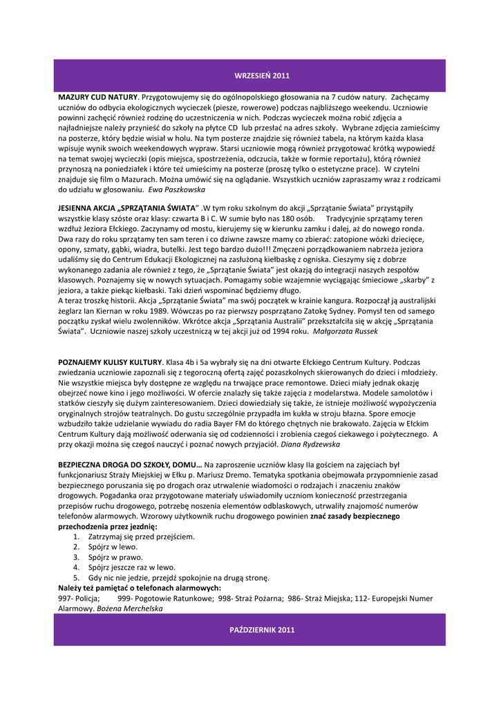 WRZESIEŃ 2011 MAZURY CUD NATURY. Przygotowujemy się do ogólnopolskiego głosowania na 7 cudów natury. Zachęcamy uczniów do odbycia ekologicznych wycieczek (piesze, rowerowe) podczas najbliższego weekendu. Uczniowie powinni zachęcić również rodzinę do uczestniczenia w nich. Podczas wycieczek można robić zdjęcia a najładniejsze należy przynieść do szkoły na płytce CD lub przesłać na adres szkoły. Wybrane zdjęcia zamieścimy na posterze, który będzie wisiał w holu. Na tym posterze znajdzie się również tabela, na którym każda klasa wpisuje wynik swoich weekendowych wypraw. Starsi uczniowie mogą również przygotować krótką wypowiedź na temat swojej wycieczki (opis miejsca, spostrzeżenia, odczucia, także w formie reportażu), którą również przynoszą na poniedziałek i które też umieścimy na posterze (proszę tylko o estetyczne prace). W czytelni znajduje się film o Mazurach. Można umówić się na oglądanie. Wszystkich uczniów zapraszamy wraz z rodzicami do udziału w głosowaniu. Ewa Paszkowska JESIENNA AKCJA „SPRZĄTANIA ŚWIATA” .W tym roku szkolnym do akcji „Sprzątanie Świata” przystąpiły wszystkie klasy szóste oraz klasy: czwarta B i C. W sumie było nas 180 osób. Tradycyjnie sprzątamy teren wzdłuż Jeziora Ełckiego. Zaczynamy od mostu, kierujemy się w kierunku zamku i dalej, aż do nowego ronda. Dwa razy do roku sprzątamy ten sam teren i co dziwne zawsze mamy co zbierać: zatopione wózki dziecięce, opony, szmaty, gąbki, wiadra, butelki. Jest tego bardzo dużo!!! Zmęczeni porządkowaniem nabrzeża jeziora udaliśmy się do Centrum Edukacji Ekologicznej na zasłużoną kiełbaskę z ogniska. Cieszymy się z dobrze wykonanego zadania ale również z tego, że „Sprzątanie Świata” jest okazją do integracji naszych zespołów klasowych. Poznajemy się w nowych sytuacjach. Pomagamy sobie wzajemnie wyciągając śmieciowe „skarby” z jeziora, a także piekąc kiełbaski. Taki dzień wspominać będziemy długo. A teraz troszkę historii. Akcja „Sprzątanie Świata” ma swój początek w krainie kangura. Rozpoczął ją australijski żeglarz Ian Kiernan w roku 1989. Wówczas po raz pierwszy posprzątano Zatokę Sydney. Pomysł ten od samego początku zyskał wielu zwolenników. Wkrótce akcja „Sprzątania Australii” przekształciła się w akcję „Sprzątania Świata”. Uczniowie naszej szkoły uczestniczą w tej akcji już od 1994 roku. Małgorzata Russek POZNAJEMY KULISY KULTURY. Klasa 4b i 5a wybrały się na dni otwarte Ełckiego Centrum Kultury. Podczas zwiedzania uczniowie zapoznali się z tegoroczną ofertą zajęć pozaszkolnych skierowanych do dzieci i młodzieży. Nie wszystkie miejsca były dostępne ze względu na trwające prace remontowe. Dzieci miały jednak okazję obejrzeć nowe kino i jego możliwości. W ofercie znalazły się także zajęcia z modelarstwa. Modele samolotów i statków cieszyły się dużym zainteresowaniem. Dzieci dowiedziały się także, że istnieje możliwość wypożyczenia oryginalnych strojów teatralnych. Do gustu szczególnie przypadła im kukła w stroju błazna. Spore emocje wzbudziło także udzielanie wywiadu do radia Bayer FM do którego chętnych nie brakowało. Zajęcia w Ełckim Centrum Kultury dają możliwość oderwania się od codzienności i zrobienia czegoś ciekawego i pożytecznego. A przy okazji można się czegoś nauczyć i poznać nowych przyjaciół. Diana Rydzewska BEZPIECZNA DROGA DO SZKOŁY, DOMU… Na zaproszenie uczniów klasy IIa gościem na zajęciach był funkcjonariusz Straży Miejskiej w Ełku p. Mariusz Dremo. Tematyka spotkania obejmowała przypomnienie zasad bezpiecznego poruszania się po drogach oraz utrwalenie wiadomości o rodzajach i znaczeniu znaków drogowych. Pogadanka oraz przygotowane materiały uświadomiły uczniom konieczność przestrzegania przepisów ruchu drogowego, potrzebę noszenia elementów odblaskowych, utrwaliły znajomość numerów telefonów alarmowych. Wzorowy użytkownik ruchu drogowego powinien znać zasady bezpiecznego przechodzenia przez jezdnię: 1. Zatrzymaj się przed przejściem. 2. Spójrz w lewo. 3. Spójrz w prawo. 4. Spójrz jeszcze raz w lewo. 5. Gdy nic nie jedzie, przejdź spokojnie na drugą stronę. Należy też pamiętać o telefonach alarmowych: 997- Policja; 999- Pogotowie Ratunkowe; 998- Straż Pożarna; 986- Straż Miejska; 112- Europejski Numer Alarmowy. Bożena Merchelska PAŹDZIERNIK 2011 PASOWANIE PIERWSZOKLASISTÓW. 14 października 2011r. w obecności zaproszonych gości, grona pedagogicznego i rodziców wypowiedzieli te słowa uczniowie klas pierwszych naszej szkoły. Ten doniosły moment na pewno długo zostanie w ich pamięci. Niezwykłe emocje udzieliły się wszystkim. I choć główni aktorzy byli na początku trochę stremowani, to jednak szybko na ich buziach pojawiły się uśmiechy. Tradycyjnie po ślubowaniu wychowawcy klas i przedstawiciele rodziców podpisali Kontrakty Edukacyjne, a pierwszoklasiści zostali pasowani na uczniów wielkim ołówkiem i otrzymali pamiątkowe znaczki. Pani dyrektor Wanda Wojnowska oficjalnie przyjęła do grona uczniów Szkoły Podstawowej nr 4 im. prof. Władysława Szafera w Ełku niemal 100 pierwszoklasistów. Tegoroczna uroczystość przebiegała w scenerii pięknych Mazur, po których oprowadził pierwszaki niespodziewany gość. Duszek mazurskiej krainy opowiedział o swoim środowisku, pokazał jej piękno w wierszach i na zdjęciach. Przygotował też dla dzieci zadania. Uczniowie klas pierwszych wykazali się dojrzałością i gotowością do podjęcia nauki. Dowiedzieli się, że są najważniejsi w szkole, rozpoznali swoje panie po głosie, rozwiązali czytane przez rodziców zagadki, wspólnie zaśpiewali piosenkę. Każda klasa wylosowała też dla siebie literkę. Miłą niespodzianką były prezenty i słodki poczęstunek w salach. Wszystkim pierwszakom życzymy sukcesów w nauce, wspaniałych przyjaźni i wiele 