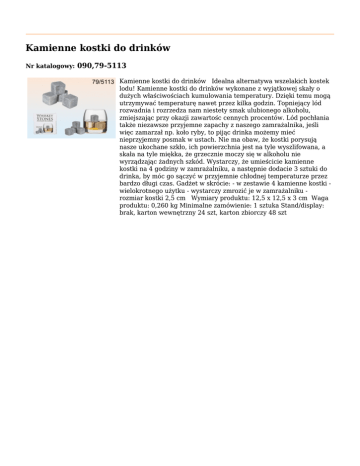 Kamienne kostki do drinków Nr katalogowy: 090,79-5113 Kamienne kostki do drinków Idealna alternatywa wszelakich kostek lodu! Kamienne kostki do drinków wykonane z wyjątkowej skały o dużych właściwościach kumulowania temperatury. Dzięki temu mogą utrzymywać temperaturę nawet przez kilka godzin. Topniejący lód rozwadnia i rozrzedza nam niestety smak ulubionego alkoholu, zmiejszając przy okazji zawartośc cennych procentów. Lód pochłania także niezawsze przyjemne zapachy z naszego zamrażalnika, jeśli więc zamarzał np. koło ryby, to pijąc drinka możemy mieć nieprzyjemny posmak w ustach. Nie ma obaw, że kostki porysują nasze ukochane szkło, ich powierzchnia jest na tyle wyszlifowana, a skała na tyle miękka, że grzecznie moczy się w alkoholu nie wyrządzając żadnych szkód. Wystarczy, że umieścicie kamienne kostki na 4 godziny w zamrażalniku, a następnie dodacie 3 sztuki do drinka, by móc go sączyć w przyjemnie chłodnej temperaturze przez bardzo długi czas. Gadżet w skrócie: - w zestawie 4 kamienne kostki wielokrotnego użytku - wystarczy zmrozić je w zamrażalniku rozmiar kostki 2,5 cm Wymiary produktu: 12,5 x 12,5 x 3 cm Waga produktu: 0,260 kg Minimalne zamówienie: 1 sztuka Stand/display: brak, karton wewnętrzny 24 szt, karton zbiorczy 48 szt