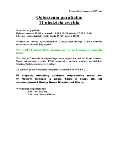 Dębno, dnia 14 czerwca 2015 roku Ogłoszenia parafialne 11 niedziela zwykła Msze św. w tygodniu: Dębno – wtorek 18:00, czwartek 18:00 i 18:30, sobota 17:00 i 18:00 Chrzan – poniedziałek 18:00, środa 19:00 i piątek 18:00 Wszystkim, którzy uczestniczyli w Uroczystości Bożego Ciała i oktawie składam serdecznie Bóg zapłać. We wtorek 30 czerwca 2015 r. organizowany jest rajd rowerowy – szczegóły poniżej W środę w Chrzanie przeżywać będziemy odpust ku czci św. Brata Alberta. Sumę odpustową o godz. 19:00 odprawi i kazanie wygłosi ks. dziekan Marian Brdyś, proboszcz z Cielczy. Za tydzień przed kościołem odbędzie się zbiórka na WT i KUL. W przyszłą niedzielę zostanie odprawiona msza św. w Nowym Mieście o godz. 14:00 z okazji 25. lat samorządności Gminy Nowe Miasto nad Wartą. W tygodniu wspominamy: 15.06. - bł. Jolantę 17.06. - św. Brata Alberta Intencje mszalne 15.06. - 21.06.2015 Poniedziałek 15.06. 18:00 + Stefan Grzebyszak – od córki Maryli z mężem i Jakubem Wtorek 16.06. 18:00 + Jadwiga Grzegorek – od bratowej Haliny, chrzesniaka Jacka, Marka i Krzysztofa z rodzinami Środa 17.06. ODPUST ŚW. BRATA ALBERTA 19:00 (suma odpustowa w Chrzanie) 1) za parafian 2) + Joanna Bandyk – od chrześniaków Piotra z Lgowa i Roberta Tomczaka z rodzinami, Tomczaków i Sobowcewów, Zygmunta i Zbigniewa Przysieckich z rodzinami, Idziaszków z Wolicy Nowej Czwartek 18.06. 18:00 + Marian Kowalski (z ok. urodzin) 18:30 (Dębno) – z ok. 40 r. ślubu Marii i Mariana z podziękowaniem Bogu za odebrane łaski i z prośbą o zdrowie i Bożą opiekę w rodzinie Piątek 19.06. 18:00 + Helena Czerniak – od Jolanty Michalskiej z rodz. Sobota 20.06. 17:00 (Dębno) – z ok. 20. r. ślubu Małgorzaty i Olka z prośbą o zdrowie i błogosławieństwo Boże na dalsze lata 18:00 – z ok. 25. r. ślubu z podziękowaniem Bogu za odebrane łaski i z prośbą o zdrowie i Bożą opiekę w rodzinie Niedziela 21.06. 8:00 + Stanisław Jędrzak (8. r. śm.) i zmarli rodzice 10:00 + Stanisława i Kazimierz Rapczyńscy 12:00 + Jan, Janina, Leon Robak, Marianna, Walenty, Jan, Barbara, Marta Fikus We wtorek 30 czerwca 2015 r. organizowany jest rajd rowerowy do Pogorzelicy przez Lgów i Szczonów, gdzie zatrzymamy się na krótki odpoczynek. W Lgowie i Pogorzelicy zwiedzimy kościoły i poznamy ich historię a następnie przeprawimy się promem przez Wartę do Nowej Wsi Podgórnej, gdzie będzie ognisko i posiłek. Chętni mogą zapisać się w zakrystii do 27 czerwca. Koszt wyjazdu 10 zł od osoby.
